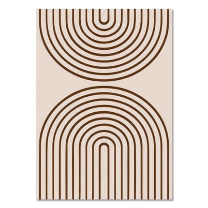 北欧ミニマルなリビング空間に飾られた、ブラウンラインのアーチパターン 抽象アート(A3サイズ相当)。
