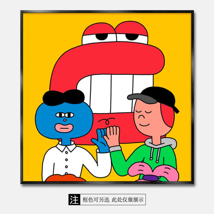 大きな口を開けたモンスターとカラフルなキャラクターが登場するポップなアート。