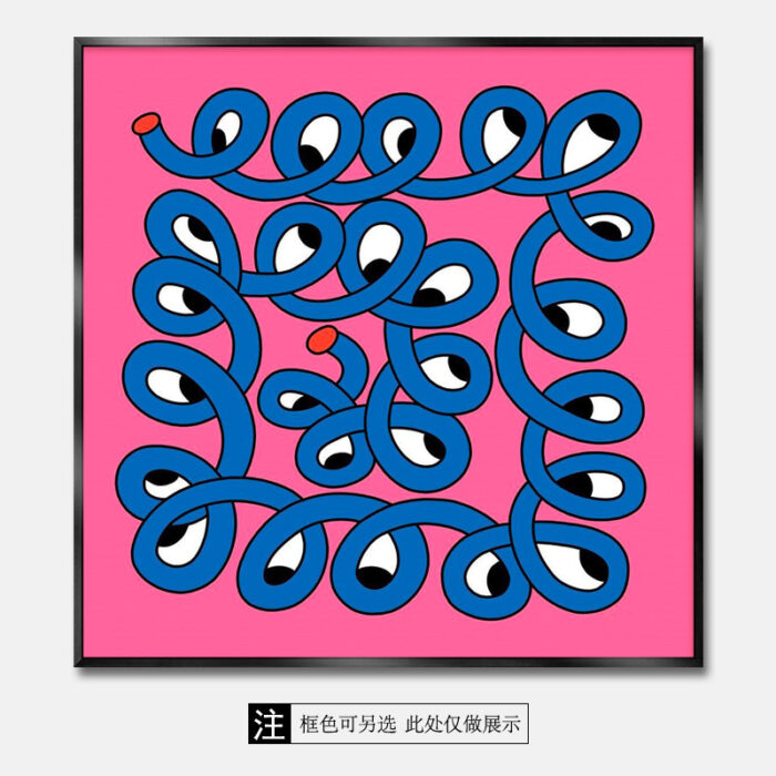 ピンクの背景に大きな青い目をモチーフにした抽象デザイン。