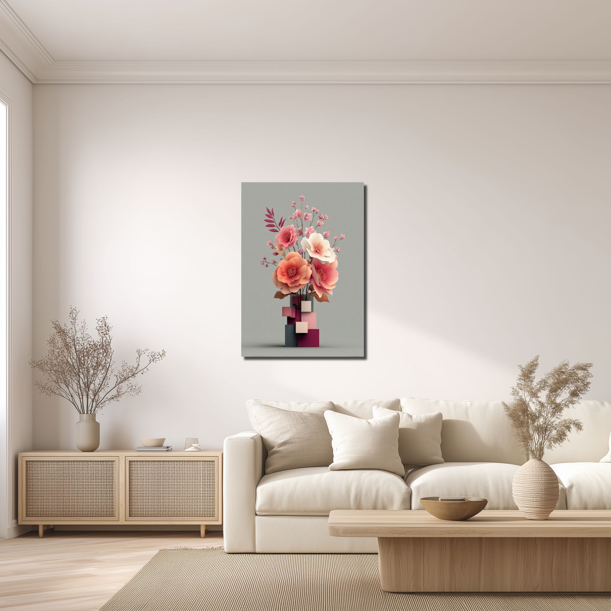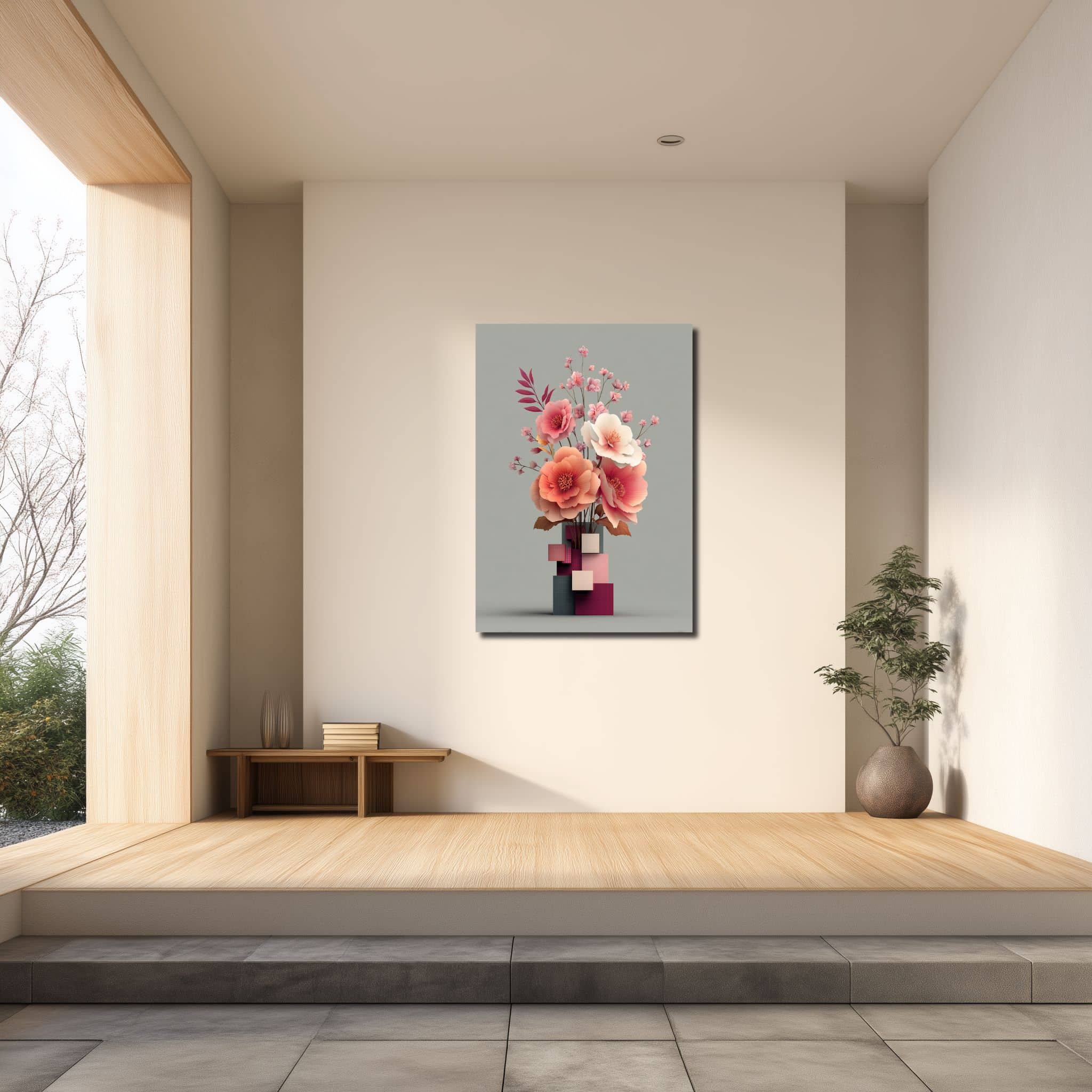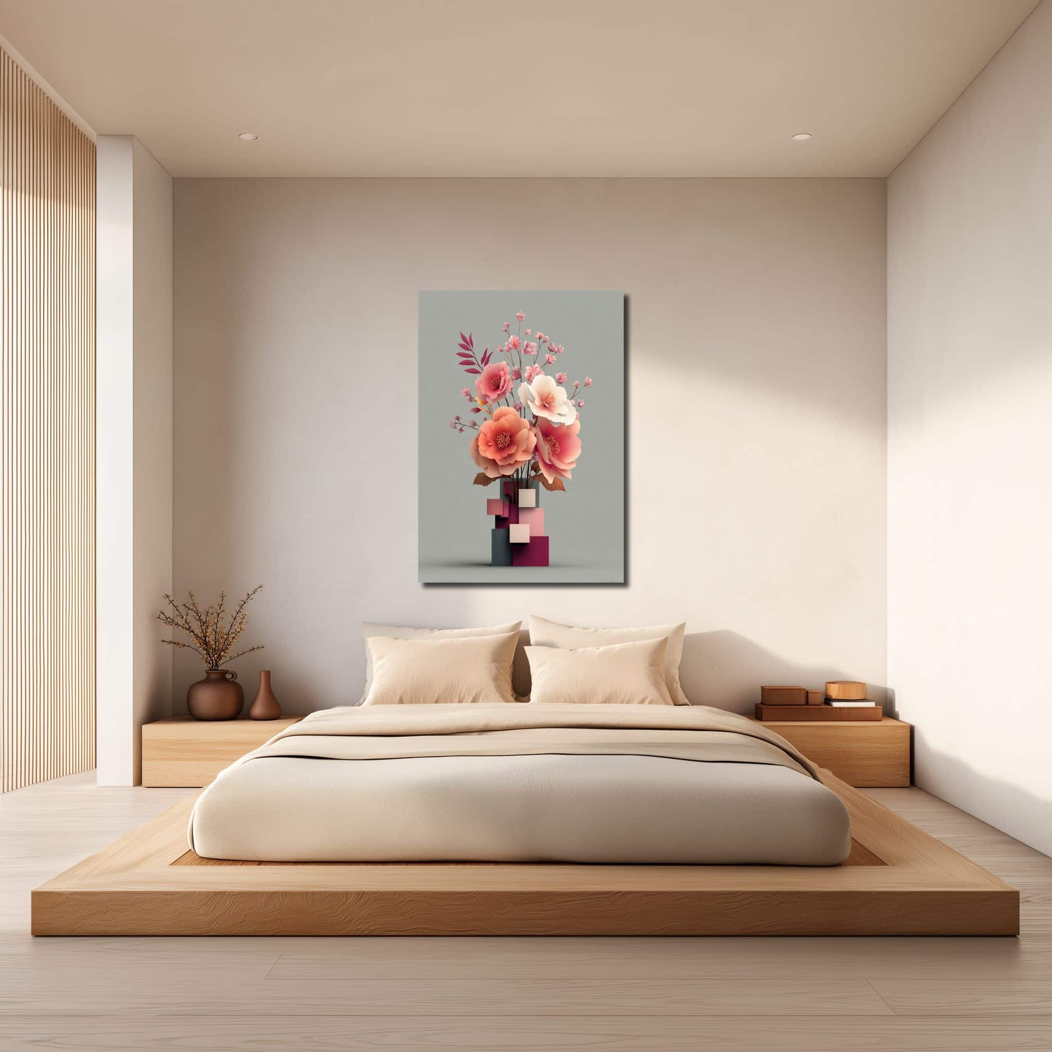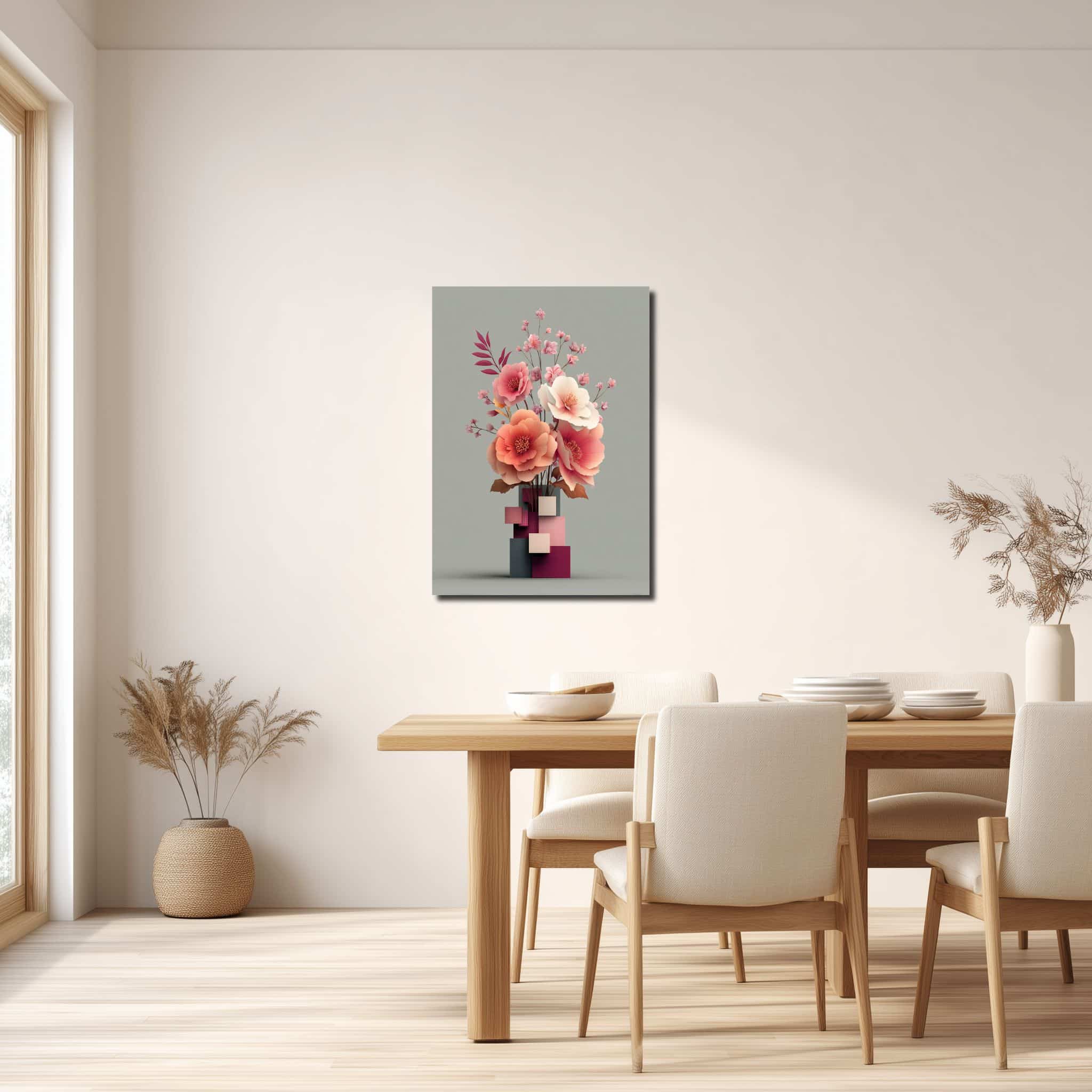 淡いグレーの背景に、幾何学的な花器から大ぶりの花と小花が上へ伸びる構図。視線は自然と中央に集まり、縦の流れがすっきりと見えます。花びらのふくらみや重なりに立体感があり、やわらかな空気の中にきちんとした輪郭も残る一枚です。立体フラワー花器 キャンバスアートとして、華やかすぎず、でも壁が少し物足りないときにはちょうどいい存在感があります。