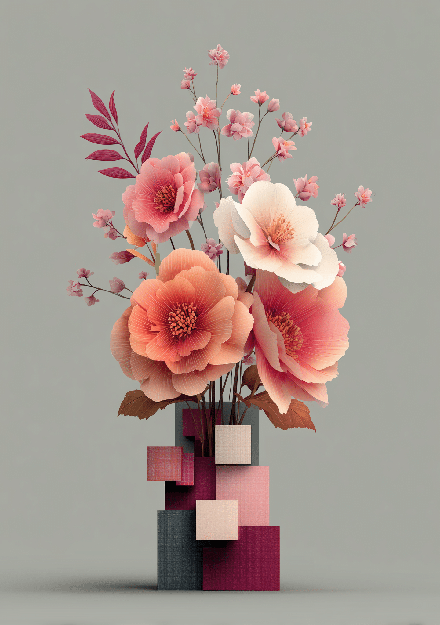 ピンクやコーラル、クリームにボルドーがほどよく混ざり、背景のグレーが全体を静かに整えています。細い茎や葉の線は軽やかで、余白も広め。壁に掛けたときに重たく見えにくく、近くではテクスチャの表情、少し離れると色のまとまりがきれいに見えてきます。立体フラワー花器 キャンバスアートなら、白い壁にも木の色のある空間にもなじみやすく、甘さだけに寄らない見え方です。