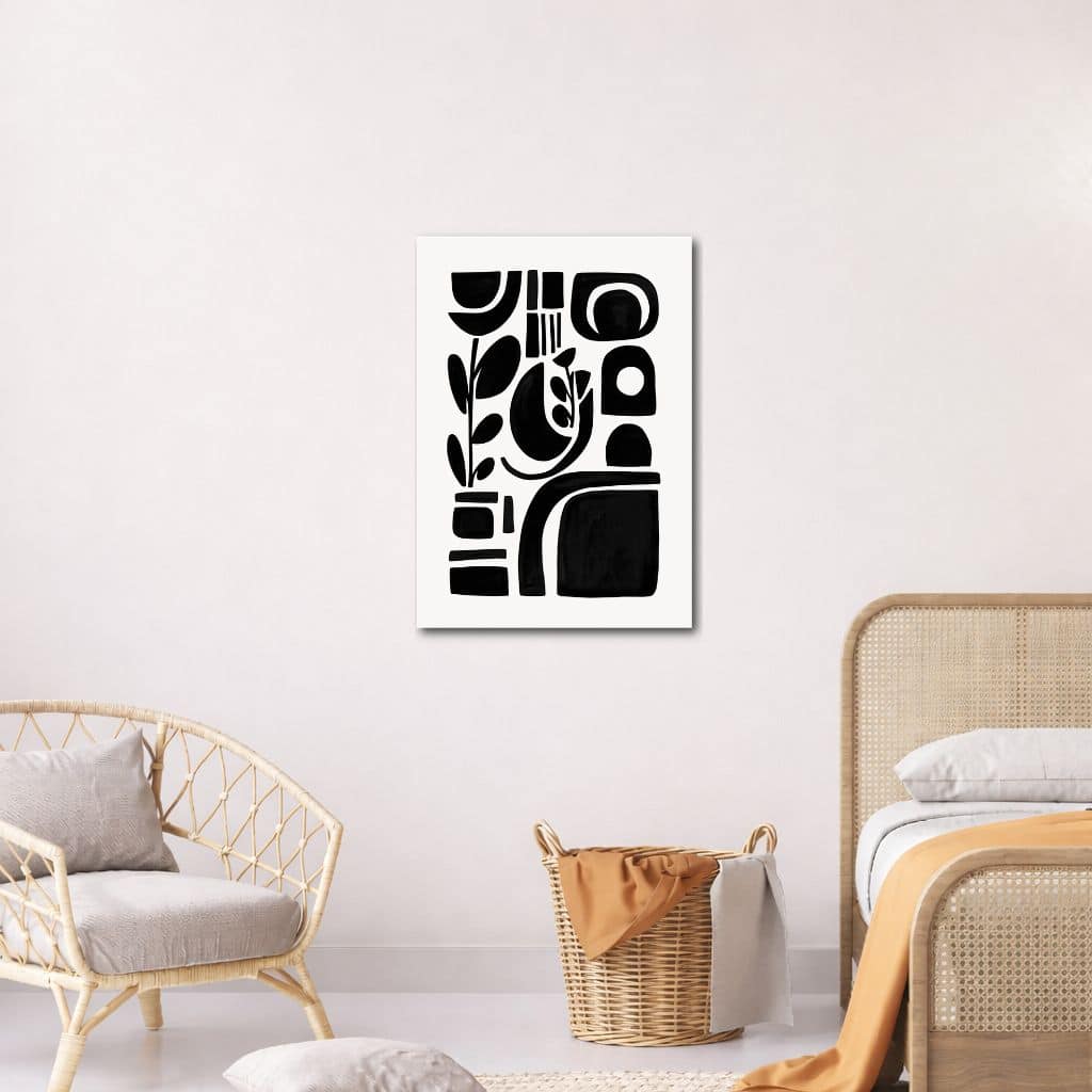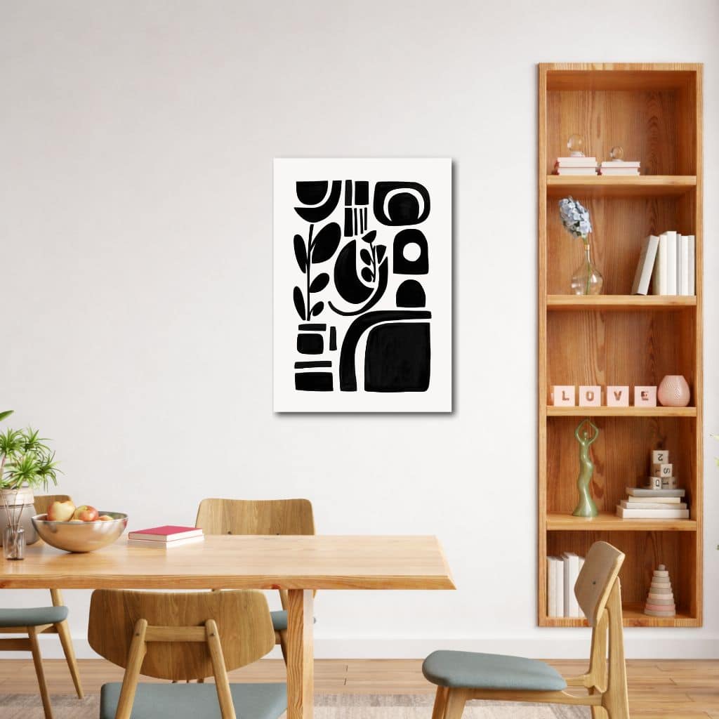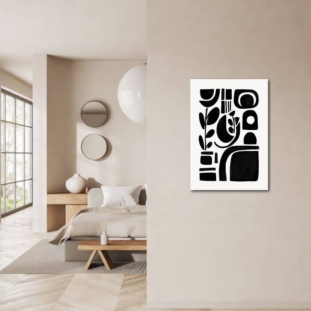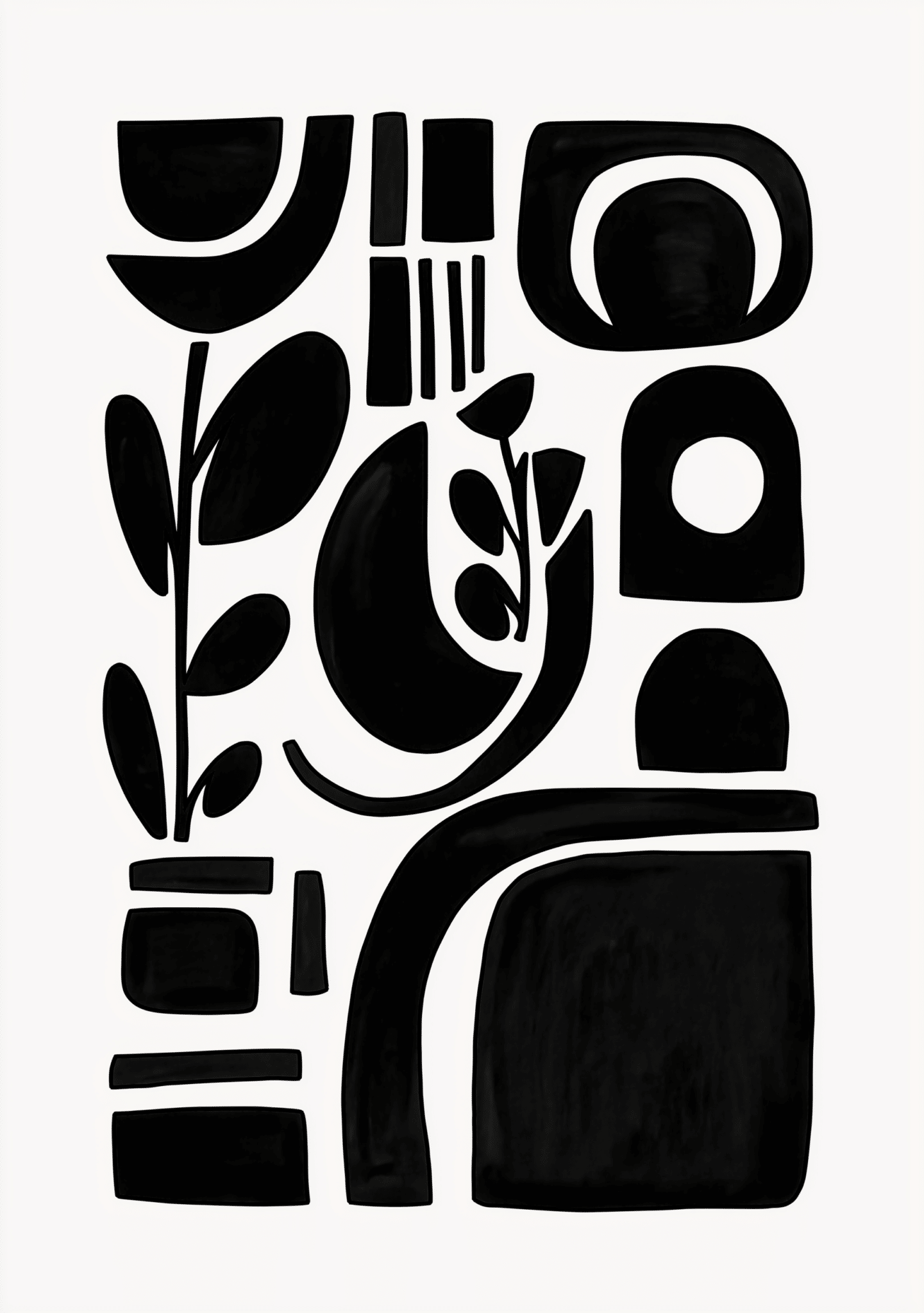 抽象 キャンバスアートは、ブラック一色で構成された有機的なフォルムと、幾何学的な余白のバランスが印象的なモダンアートです。半円やアーチ、スクエア、ライン、植物を思わせるシルエットが心地よいリズムで配置され、シンプルでありながら強い存在感を生み出しています。抽象 キャンバスアートならではの、静けさと個性が同居する洗練された一枚です。