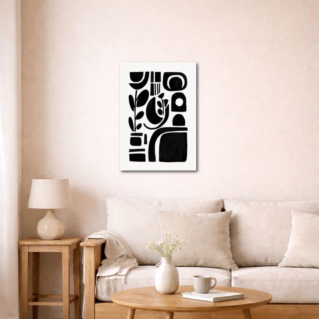 深みのあるブラックとやわらかなアイボリー背景の組み合わせが、抽象 キャンバスアートらしい美しいコントラストを生み出しています。色数を抑えたミニマルな表現だからこそ、フォルムの面白さや構図の完成度が際立ち、空間にすっきりとした緊張感と上質なアクセントを添えてくれます。主張しすぎず、それでいて印象に残るモノトーンアートとしてもおすすめです。