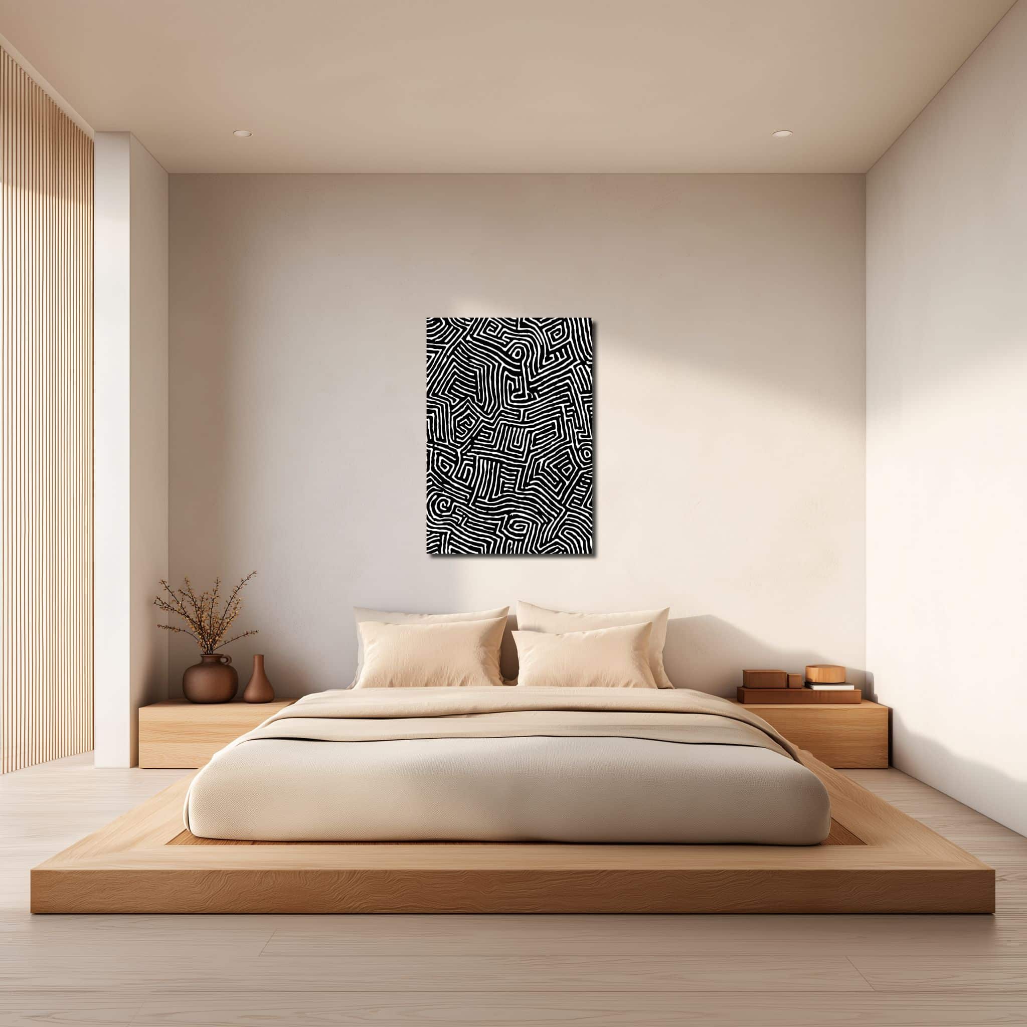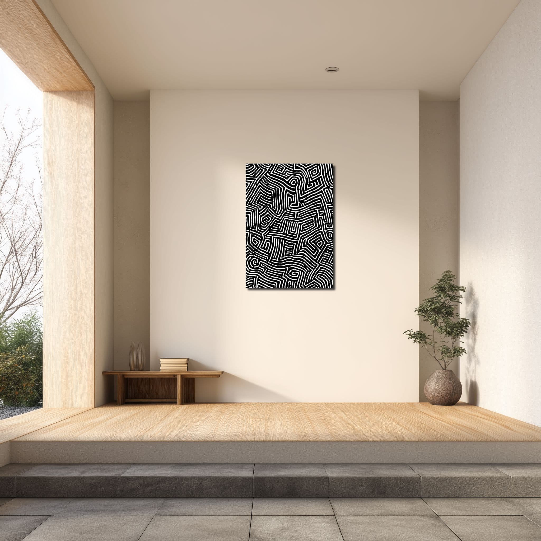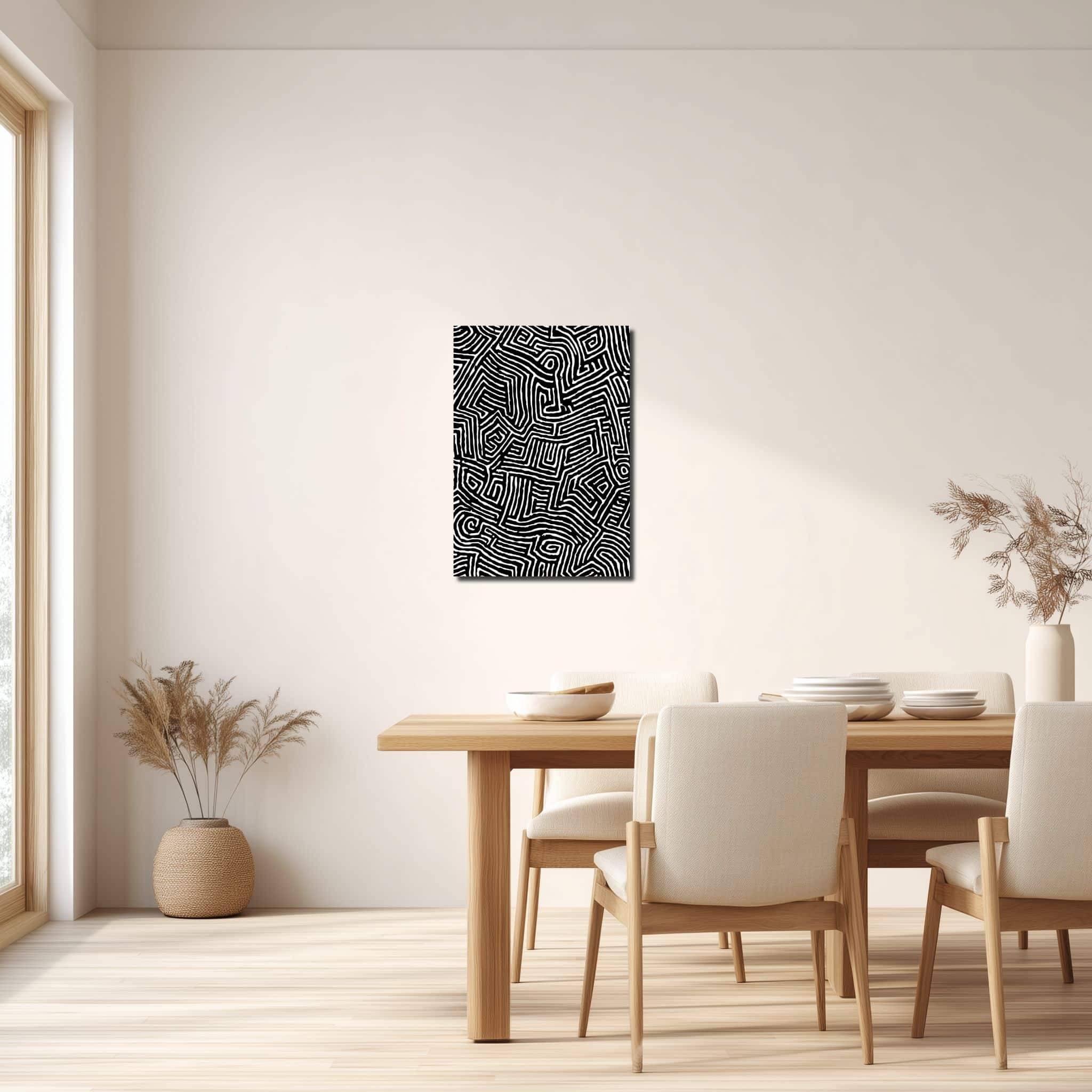 抽象 キャンバスアートは、ブラックとホワイトのシンプルな配色で、迷路のように連なる有機的なラインを大胆に描いたモダンアートです。直線と曲線が入り混じる手描き感のあるパターンが、画面全体に独特のリズムと奥行きを生み出し、静かな中にも強い個性を感じさせます。抽象 キャンバスアートならではの、ミニマルでありながら印象に残る存在感を楽しめる一枚です。