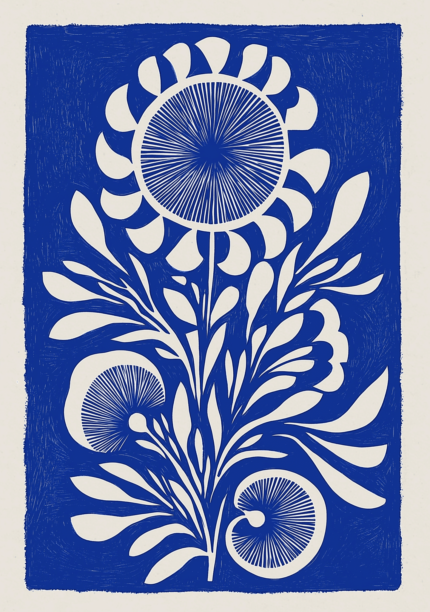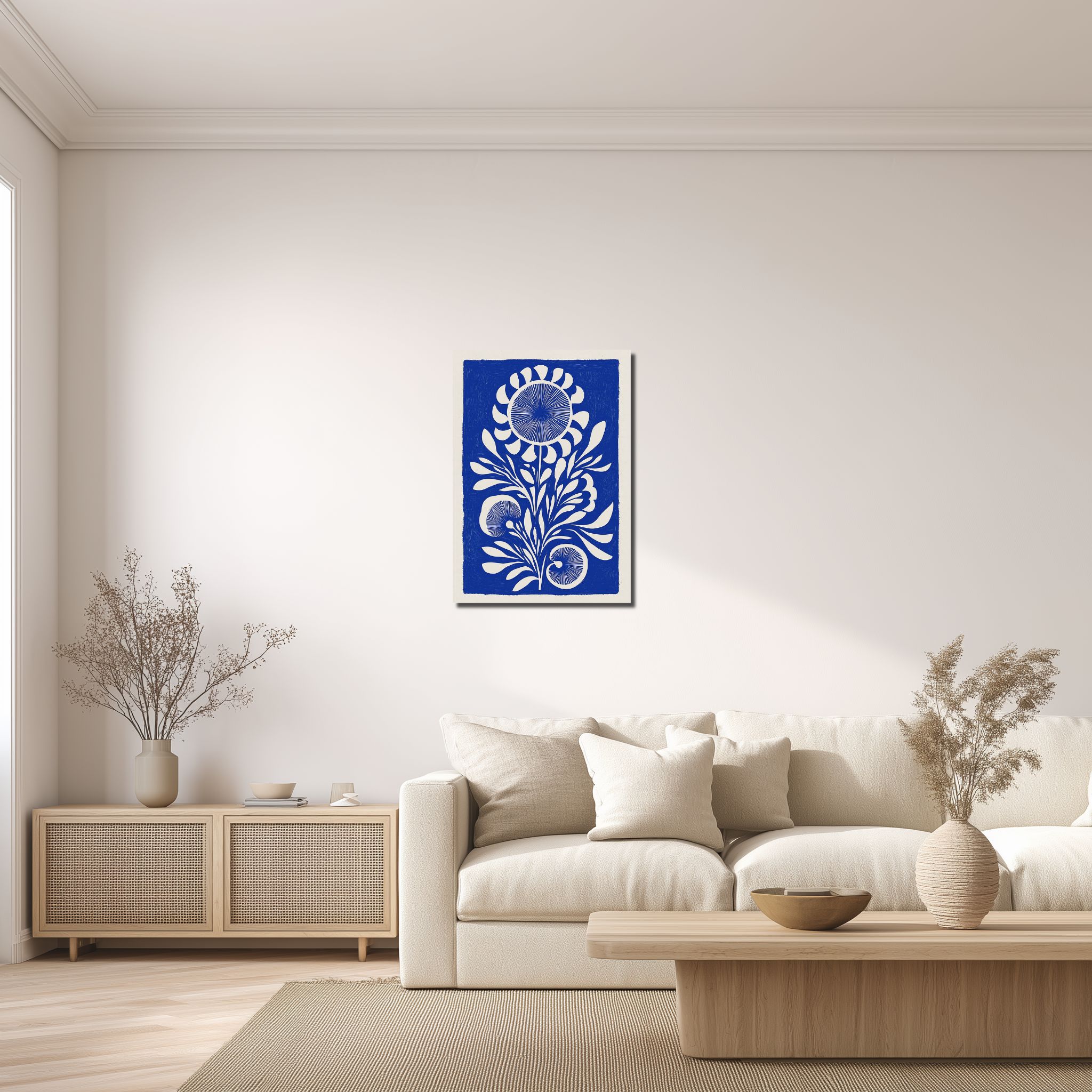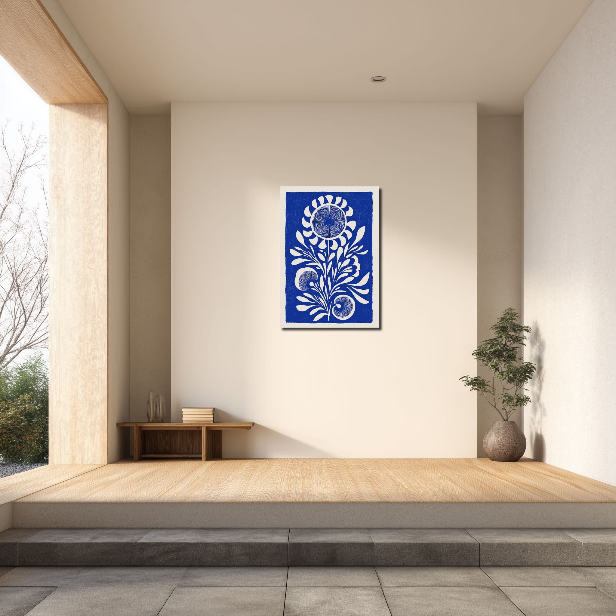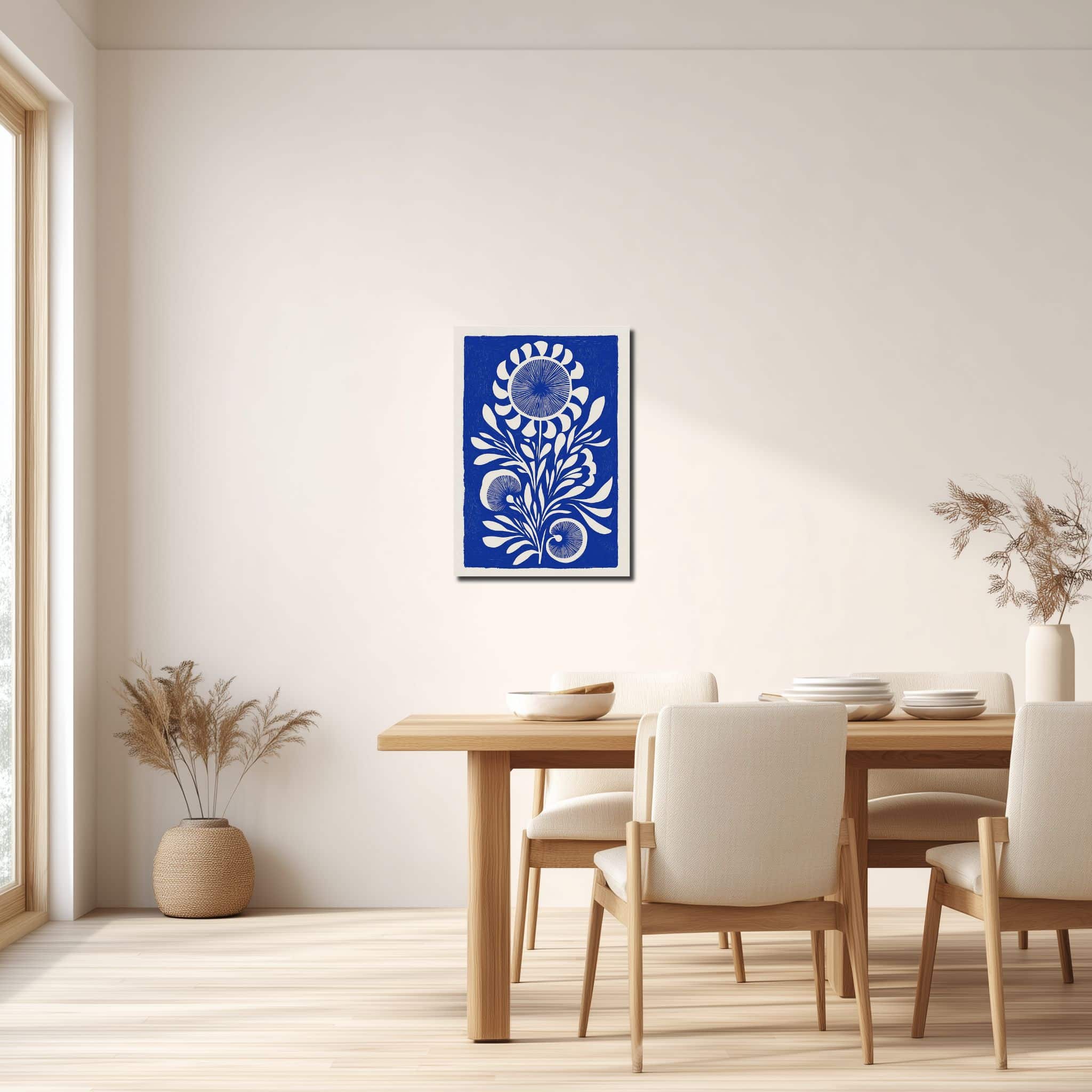 藍白版画花 キャンバスアートは、藍色と白の澄んだ対比が目を引く、版画風のボタニカルデザインです。中央に配した花と葉のモチーフが縦の流れを生み、静けさの中に凛とした存在感を添えます。