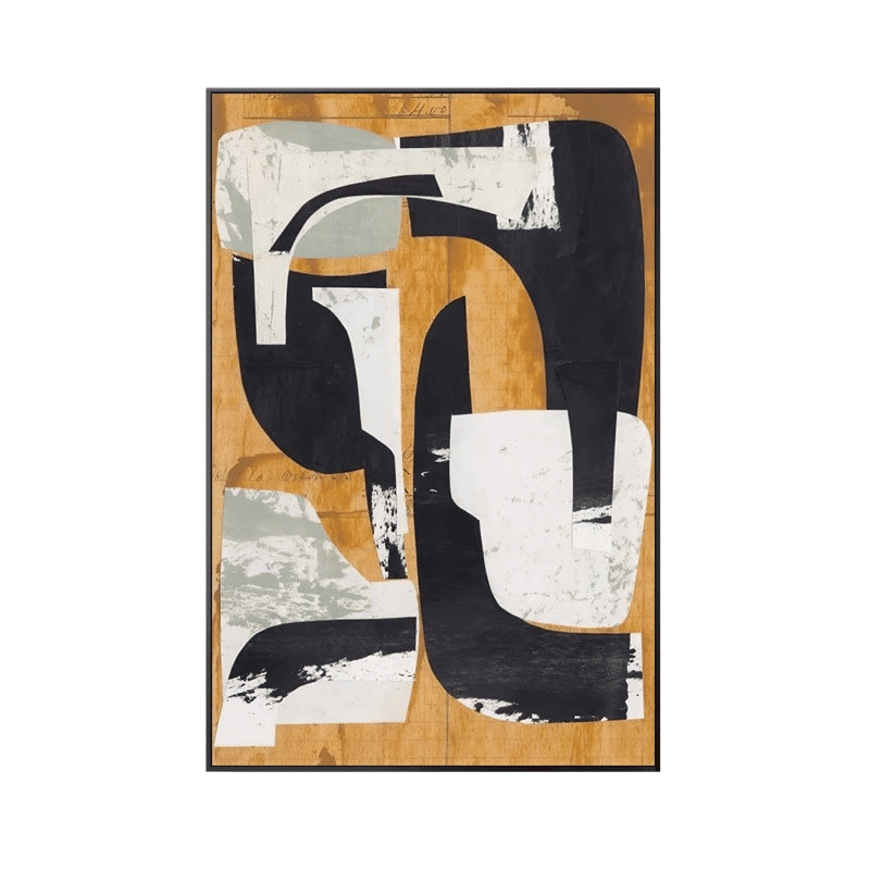 木目調のブラウンを背景に、ブラックとホワイトの形が調和した抽象構成アート。