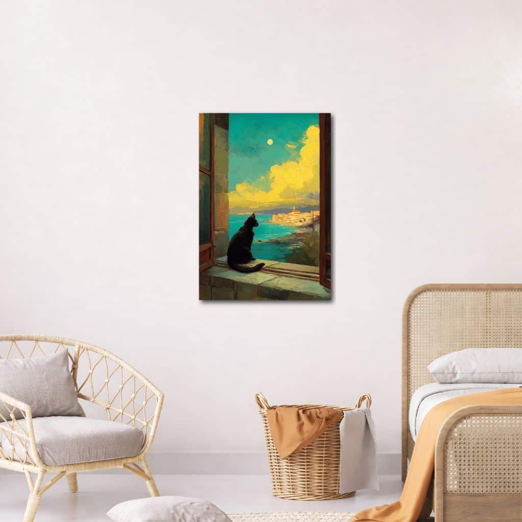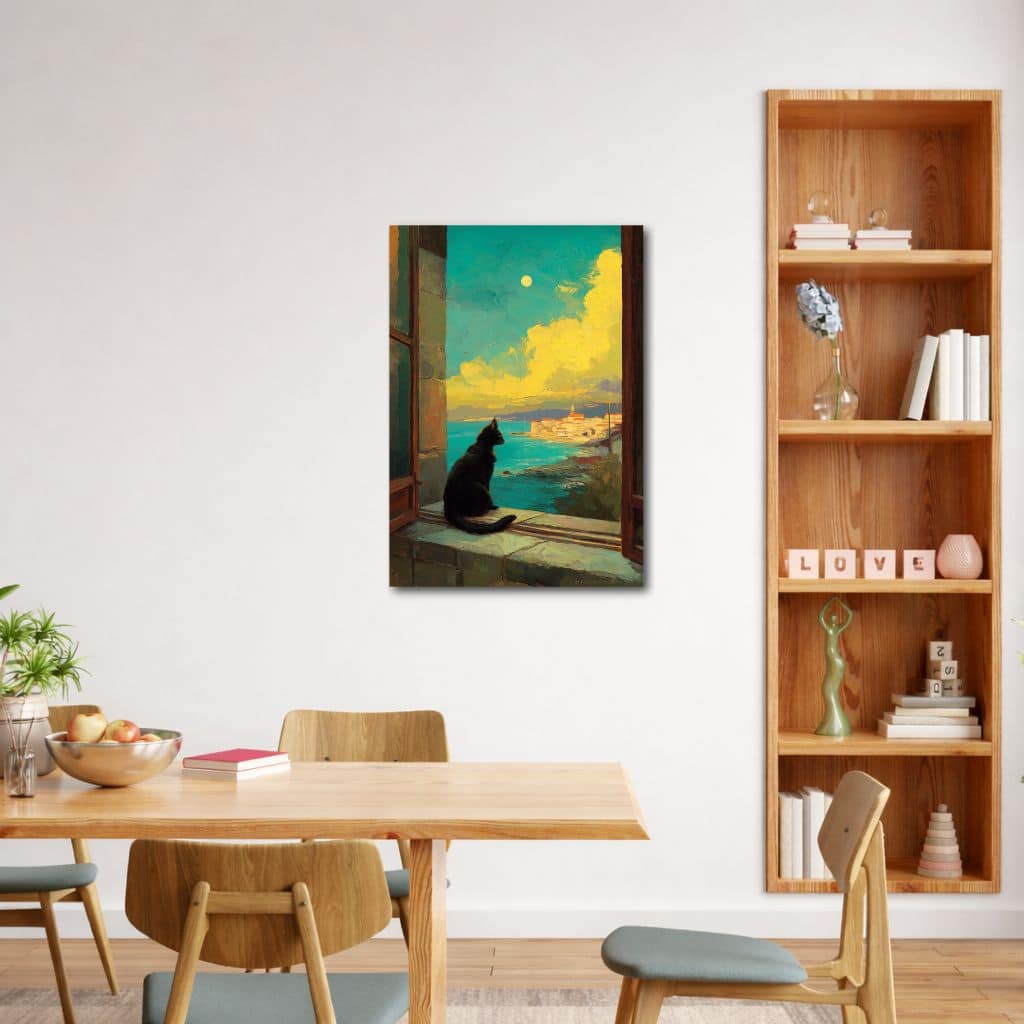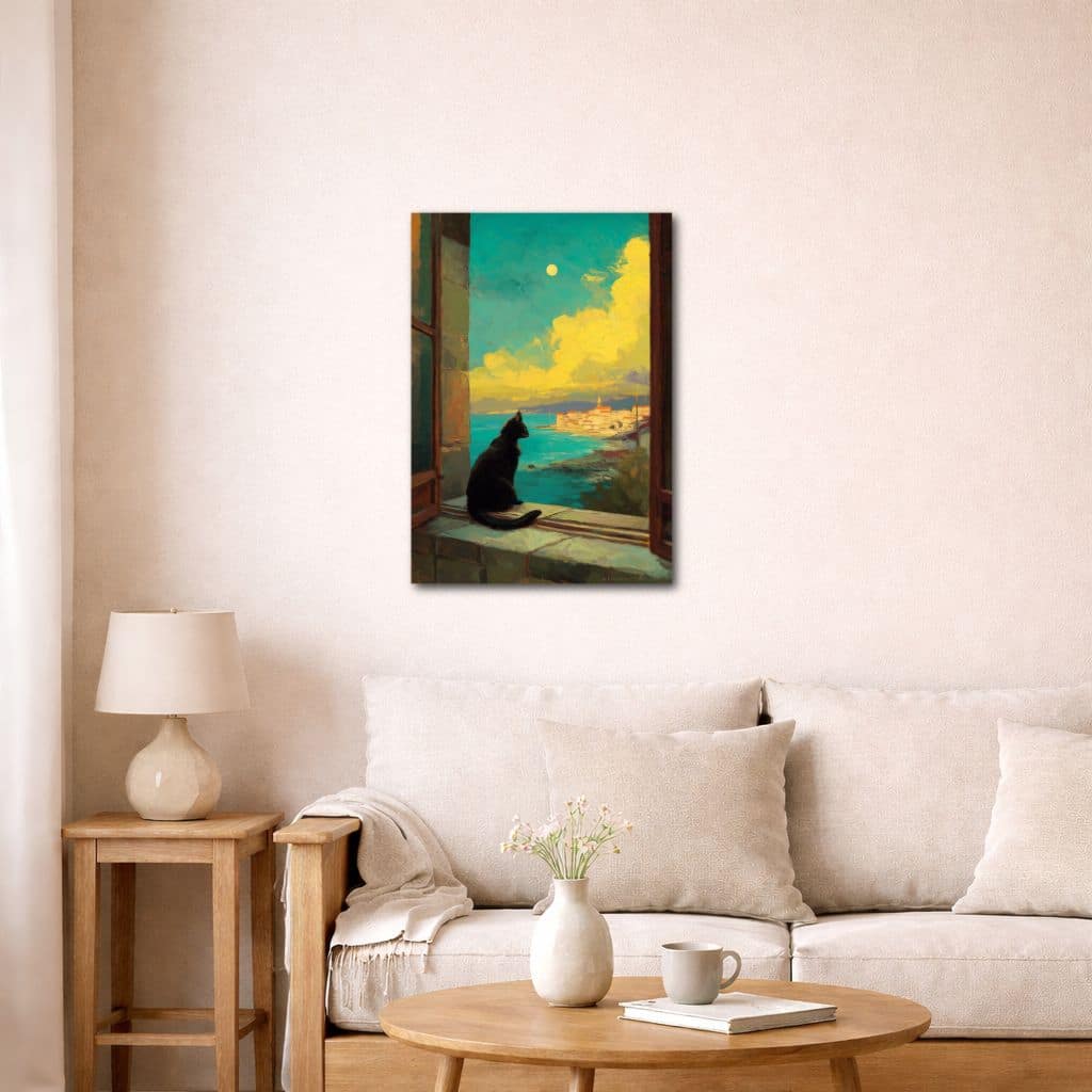 深みのある黒猫のシルエットに、ブルーの海と空、やわらかなイエローの雲や光を重ねることで、黒猫 キャンバスアートならではの印象的なコントラストを空間に与えます。穏やかな華やかさがありながらも視覚的な圧迫感は強すぎず、お部屋を明るく見せつつ、静かで洗練された雰囲気へ整えてくれる一枚です。