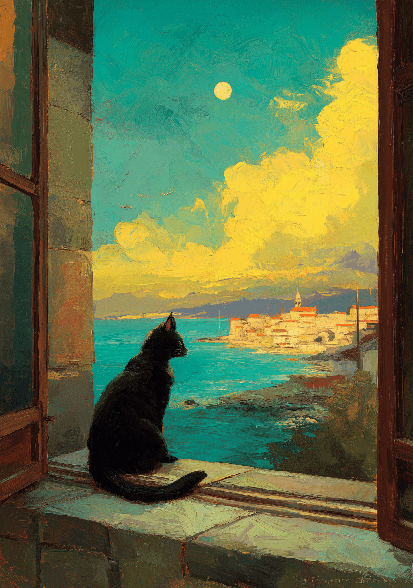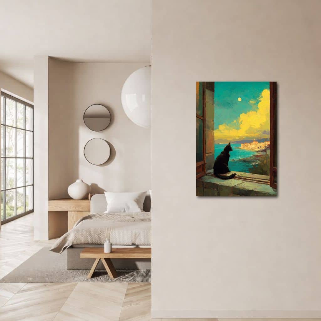 黒猫 キャンバスアートは、窓辺にたたずむ黒猫と、海辺の街並み、やわらかな光に包まれた空の表情が印象的なモダンアートです。静かな構図の中に広がるブルーやイエローの色彩が美しく響き合い、空間にやさしい物語性と心地よい奥行きをもたらします。黒猫 キャンバスアートならではの、落ち着きとあたたかな余韻を楽しめる一枚です。