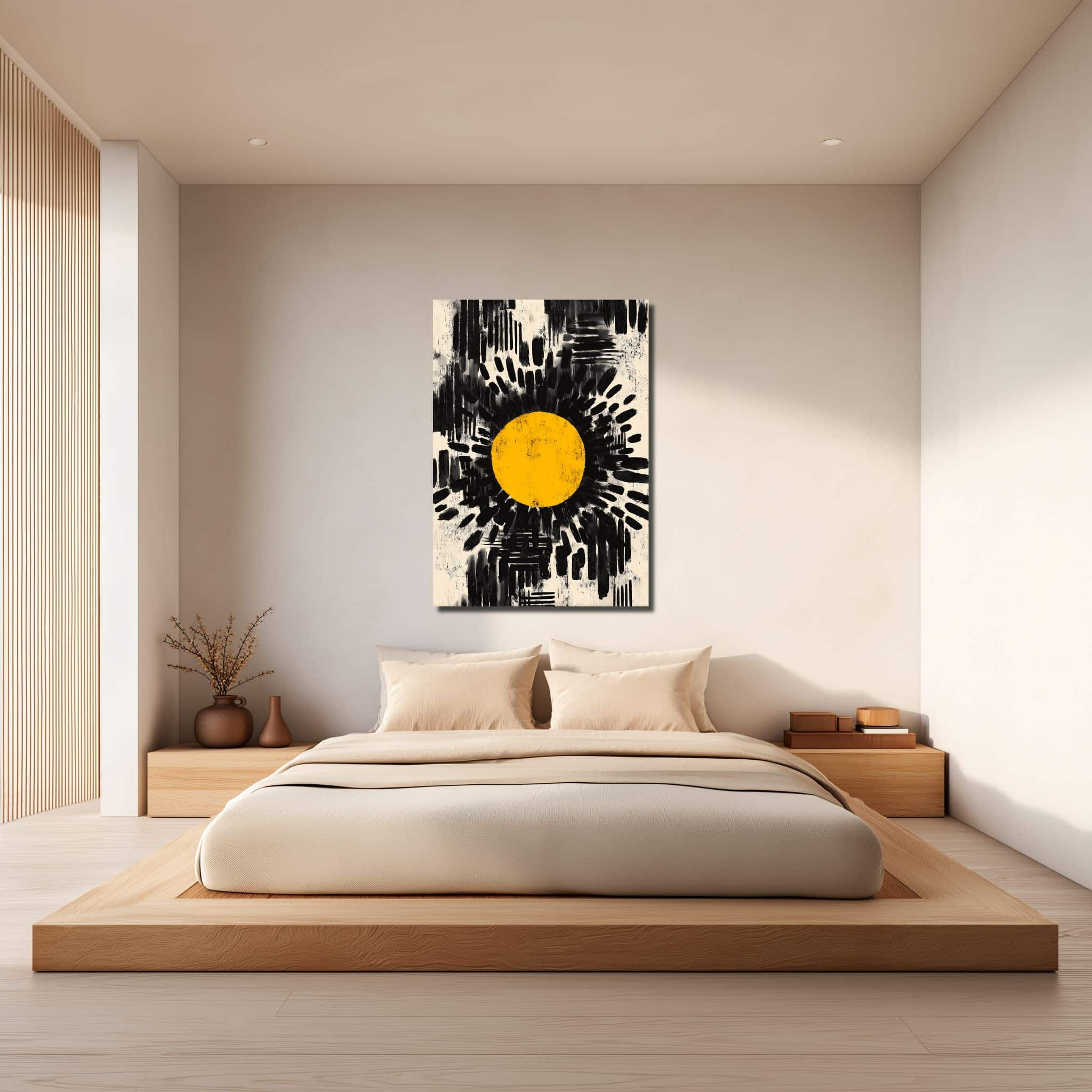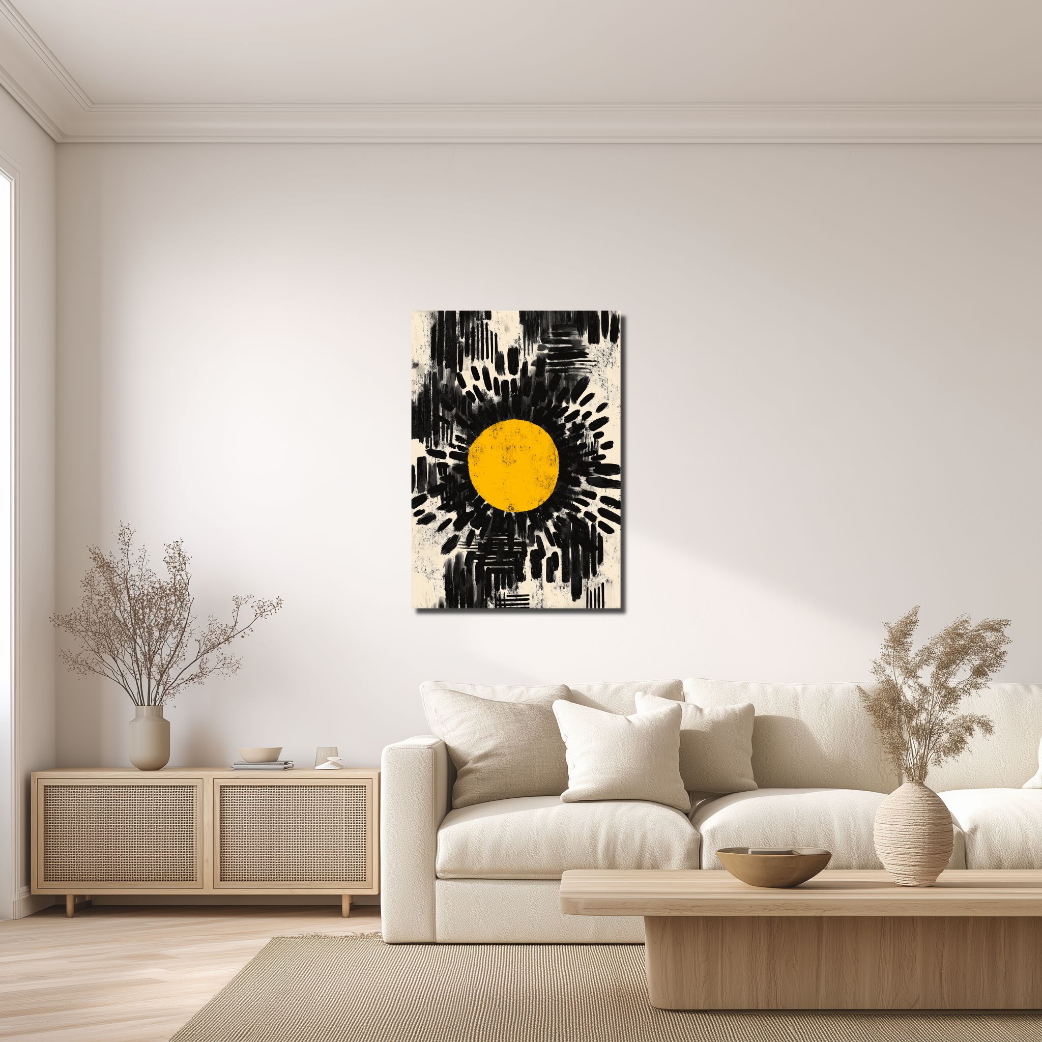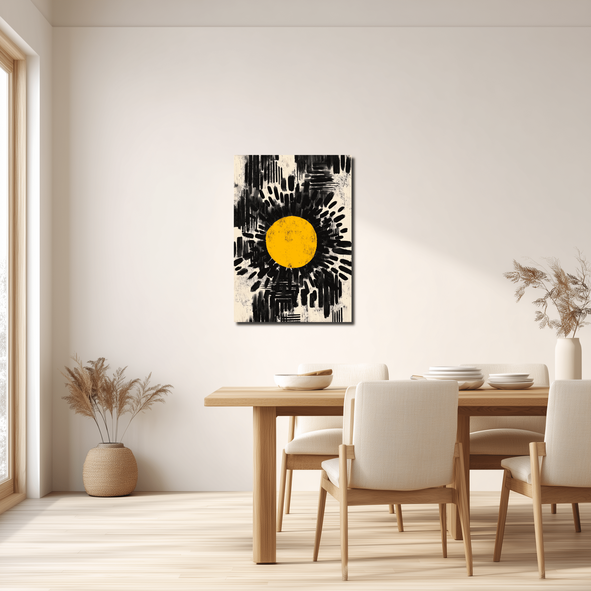 黒と白を軸にしたコントラストははっきりしていますが、ベージュやグレーがわずかに混じることで、見え方はどこか乾いたやわらかさがあります。黄色い円は明るいアクセントとして浮かび、黒の勢いを重くしすぎません。線やにじみの強弱、余白の抜け方があるので、ブラック 抽象アートでも圧迫感は出にくく、白壁ではシャープに、少し色味のある壁では奥行きが静かに立ち上がります。