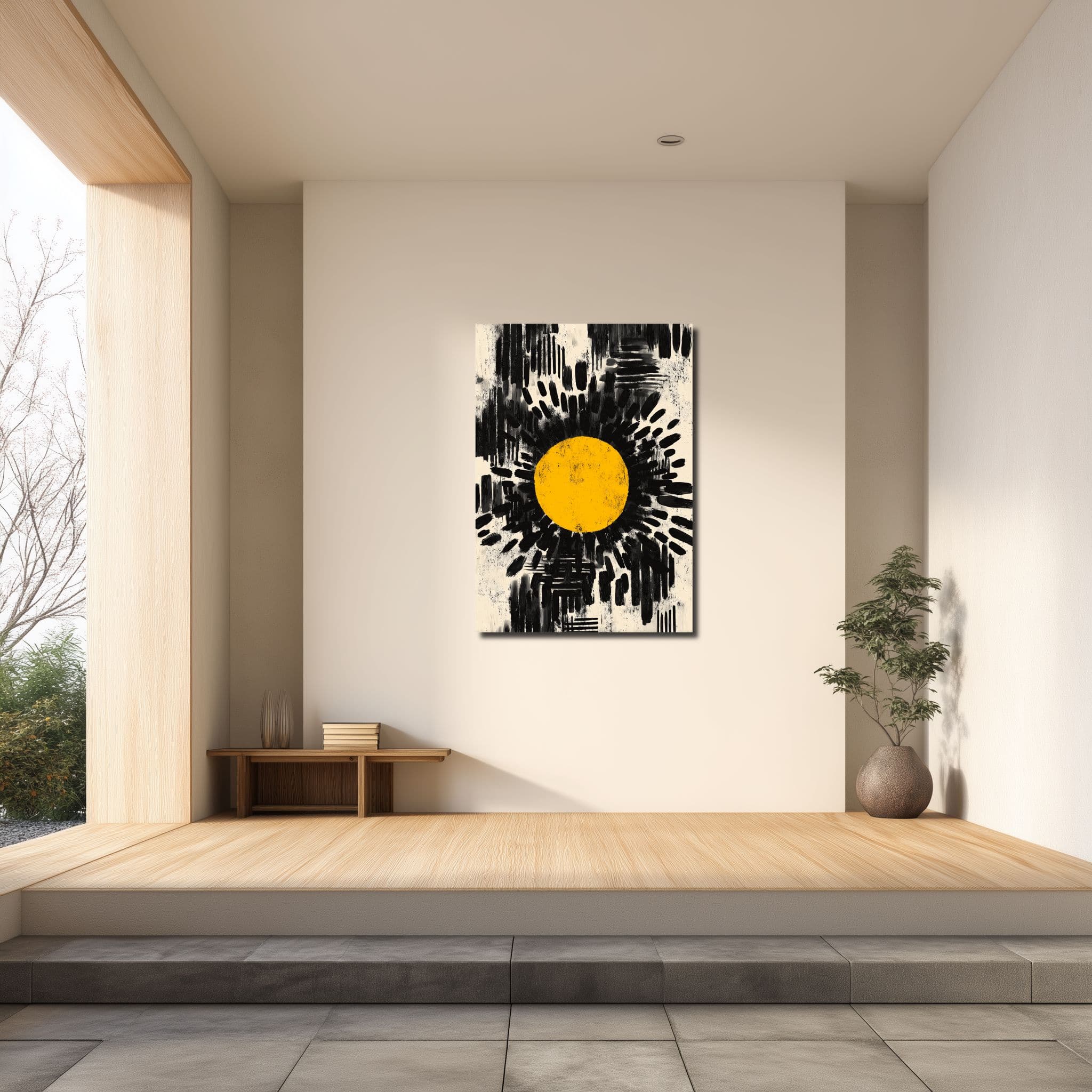 中央の円形と大胆な黒い筆致が、壁の中でしっかり視線を止めます。 ただ、余白が広く残るので重たくなりすぎません。 リビングでは空間の印象を引き締め、玄関では最初の景色がすっきりまとまります。 木の色や淡い壁色にも合わせやすく、単体でも画面がきれいに立ちます。