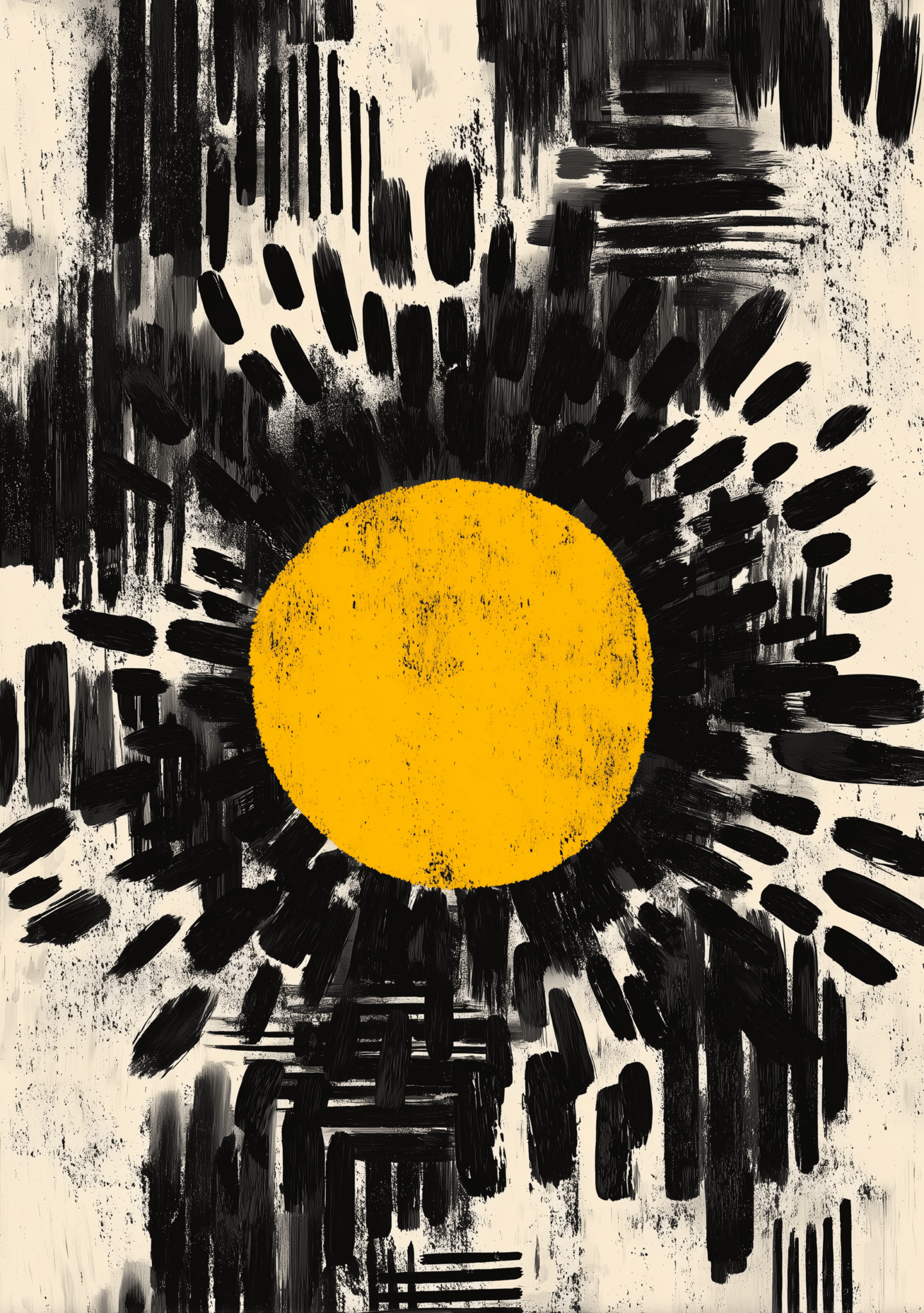 中央に置かれた黄色い円形がまず目を引き、そのまわりを黒い筆致と飛沫のような表現が大きく取り囲む構成です。縦の流れを感じる画面の中に、勢いのある刷毛の跡と広めの余白が同居していて、強さだけに寄りすぎません。ブラック 抽象アートらしい切れ味がありながら、中心の黄が視線を受け止めるので、壁に掛けたときも輪郭がきれいに残ります。