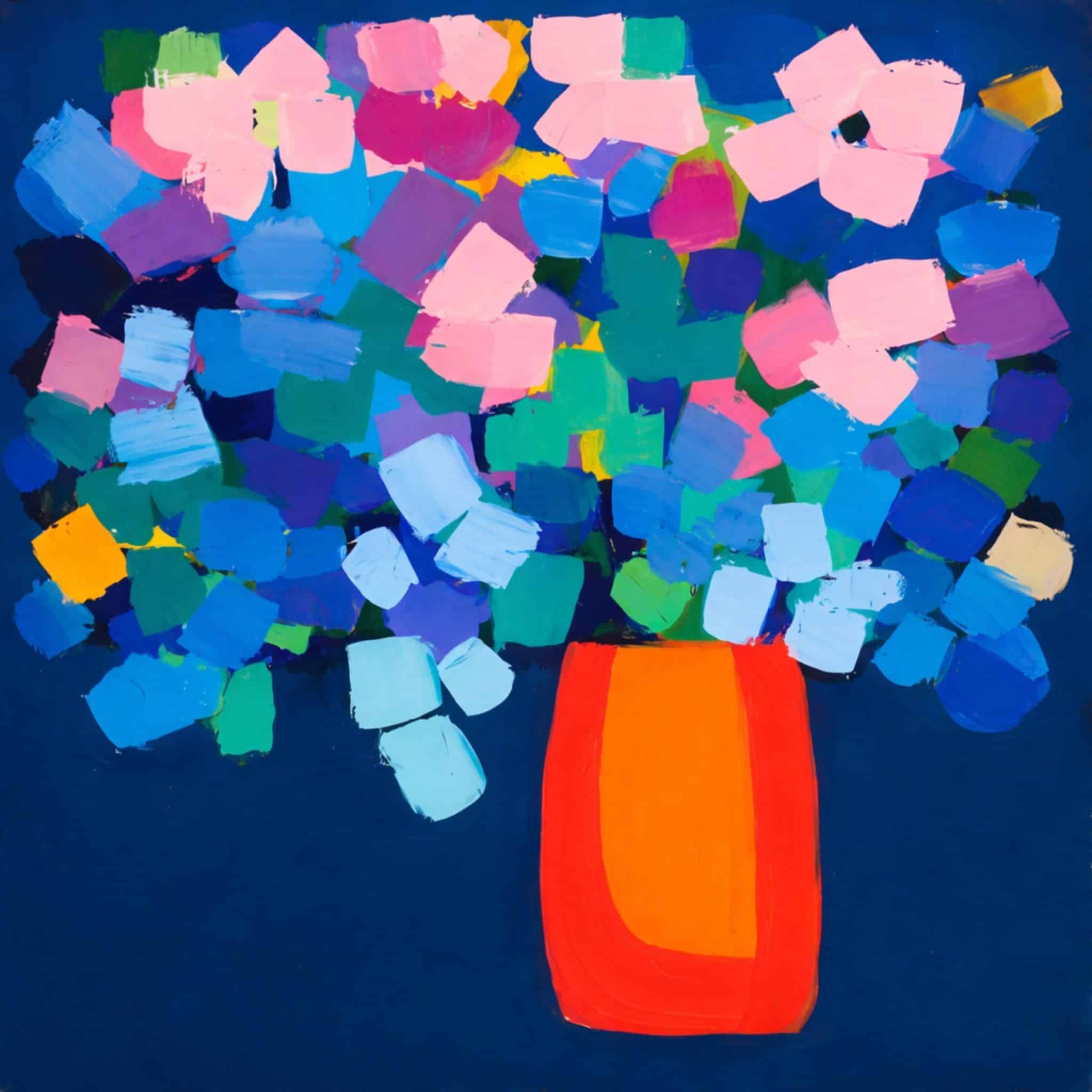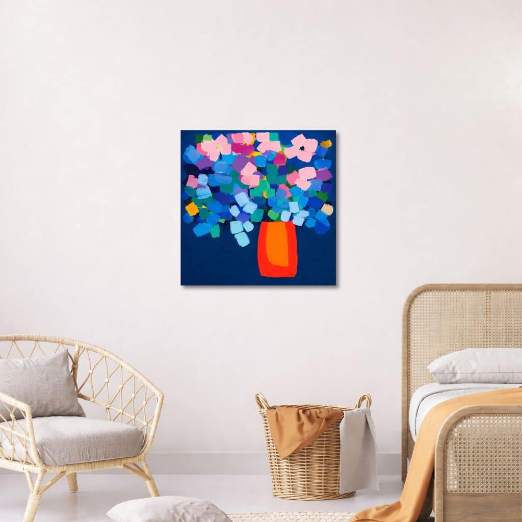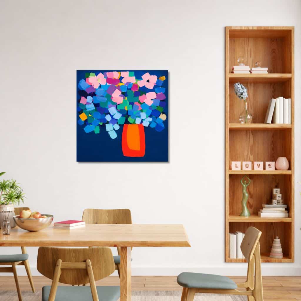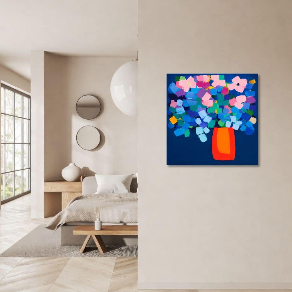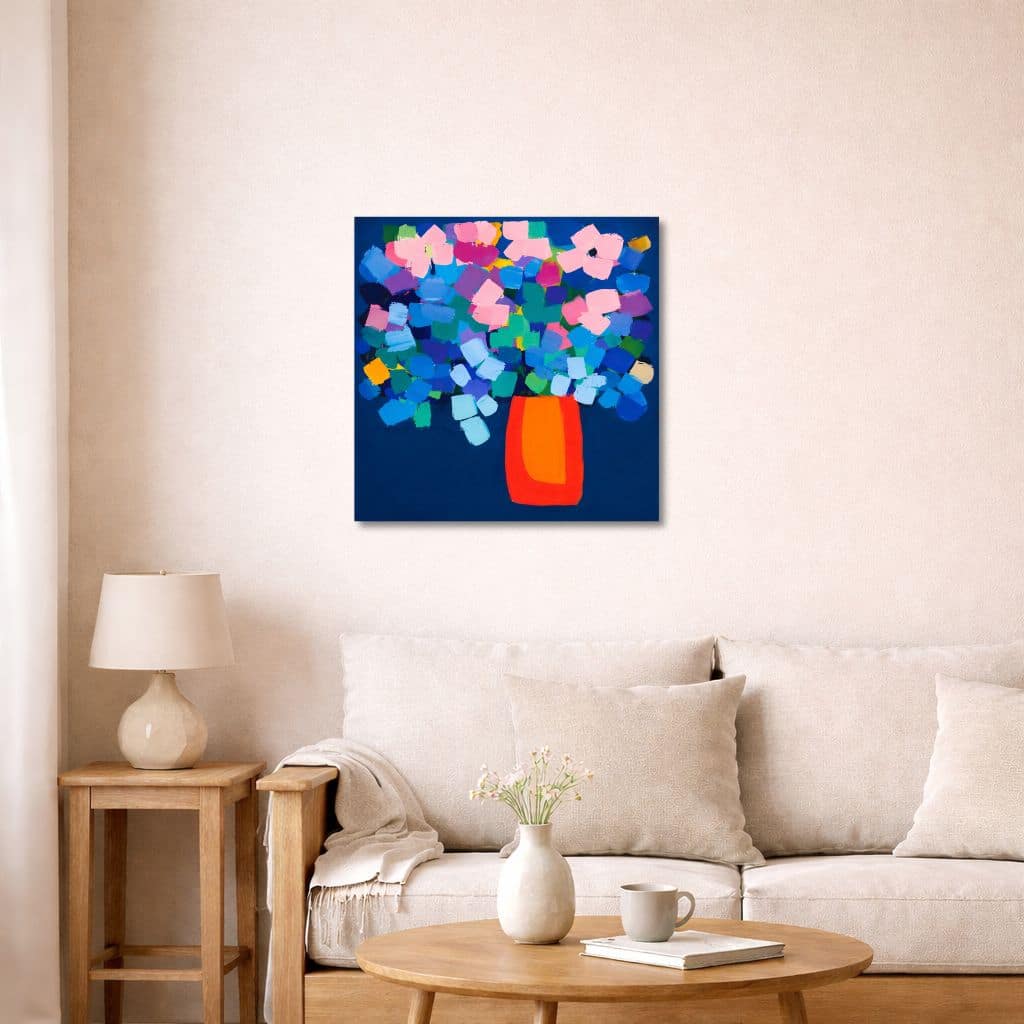 深みのあるブルーをベースに、ピンクやライトブルー、グリーンの花々と鮮やかなオレンジベースを組み合わせた、印象的なモダンフラワーアートです。