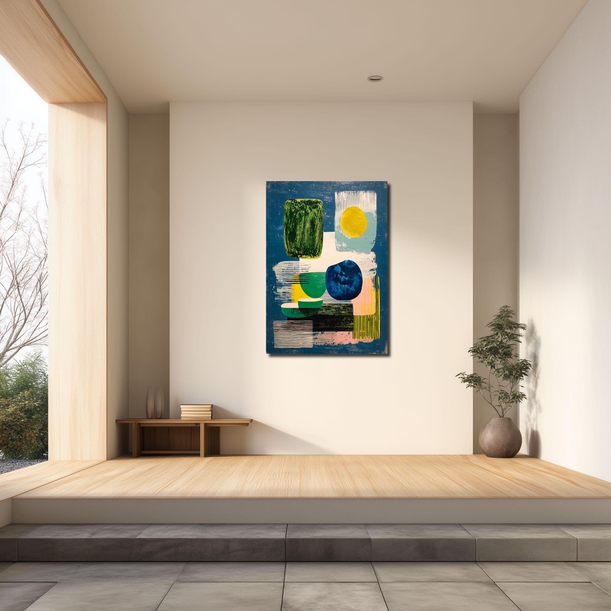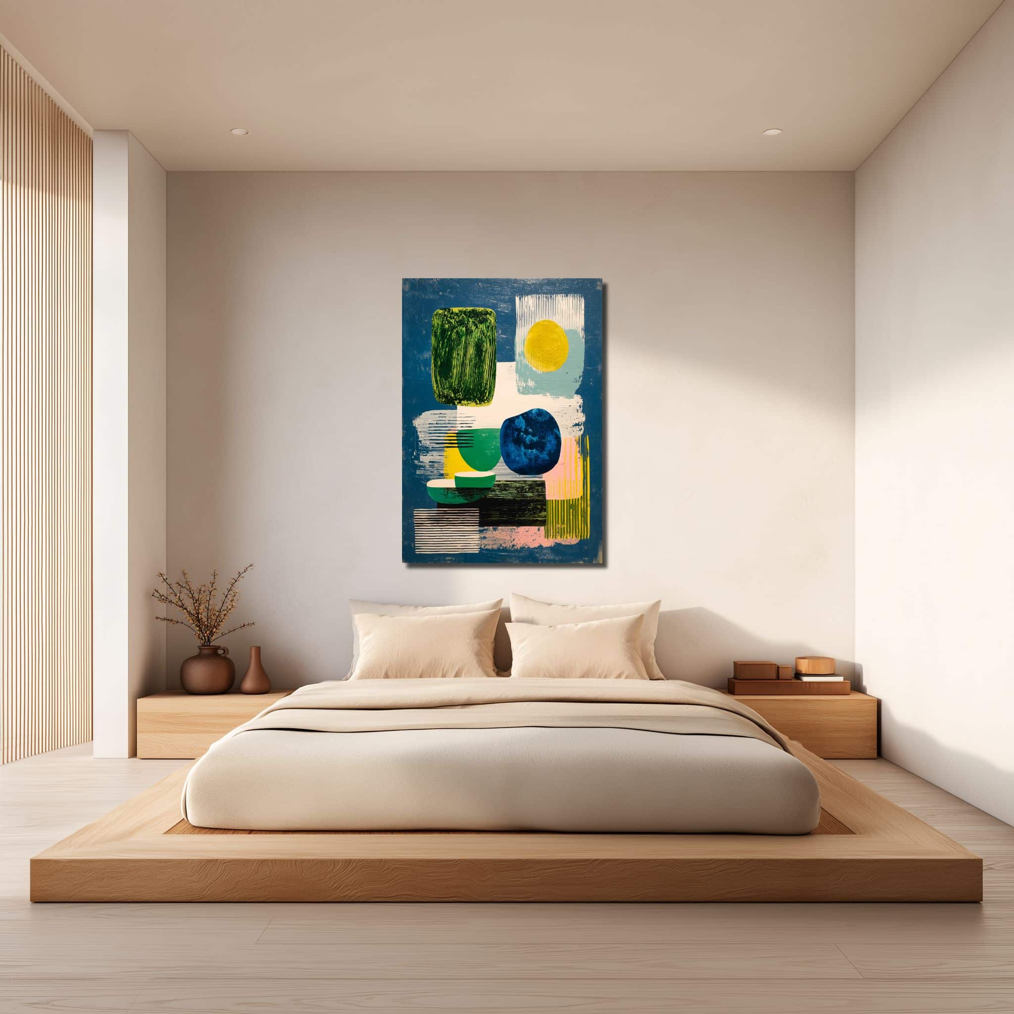 深い青をベースに、黄緑や黄色の色面、丸みのある矩形、円形、細かな縞が重ねられた リビング 幾何学アート です。中央に視線が集まりやすい構成ですが、詰まりすぎた感じはなく、抜ける余白もきちんと残っています。コラージュのような重なりがありながら、見え方は軽やか。壁に掛けると、まず青の広がりが目に入り、そのあとで形のリズムが静かに残る一枚です。