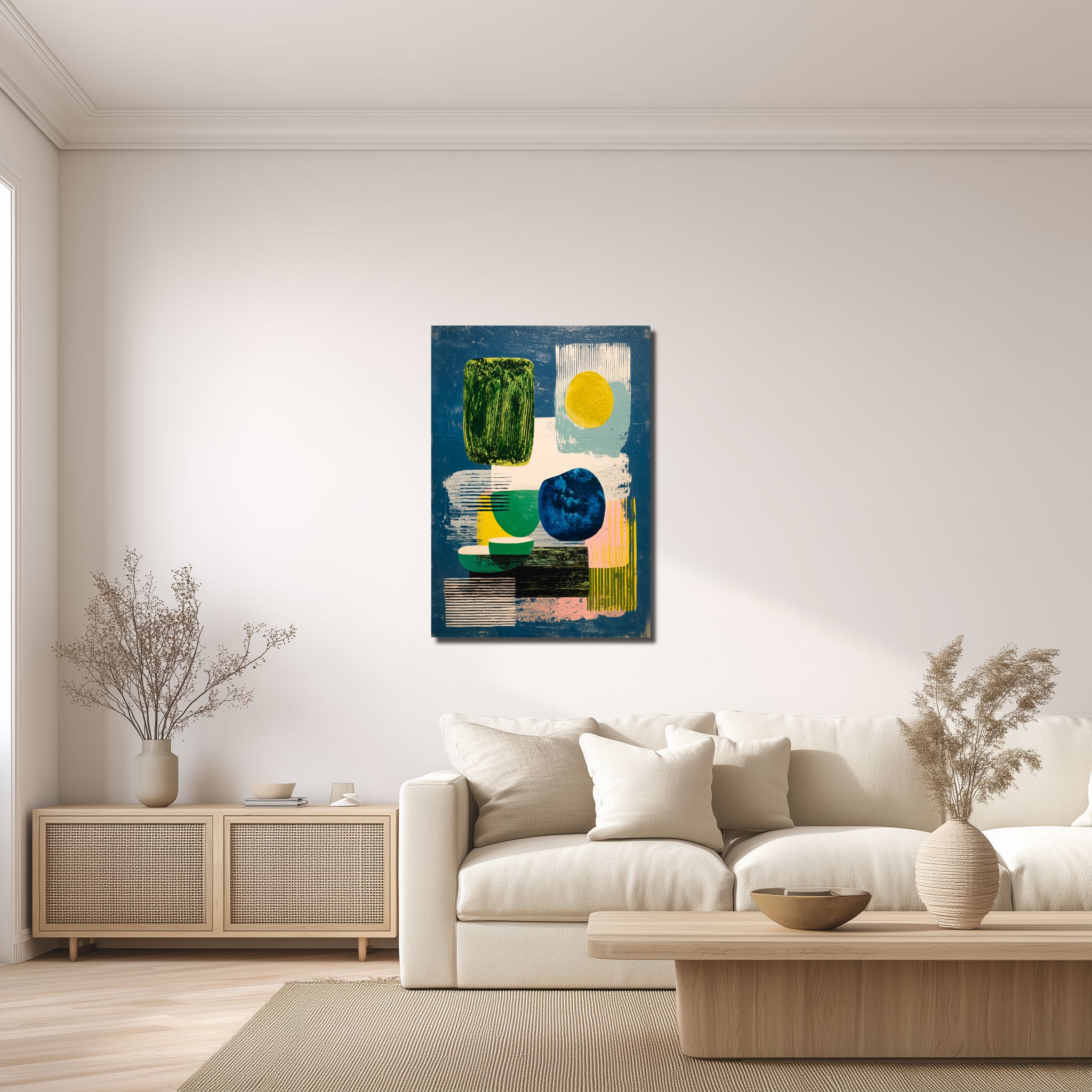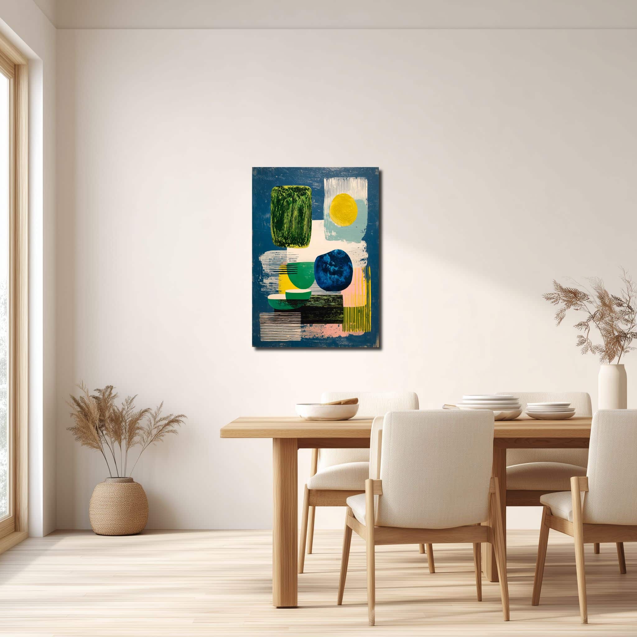 深い青が壁にすっと入り、黄緑や黄色がほどよい抜けをつくります。 輪郭ははっきりしていますが、重なり方にやわらかさがあり、見た目は意外と軽め。 リビングでは視線が止まりやすく、ダイニングでは日常の動きの中にきれいなリズムが残ります。 木の色の家具とも合わせやすく、白壁でも単調に見えにくいタイプです。