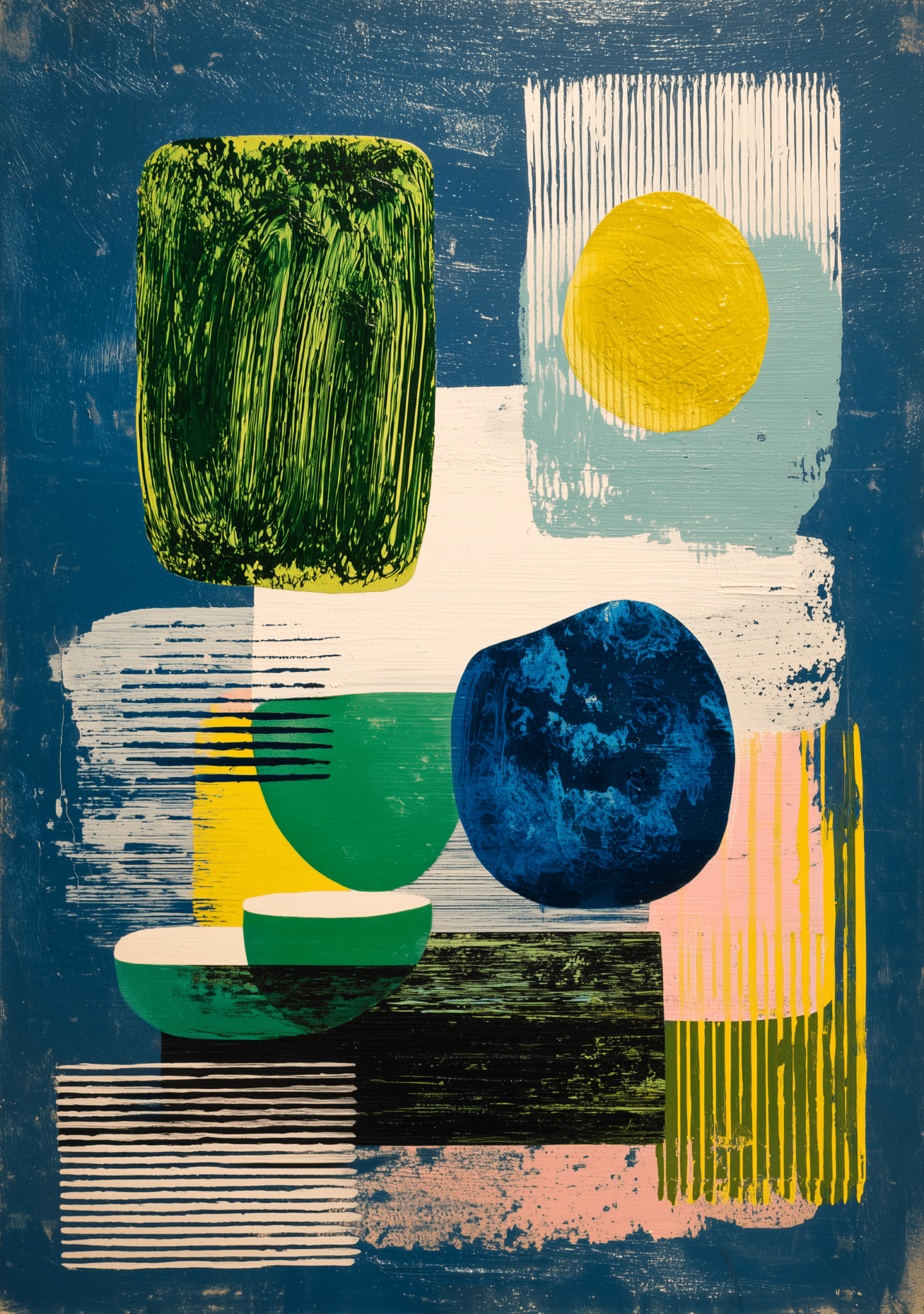 高精細プリントにより、深い青の背景に重なる黄緑や黄色の色面、縞模様、円形や角丸の矩形のコントラストを美しく再現しています。