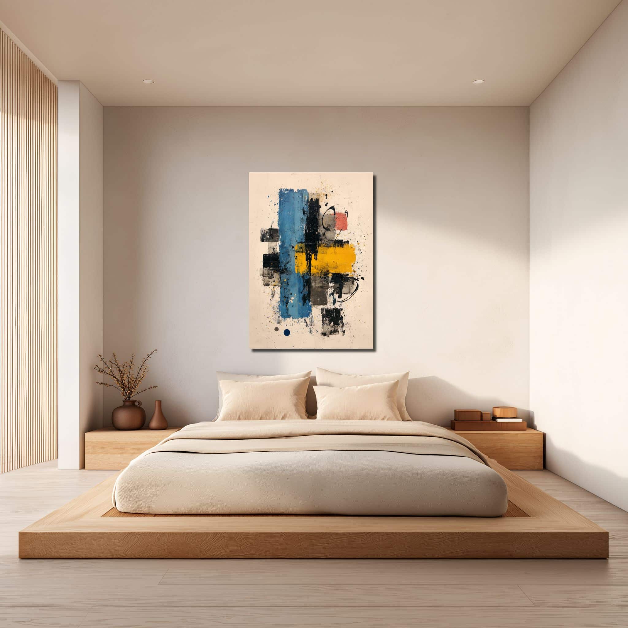 ブルー リビング 幾何学アートとして、青い縦長の面と黄色のブロック、黒い線の動きが壁に心地よい緊張感をつくる一枚です。