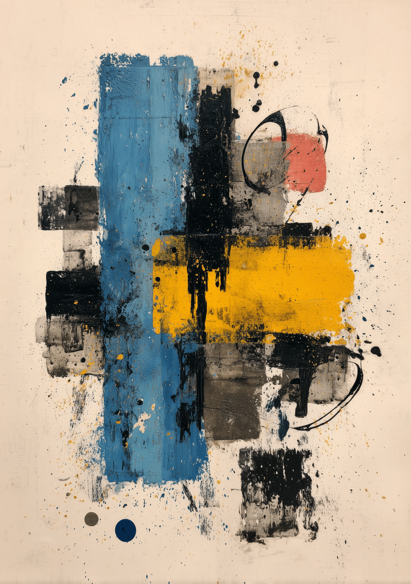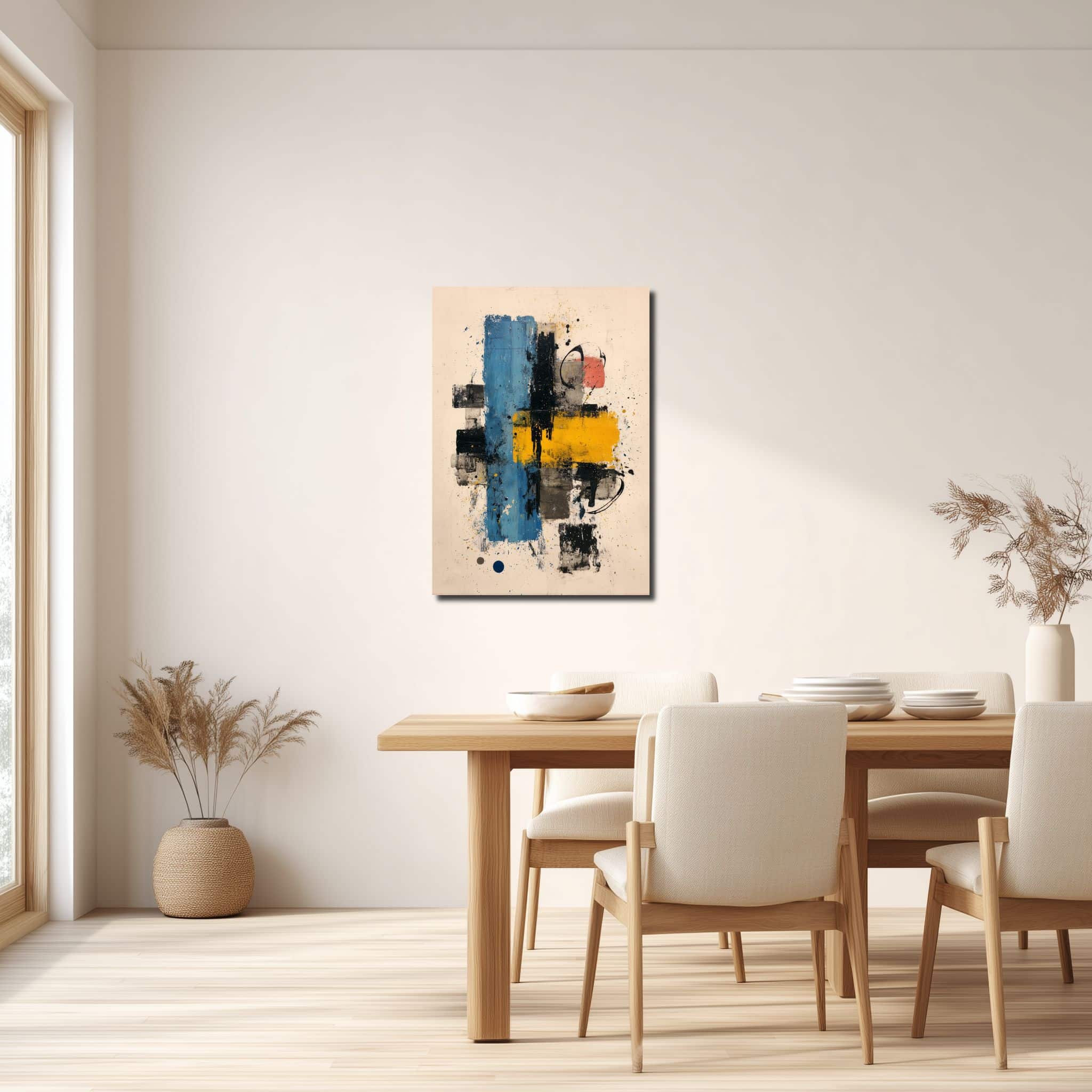 縦に伸びる青い矩形と、横に重なる黄色のブロック。その上を黒い円弧や飛沫が走り、整った形の中に少しラフな動きが残ります。中央に視線が集まりやすい構図ですが、詰まりすぎず、壁の上では余白まで含めて見え方が整う一枚です。ブルー リビング 幾何学アートとしての明快さがありながら、きっちりしすぎない空気も感じられます。