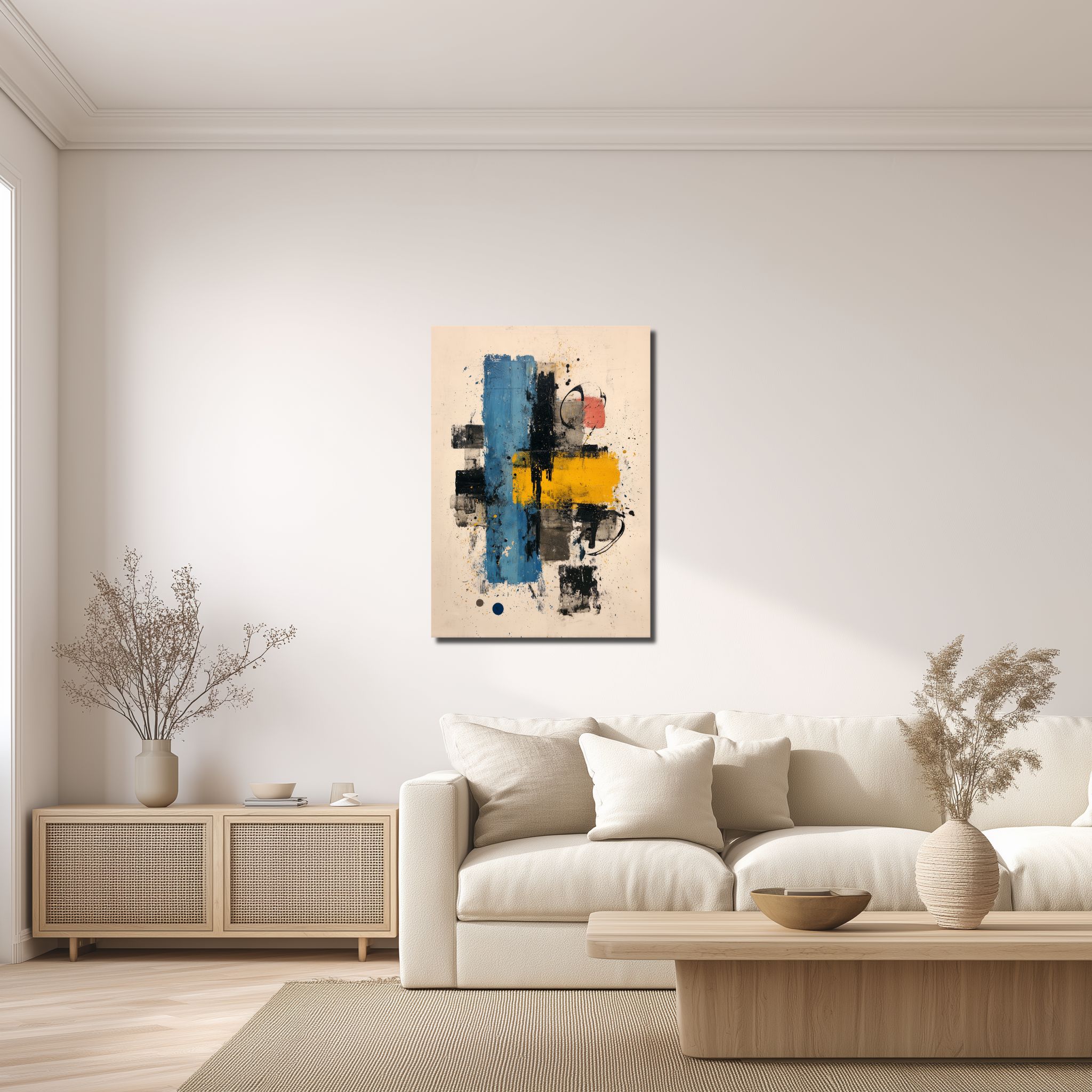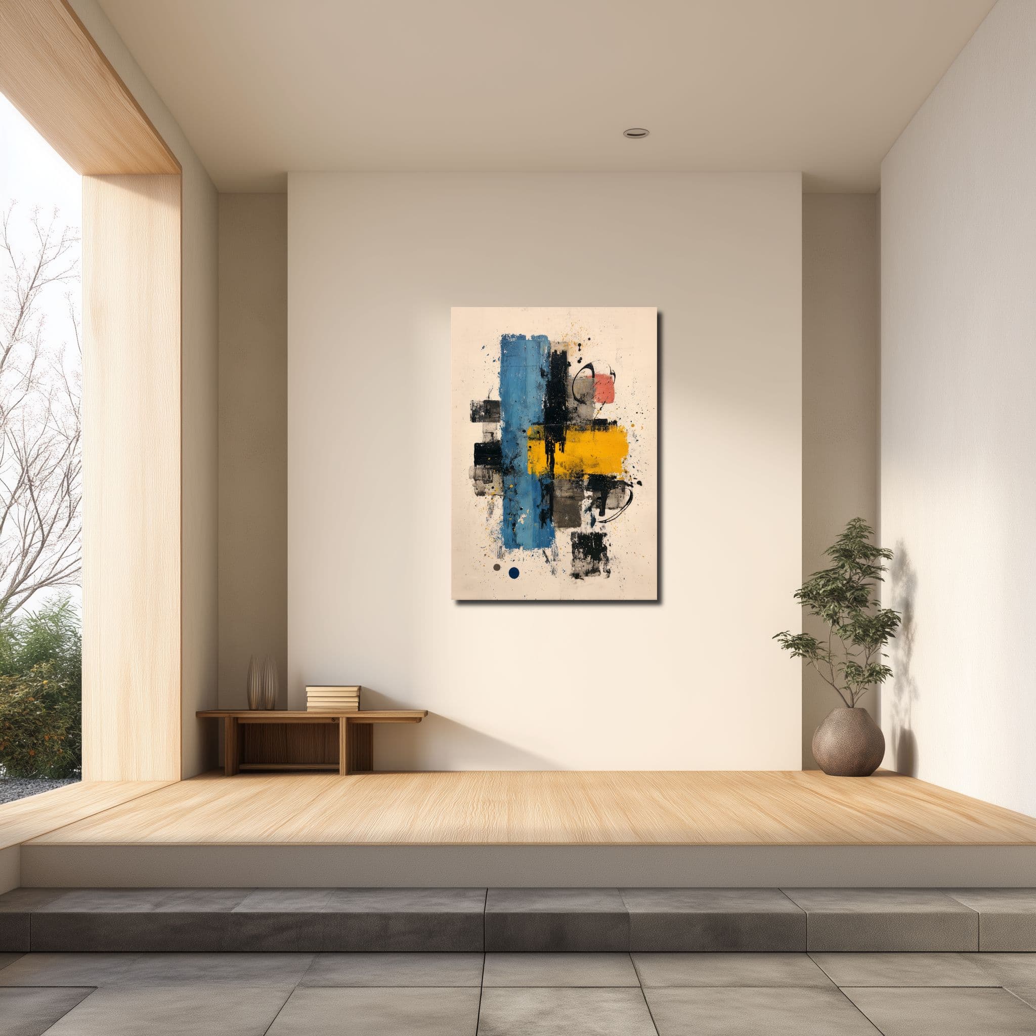 ブルー、イエロー、ブラックを軸にしながら、背景にはグレーやベージュがやわらかく混ざり、色の差が強すぎる印象にはなりません。黒い線は輪郭を引き締めますが、面の重なりには少し擦れたような表情があり、近くでは質感、少し離れると全体のリズムが見えてきます。ブルー リビング 幾何学アートは白壁では色がきれいに浮き、木の色の近くでは壁の明るさをほどよく締めて見せてくれます。