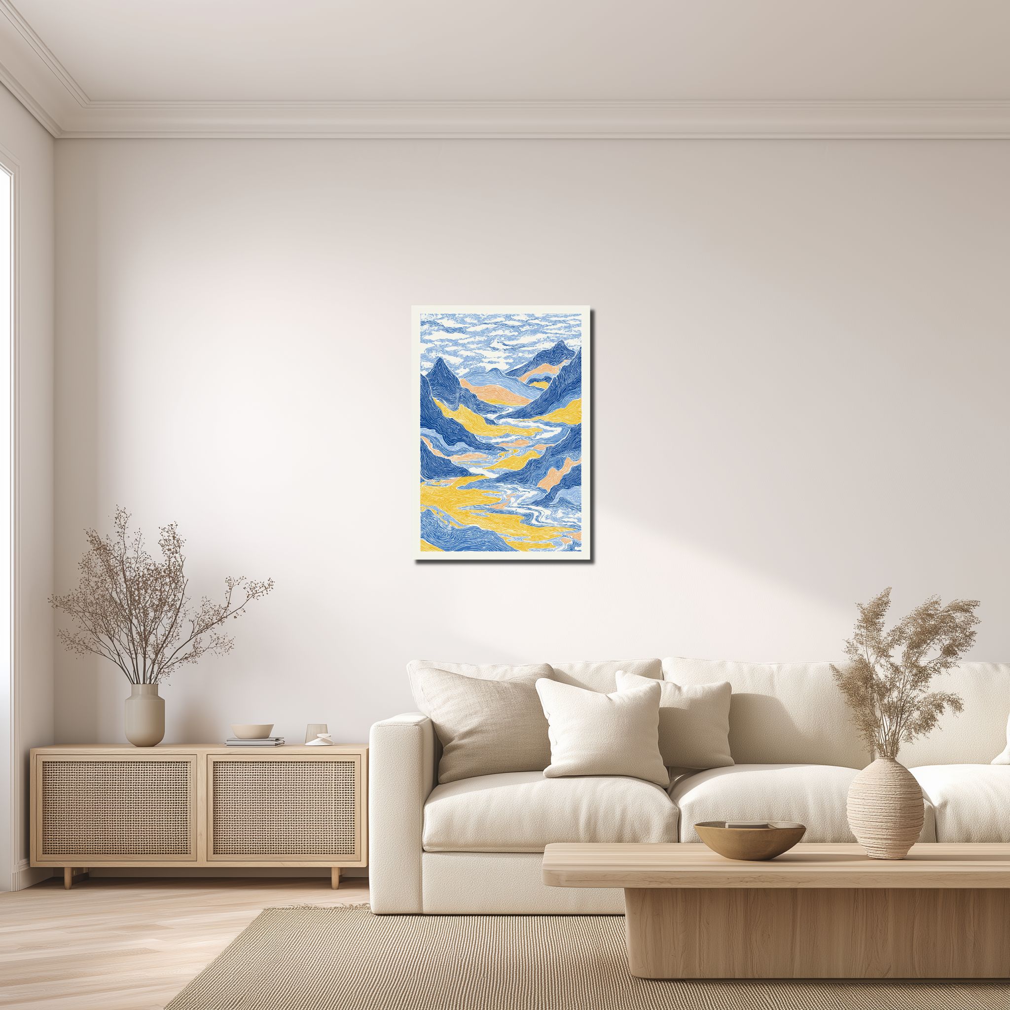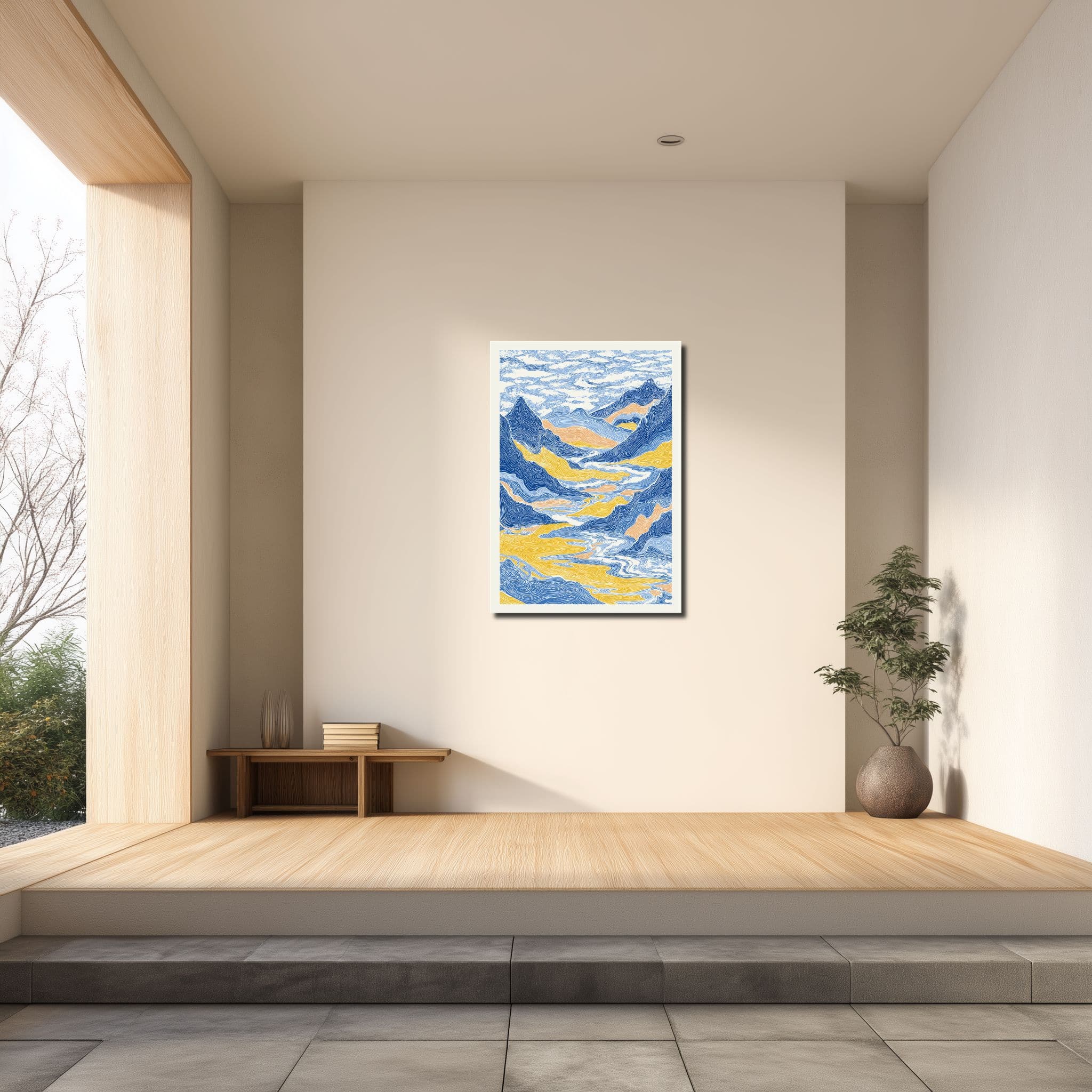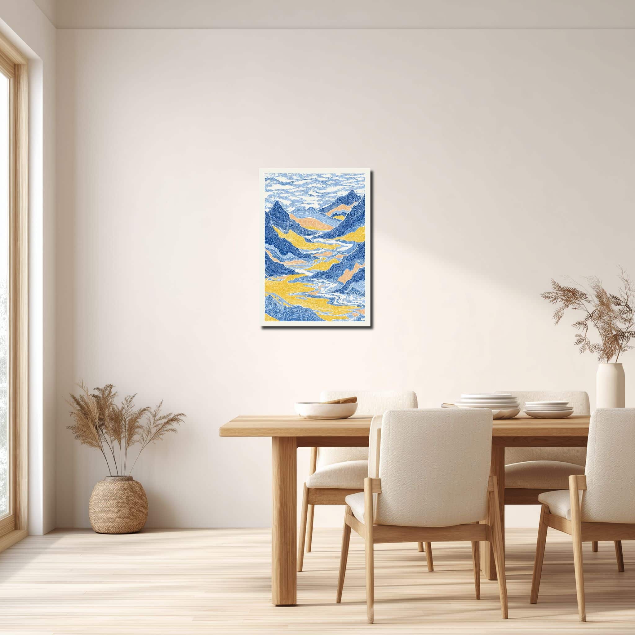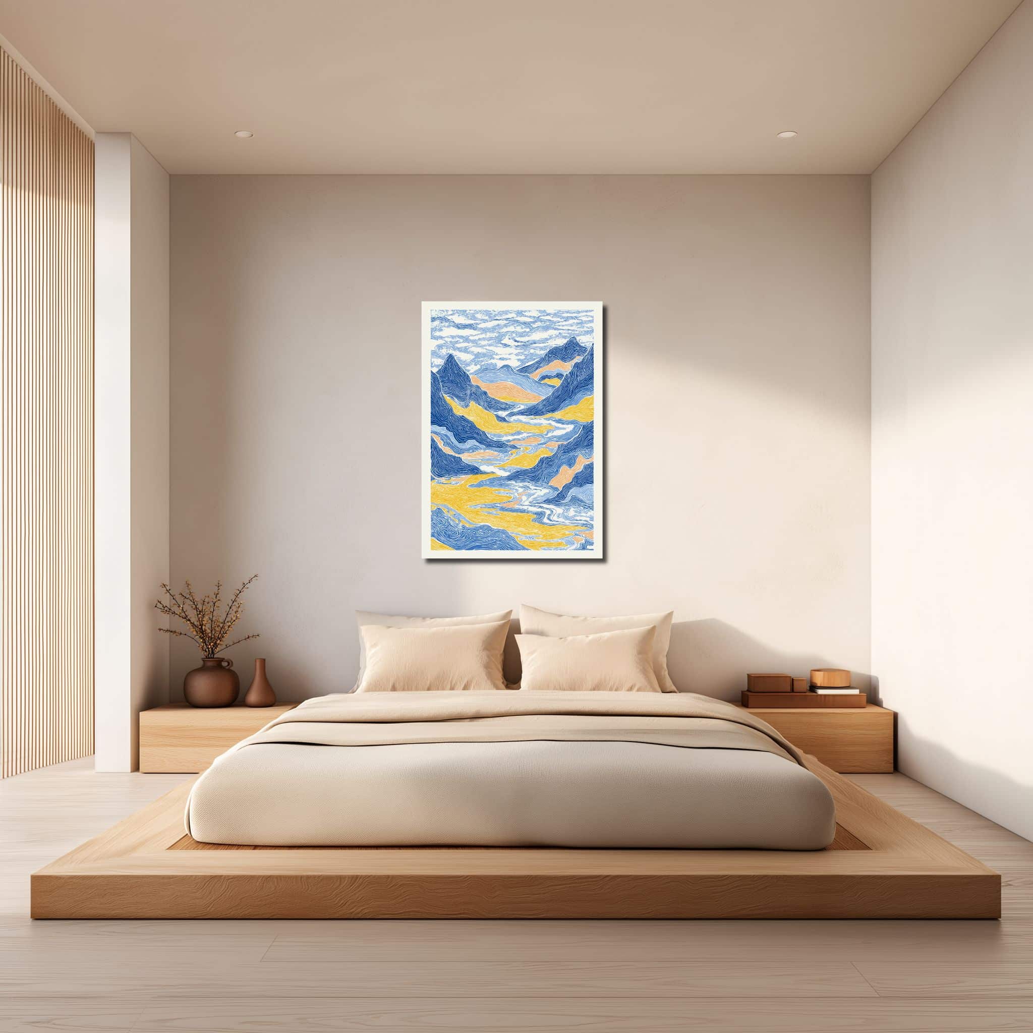 流れるような線で山並みや渓谷、川の気配を重ねた 青い山岳風景 キャンバスアート は、版画のような表情と抽象風景ならではの余白感が魅力です。縦構図の中に奥行きを感じさせる構成が生まれており、壁面に飾るだけで静けさと雄大さが同時に広がる、印象的なアクセントとしてお楽しみいただけます。