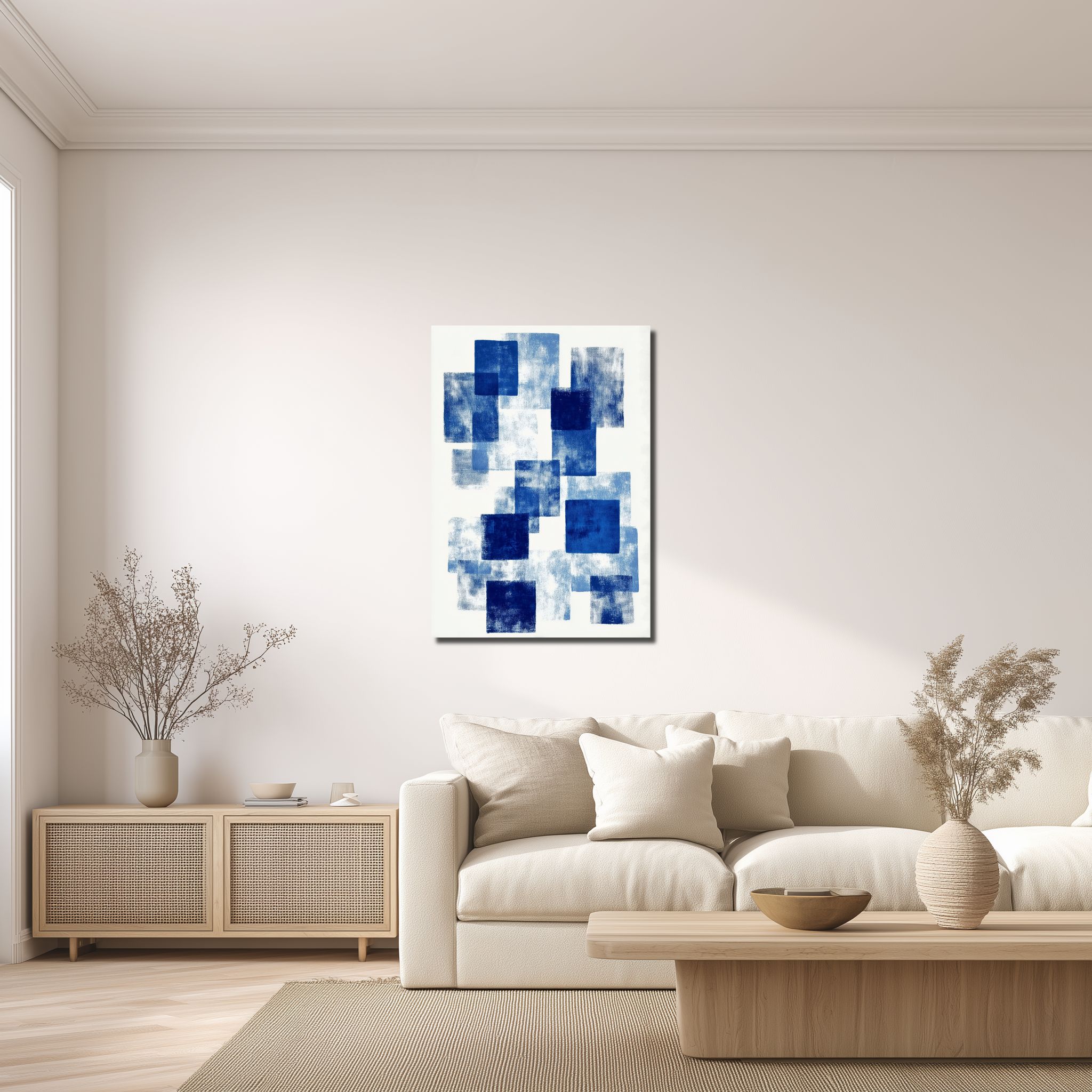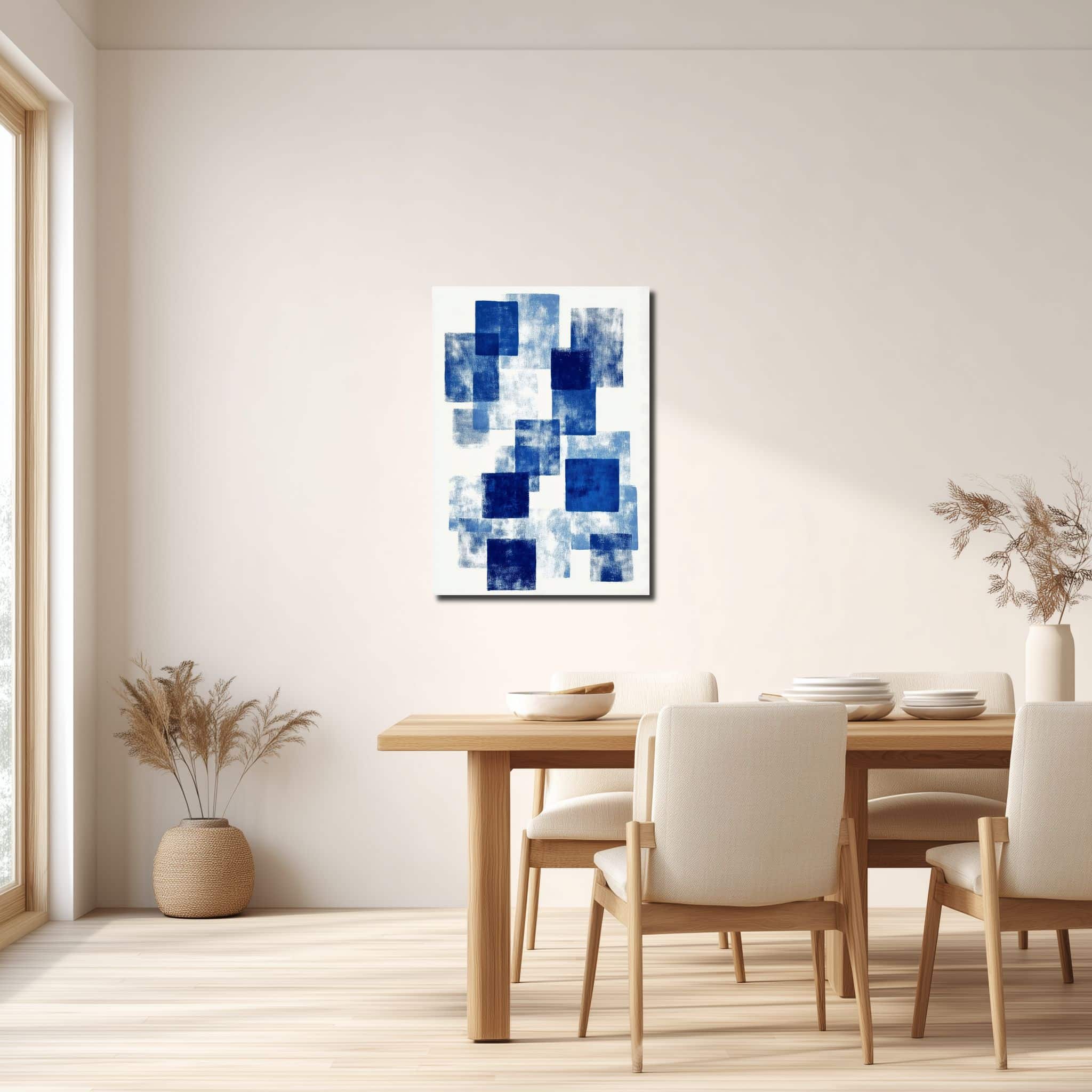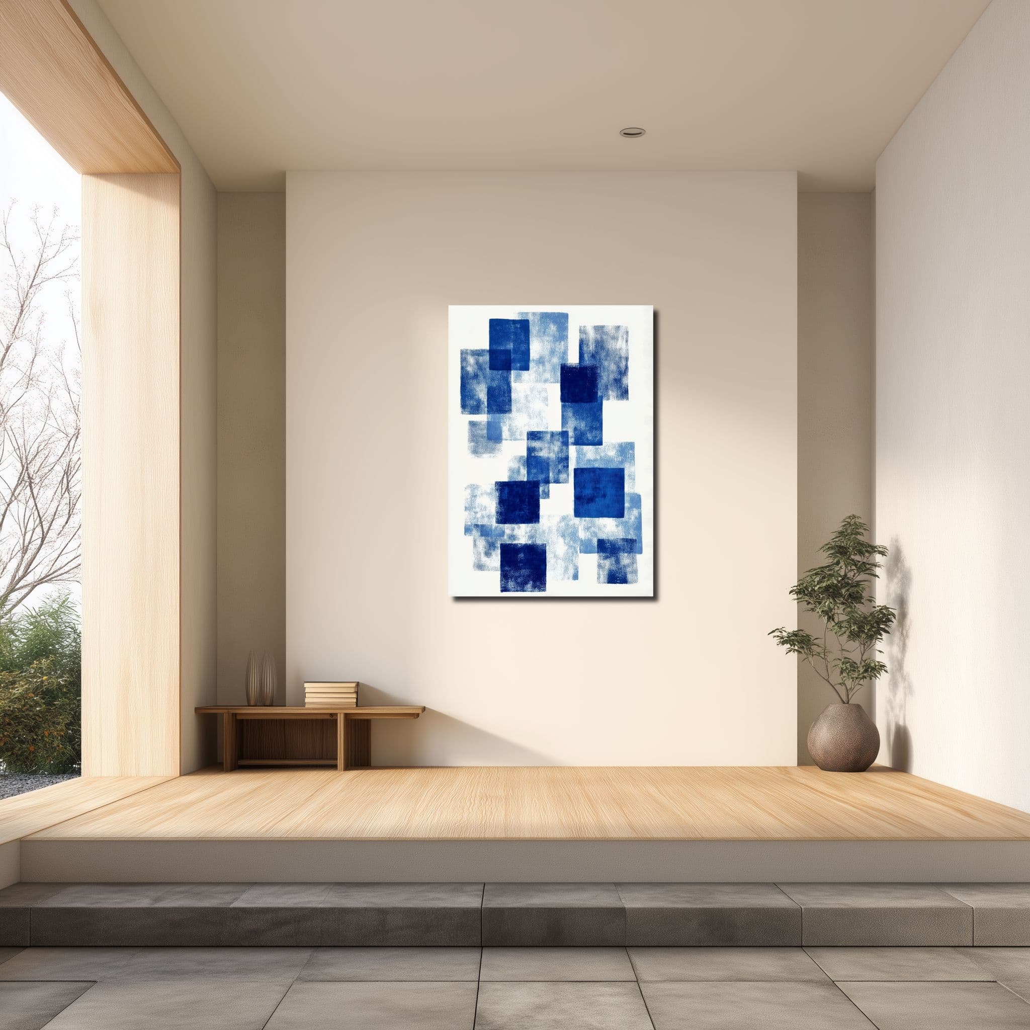 青の矩形レイヤー キャンバスアートを、すっきりとした余白とともに楽しめる縦構図の抽象アートです。