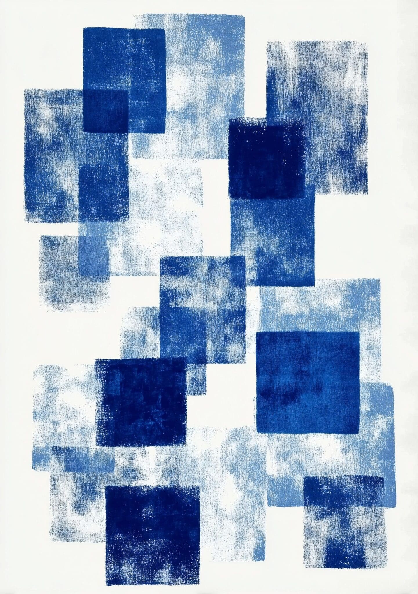 濃紺から淡い青までの矩形を縦方向に重ねた構成が目を引く、静けさのある抽象作品です。版画のようなかすれた表情が整いすぎないニュアンスをつくり、白い余白がその端正さをいっそう際立たせます。青の矩形レイヤー キャンバスアートは、グラフィカルでありながら冷たくなりすぎず、すっきりとした印象で壁面に収まります。
