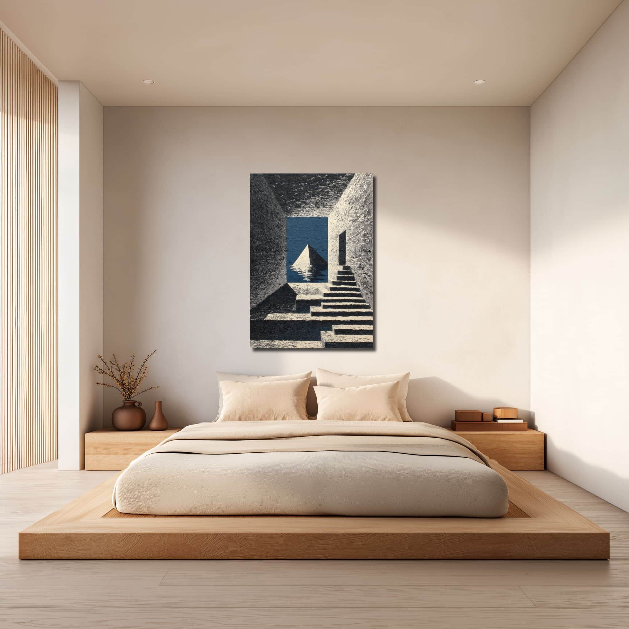 水辺に浮かぶピラミッドと静かに伸びる階段、奥へと視線を導く建築的な構成が魅力の一枚です。版画のような端正さと幻想的な余韻が重なり、青の階段ピラミッド キャンバスアートならではの神秘的な存在感を演出します。縦構図のため壁面をすっきり見せながら、空間に静謐で非現実的なムードを添えてくれます。