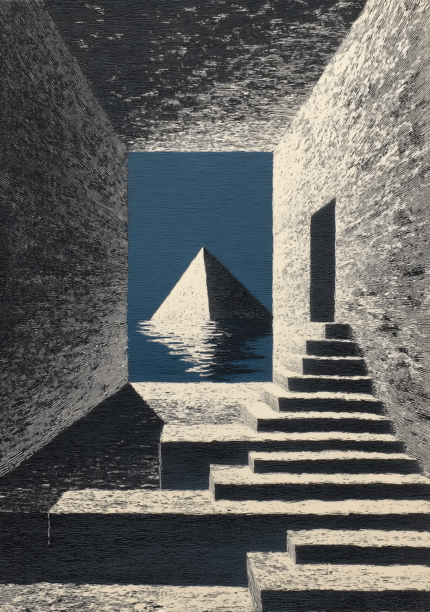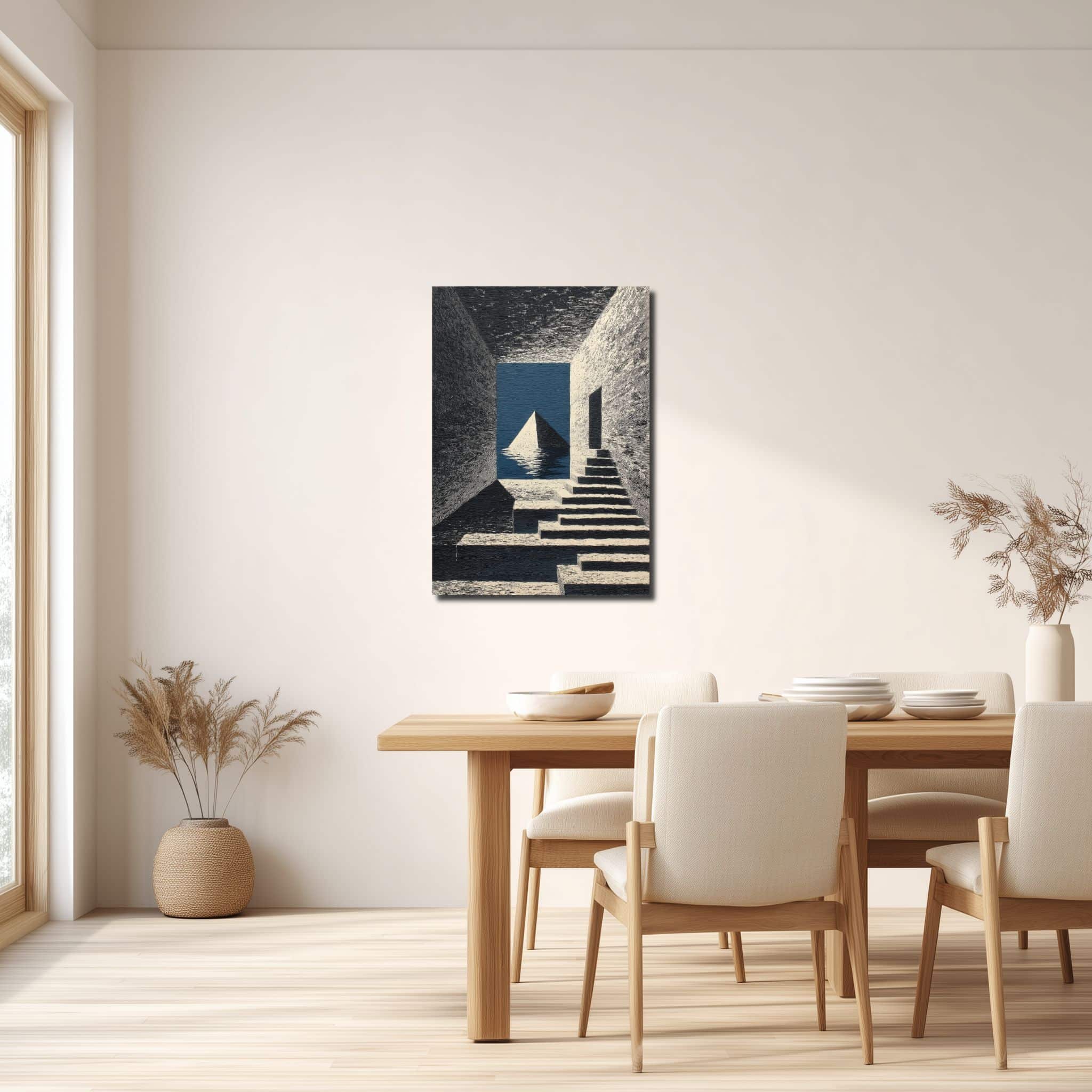 水辺に浮かぶピラミッドと階段を描いた、非現実的で端正な抽象アートです。