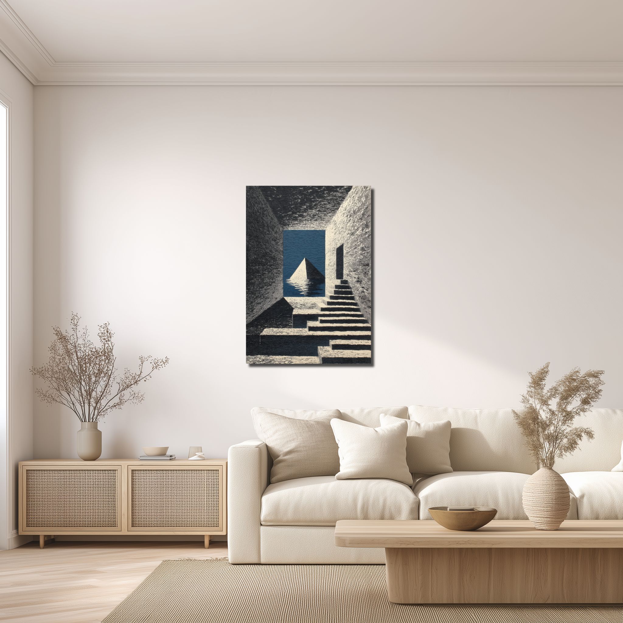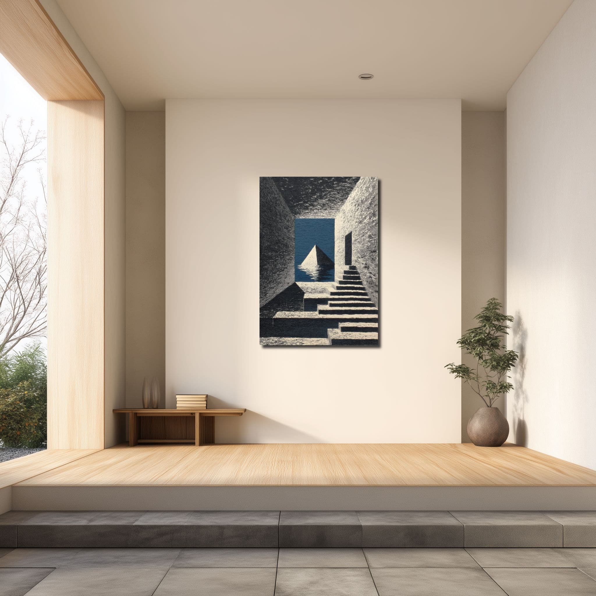黒、白、グレーを基調に、深みのある青が静かに映えるモノトーン調の配色は、落ち着きの中に洗練を感じさせます。明暗のコントラストが階段や開口部の奥行きを美しく際立たせ、青の階段ピラミッド キャンバスアートとして壁面に知的で凛とした印象をもたらします。主張しすぎず、それでいて記憶に残る色の効き方が魅力です。