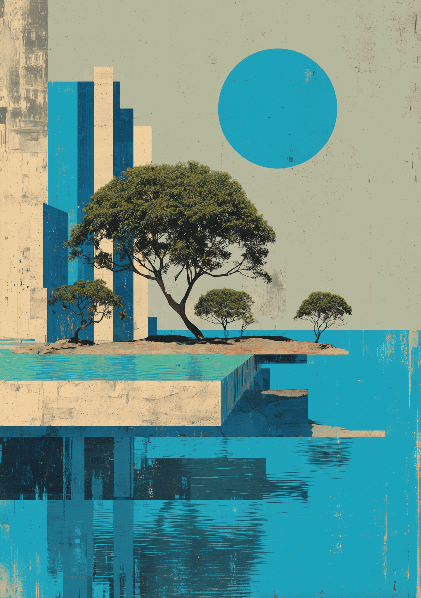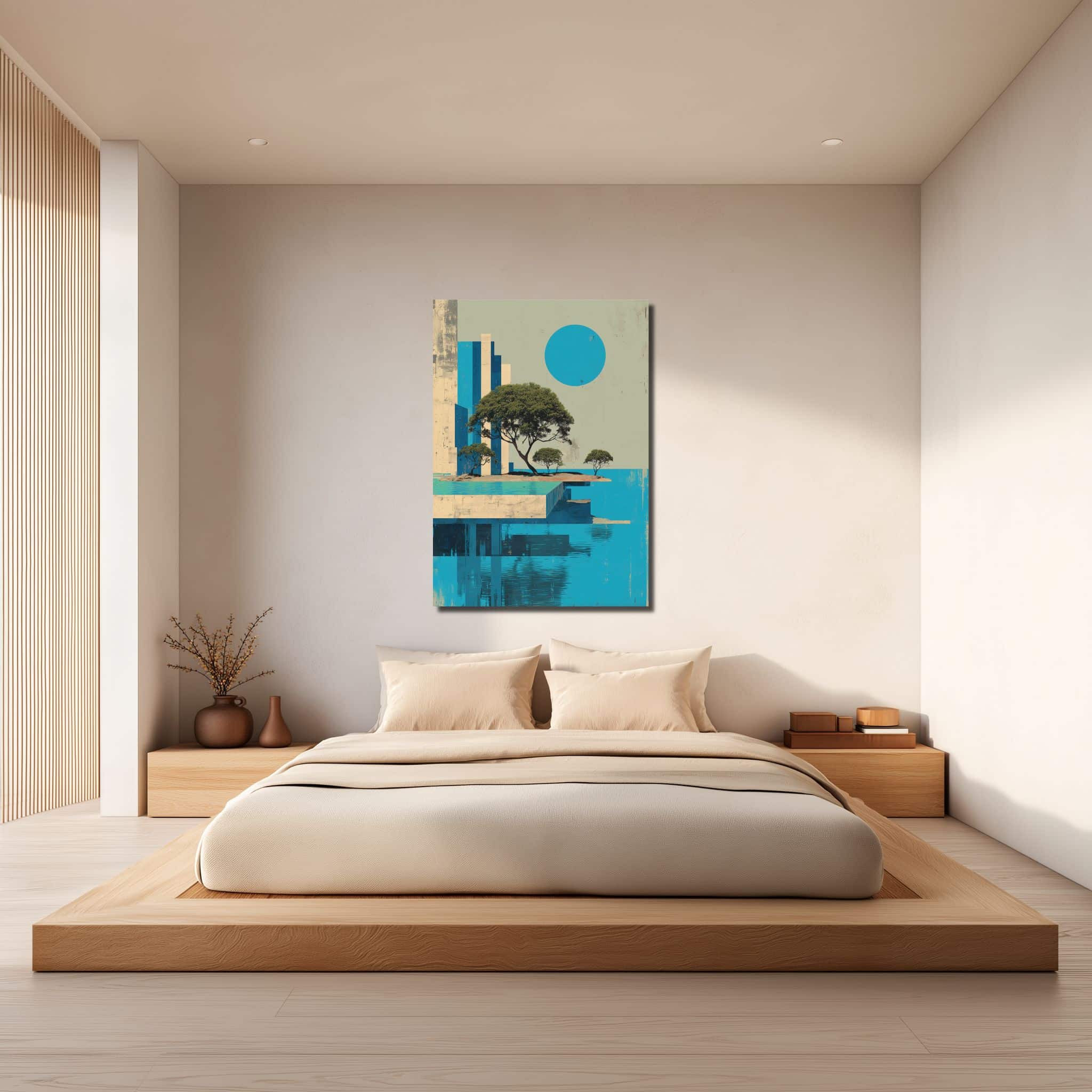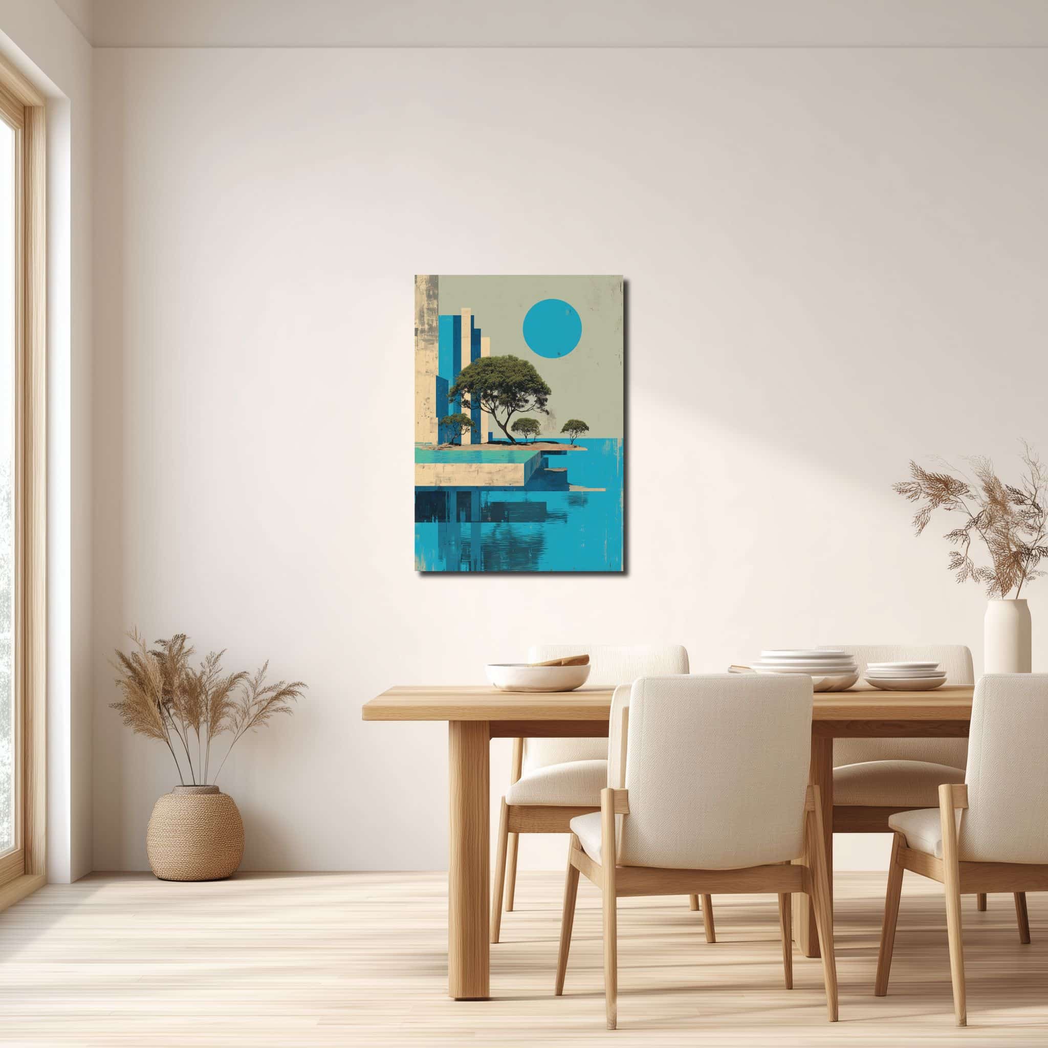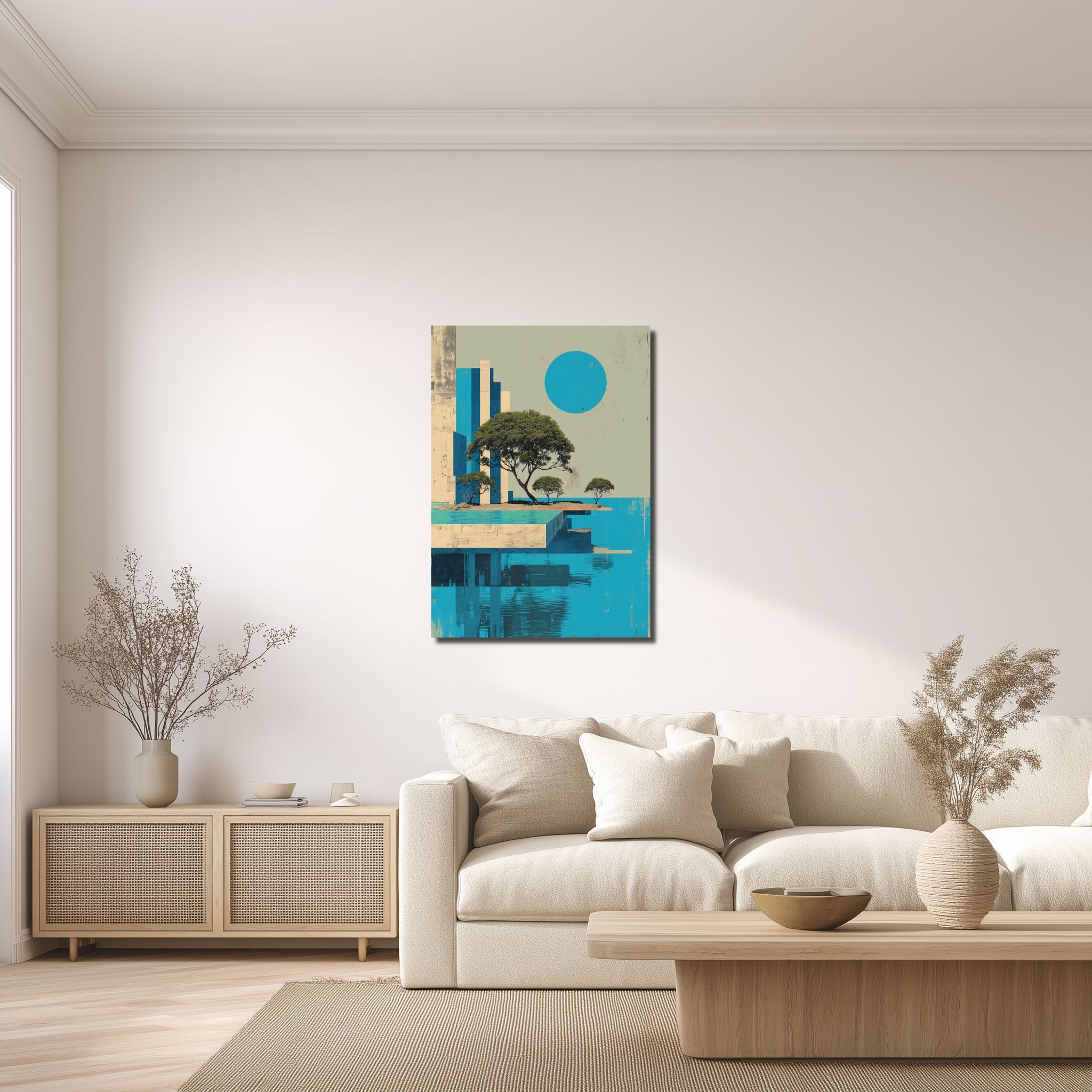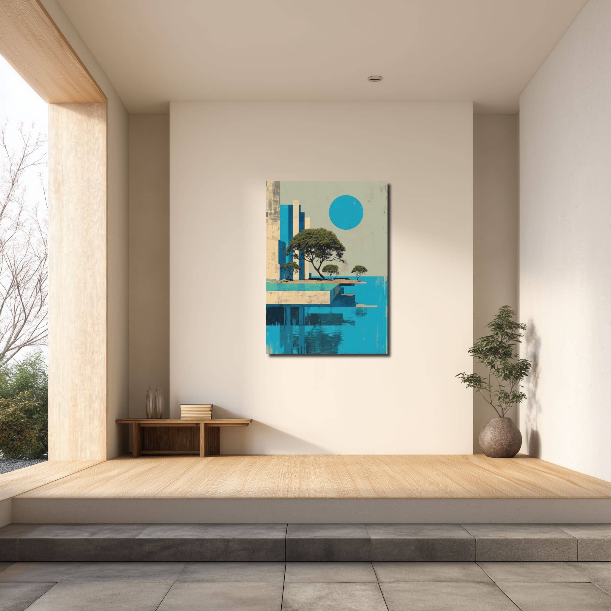 水辺に立つ樹木と、直線で切り取ったような建物の形、そして深い青の円形が静かに視線を引く一枚です。風景をそのまま描くというより、景色の要素を整えて重ねたような構成で、モダン インテリアアートらしい引き締まった空気があります。中央やや左に重心を置いた縦構図なので、壁に掛けると上方向への抜けがきれいに出て、すっきり見えます。