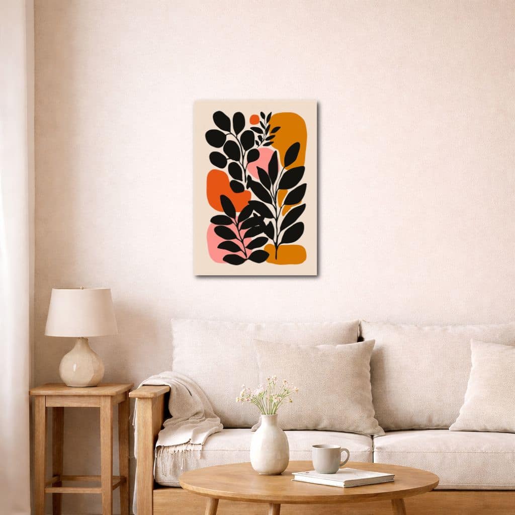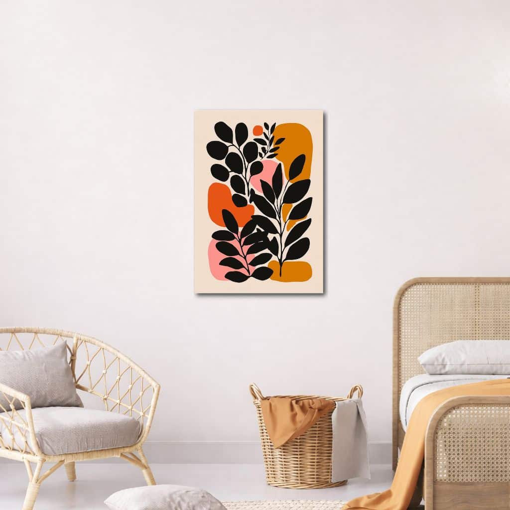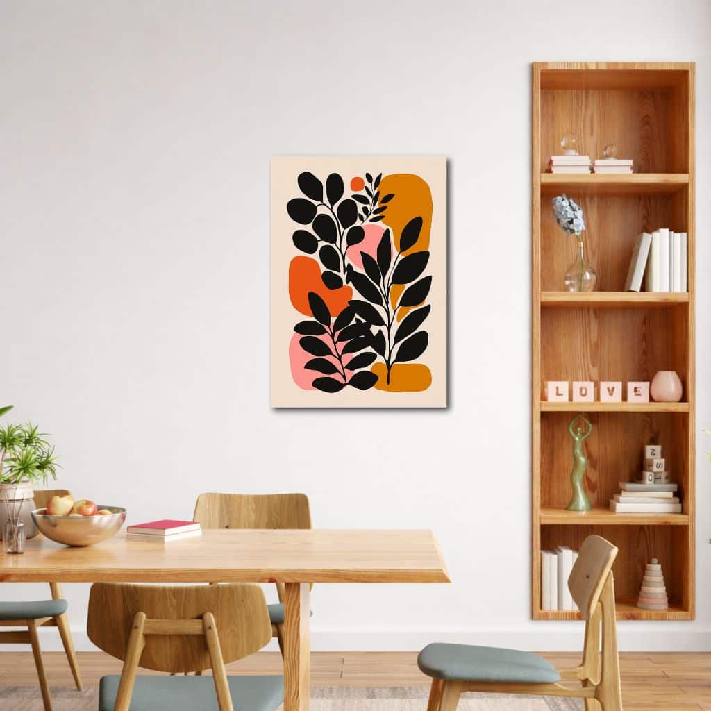 ブラックの引き締まったシルエットに、オレンジやマスタードの温かみ、ピンクのやさしさを合わせることで、ボタニカル キャンバスアートらしい印象的なコントラストが生まれています。色数はありながらも全体は落ち着いたトーンでまとまっているため、華やかさがありつつ派手になりすぎず、空間をすっきり整えながらセンスのある雰囲気へ導いてくれます。