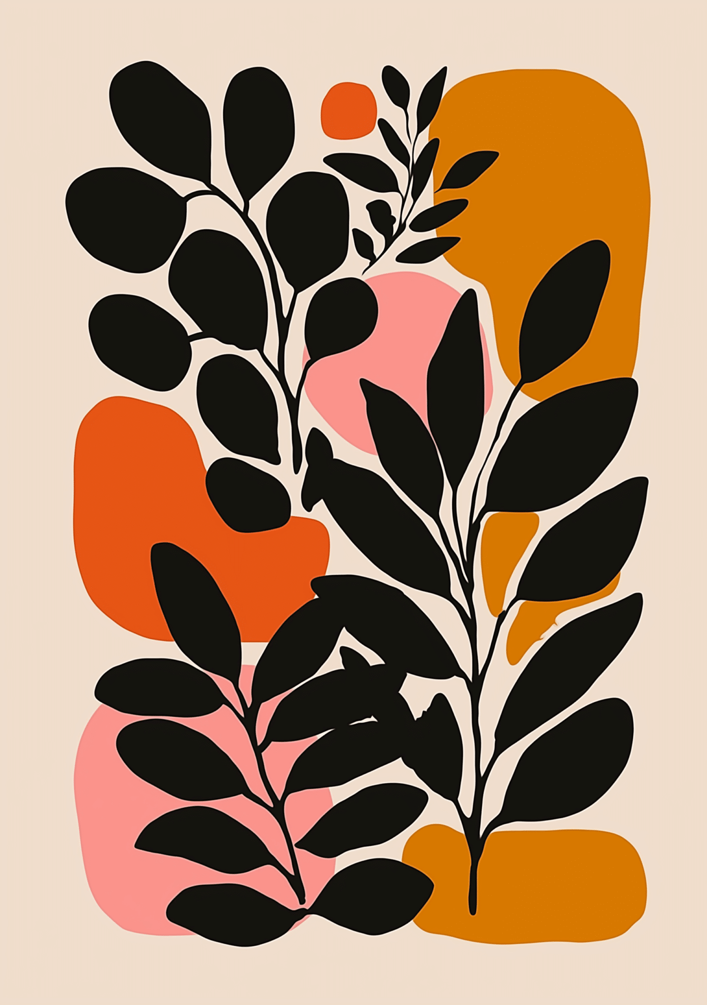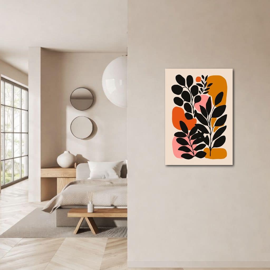 ボタニカル キャンバスアートは、ブラックの葉モチーフを主役に、オレンジやマスタード、ピンクベージュのやわらかな色面を重ねた、北欧ミニマルなモダンアートです。有機的な葉のラインと、抽象的な背景のフォルムが美しく調和し、空間にやさしいリズムと印象的な存在感をもたらします。ボタニカル キャンバスアートならではの、自然のやわらかさとモダンな洗練を同時に楽しめる一枚です。