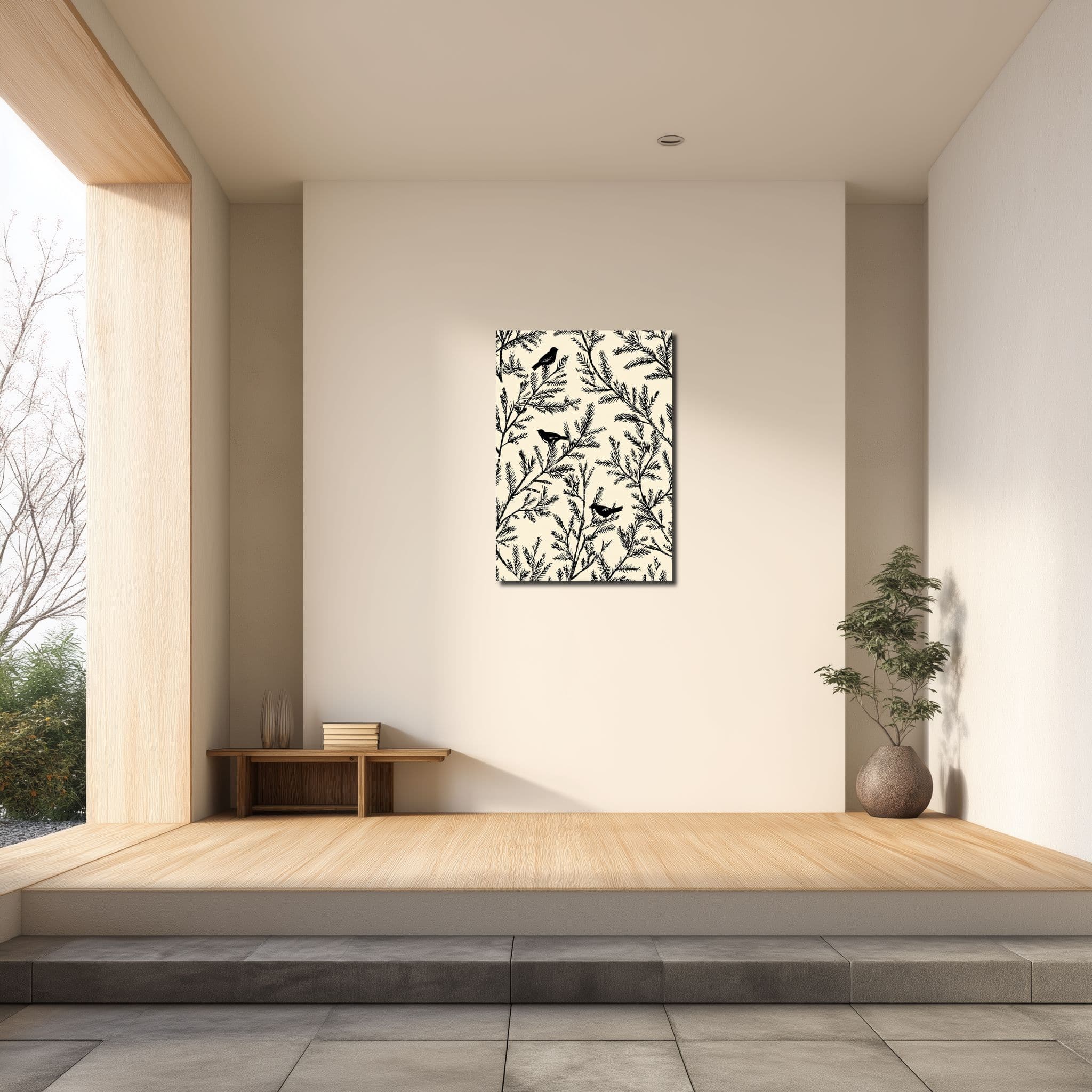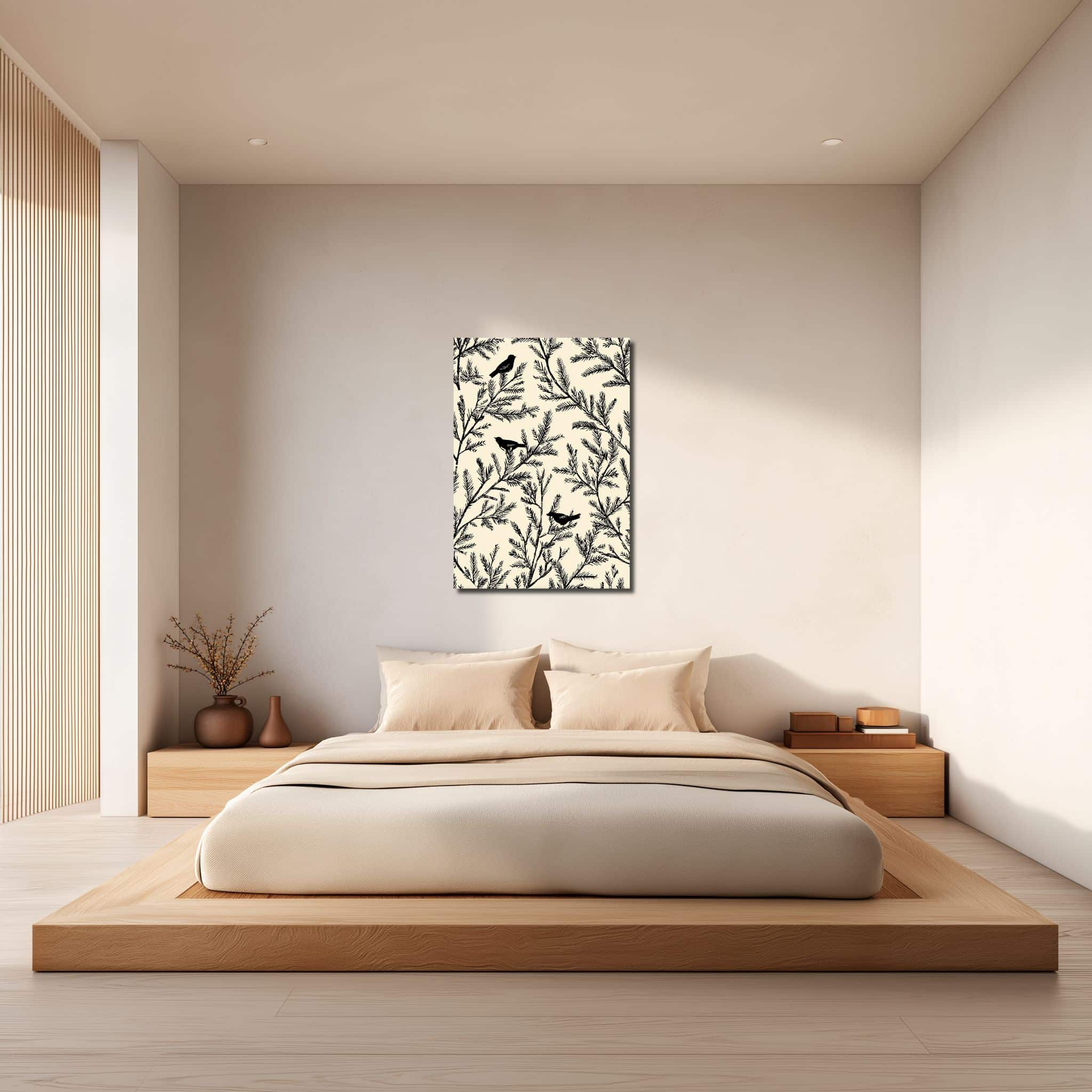 枝葉と小鳥のシルエットが印象的な、北欧ミニマル ボタニカル キャンバスアートです。