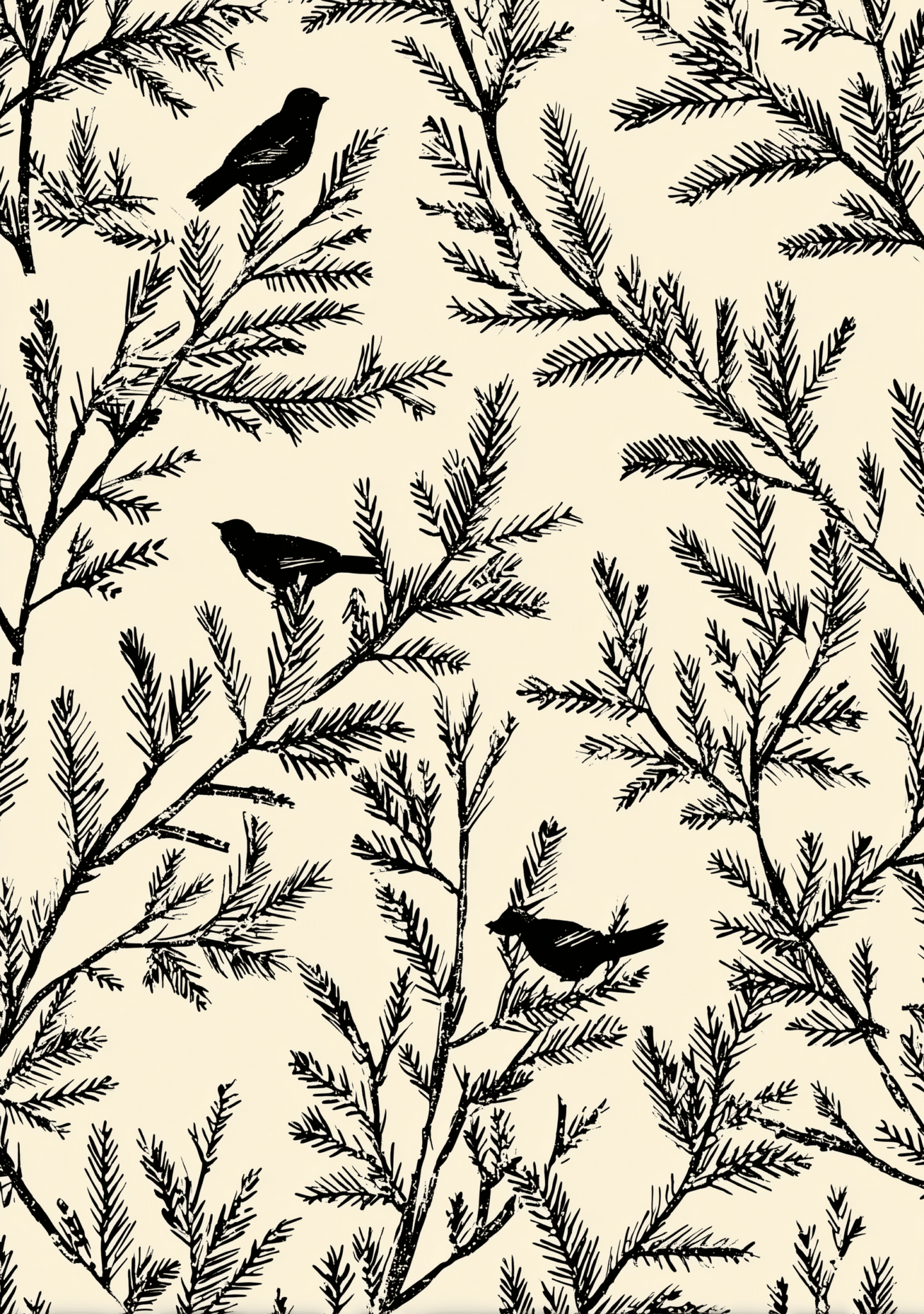 繊細な枝葉の広がりと小鳥のモチーフが心地よい余白を生み、