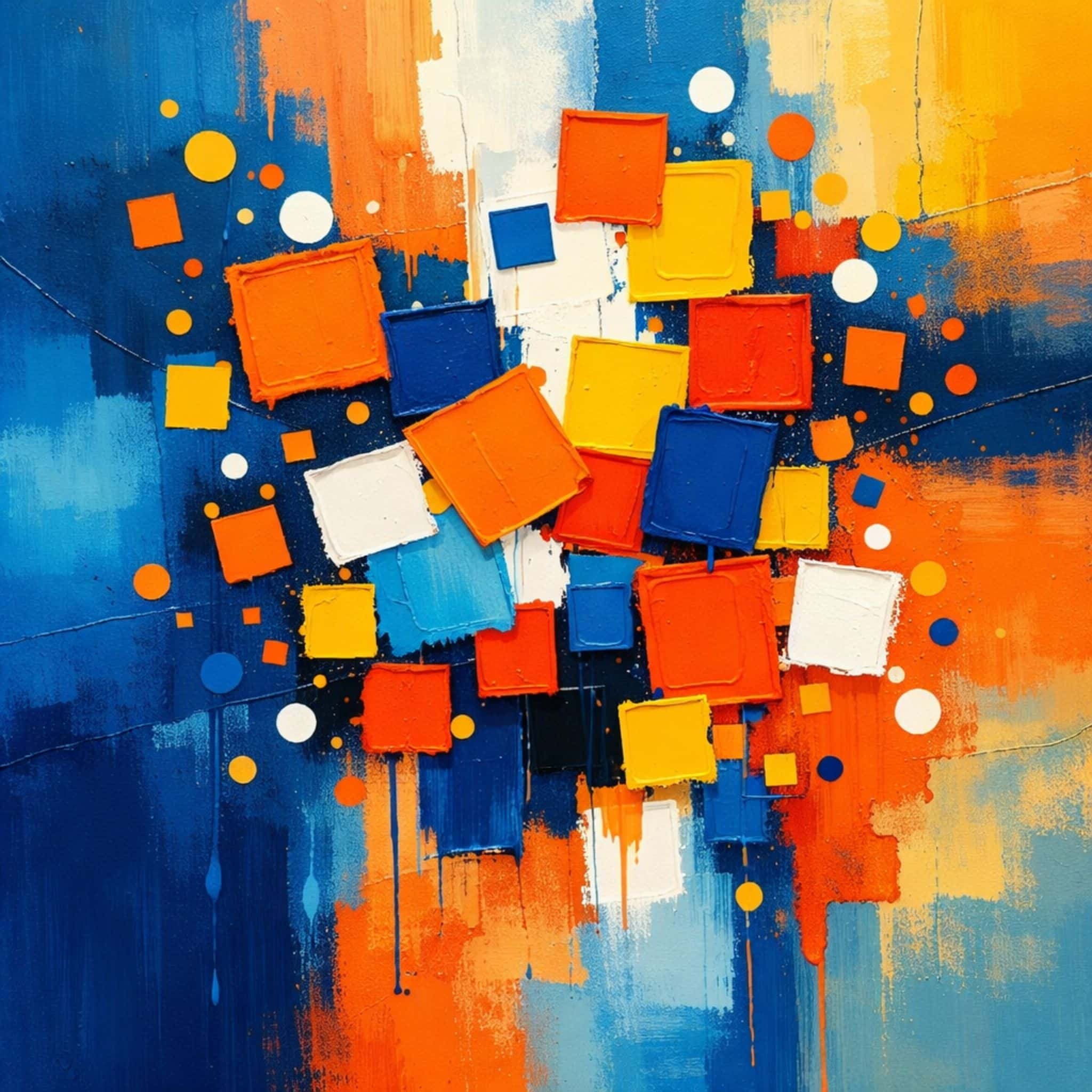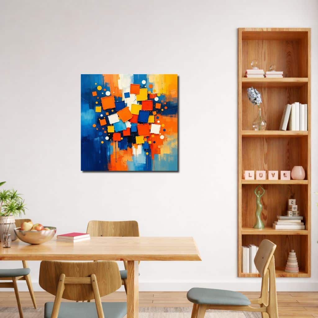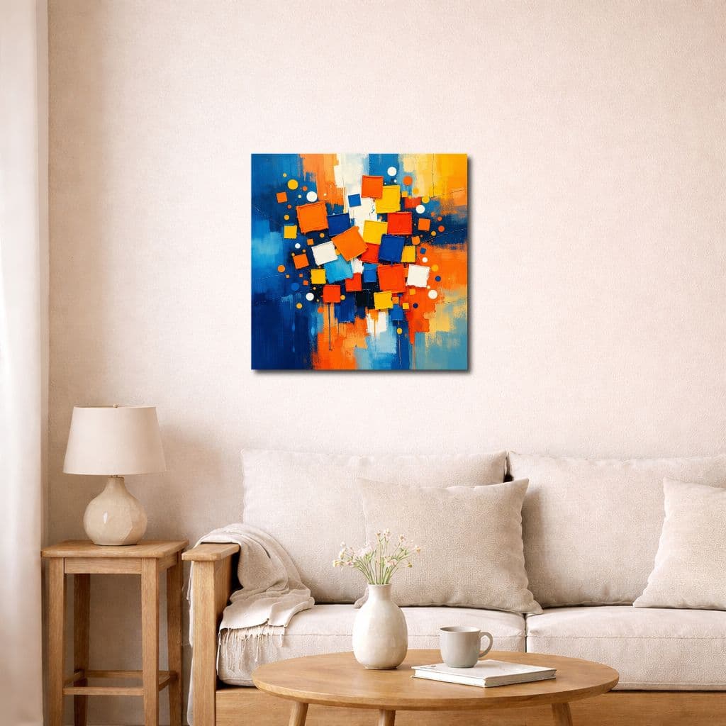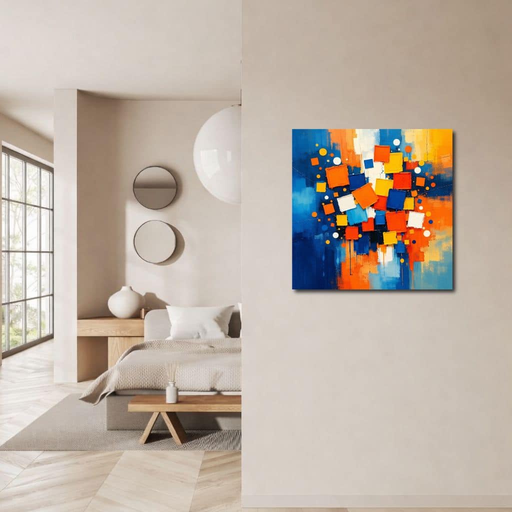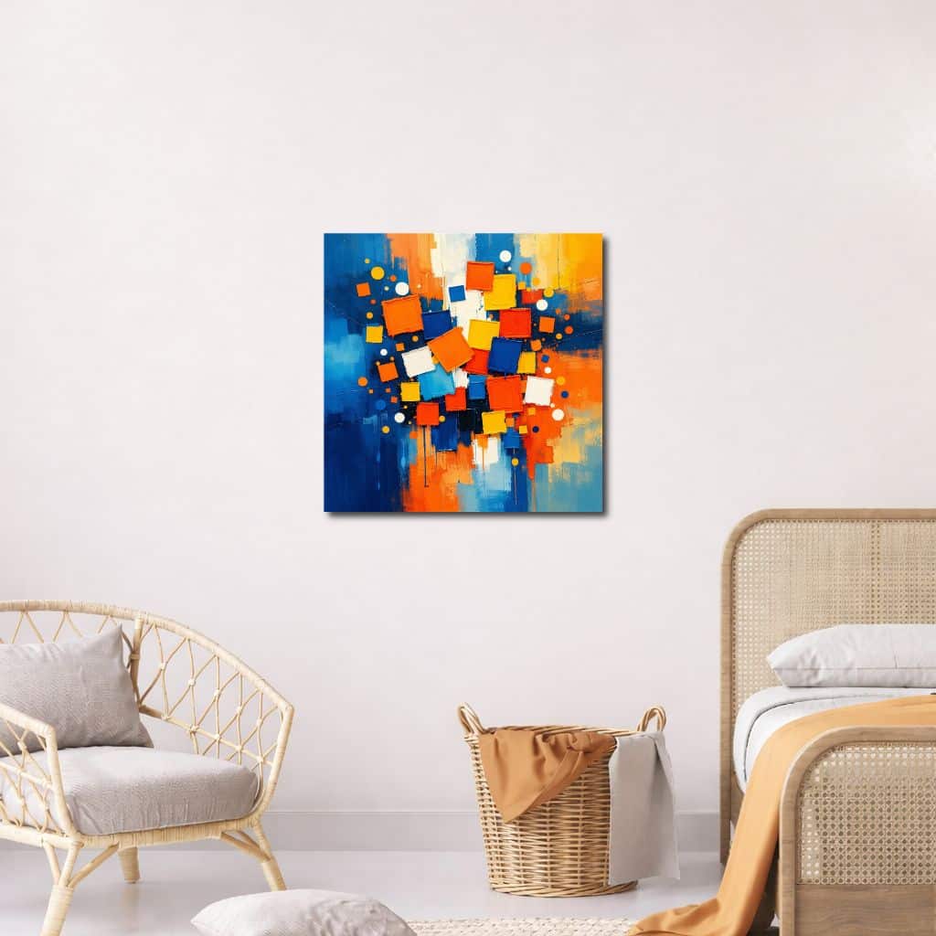 ブルーを基調に、オレンジ・イエロー・ホワイトの立体感あるスクエアモチーフを重ねた、躍動感のあるモダンアートです。
