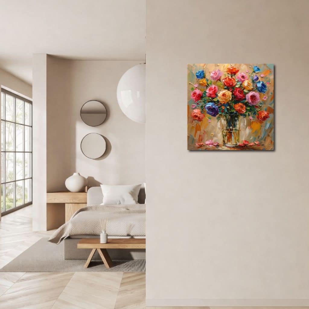 ピンクやレッド、オレンジを中心に、ブルーやパープルのアクセントを重ねることで、カラーローズ キャンバスアートならではの印象的なコントラストを空間に与えます。華やかさがありながらも色のバランスがやわらかく、お部屋を明るく見せつつ、上品で心地よい雰囲気へ整えてくれる一枚です。