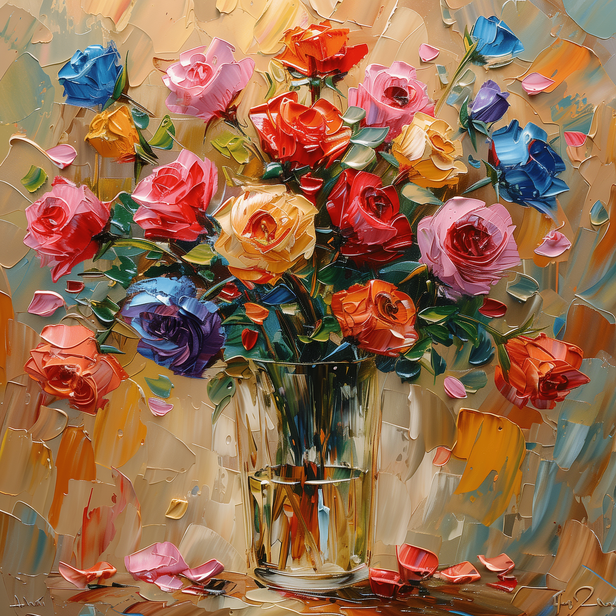 カラーローズ キャンバスアートは、ピンク・レッド・オレンジ・ブルー・パープルのローズブーケが印象的に広がる、華やかなモダンフラワーアートです。やわらかな背景の中に鮮やかな花々が立体感をもって咲き重なり、空間に彩りと上品な高揚感をもたらします。カラーローズ キャンバスアートならではの、華やかさと洗練されたやさしさを楽しめる一枚です。