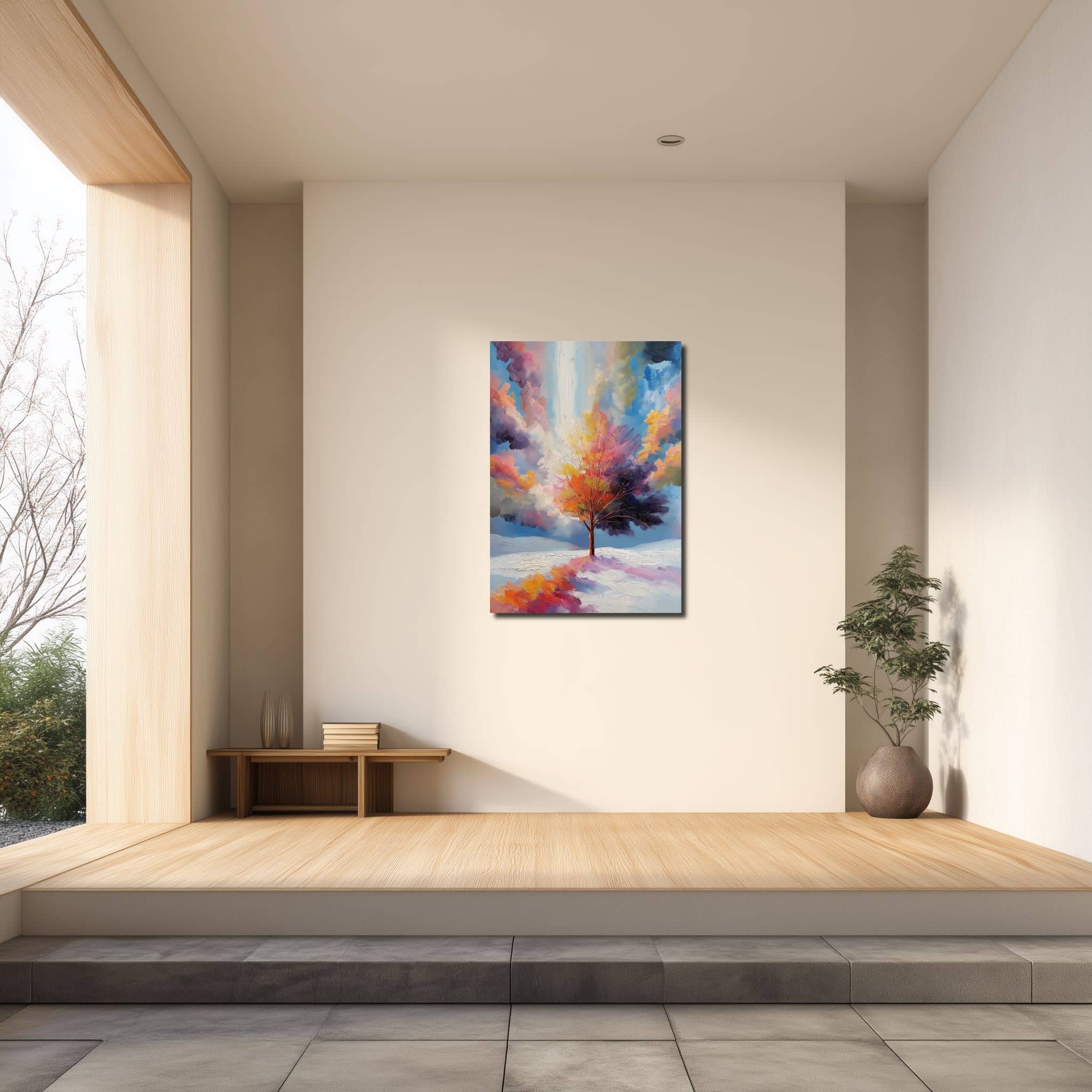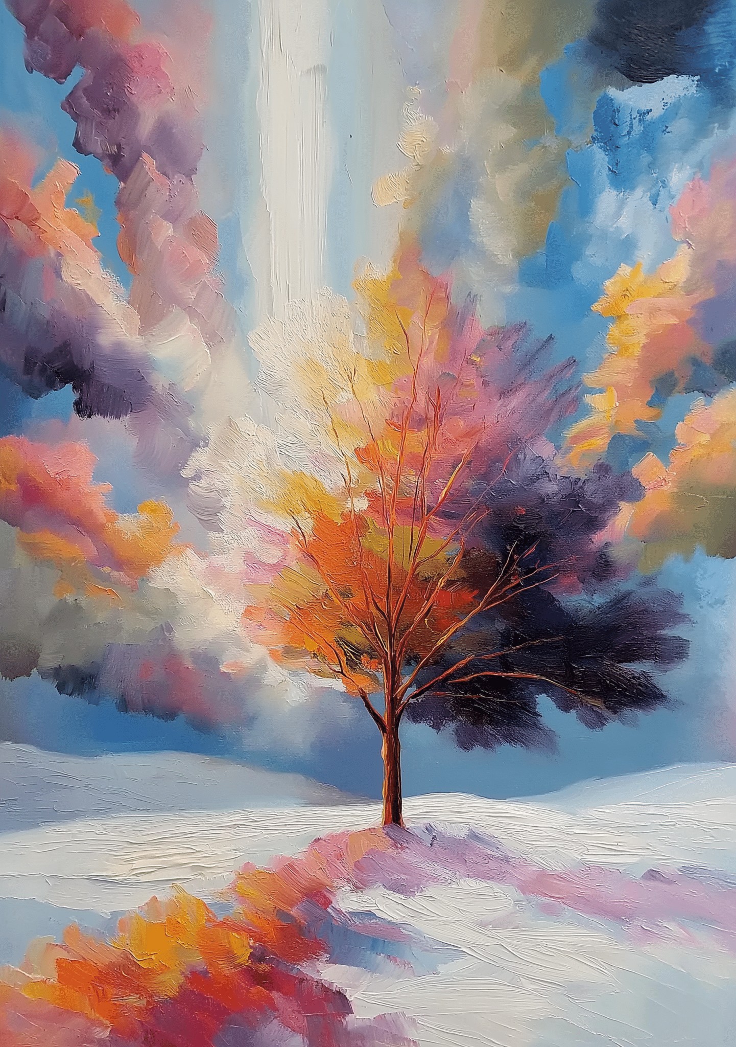 中央にすっと立つ一本の木を主役に、雪原の静けさと光に満ちた空を重ねた幻想的な一本木風景 キャンバスアート。印象派風のやわらかな筆致と油彩のような豊かなテクスチャが重なり合い、縦構図ならではの伸びやかさを引き立てます。余白を活かした構成が圧迫感を抑えながら、見るたびに静寂と希望を感じさせる一枚として、空間にやさしい存在感を添えてくれます。