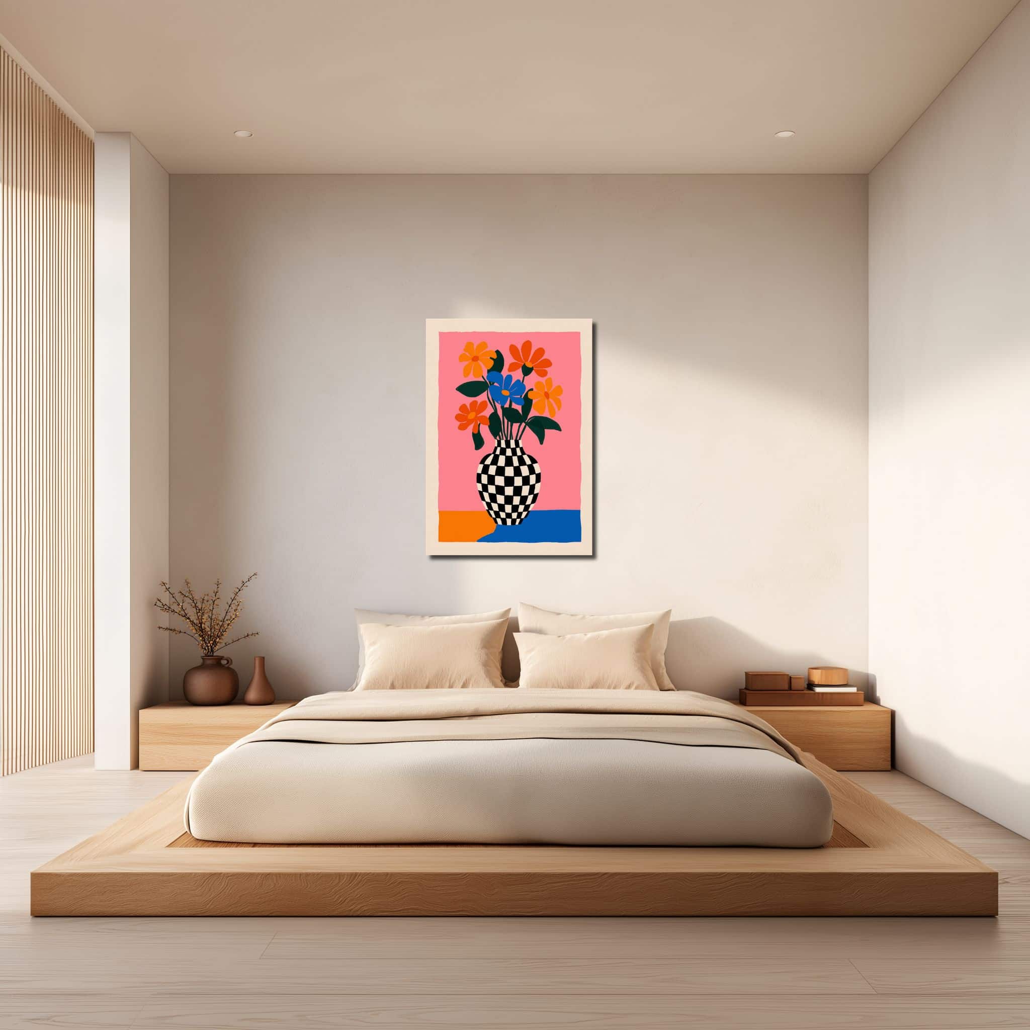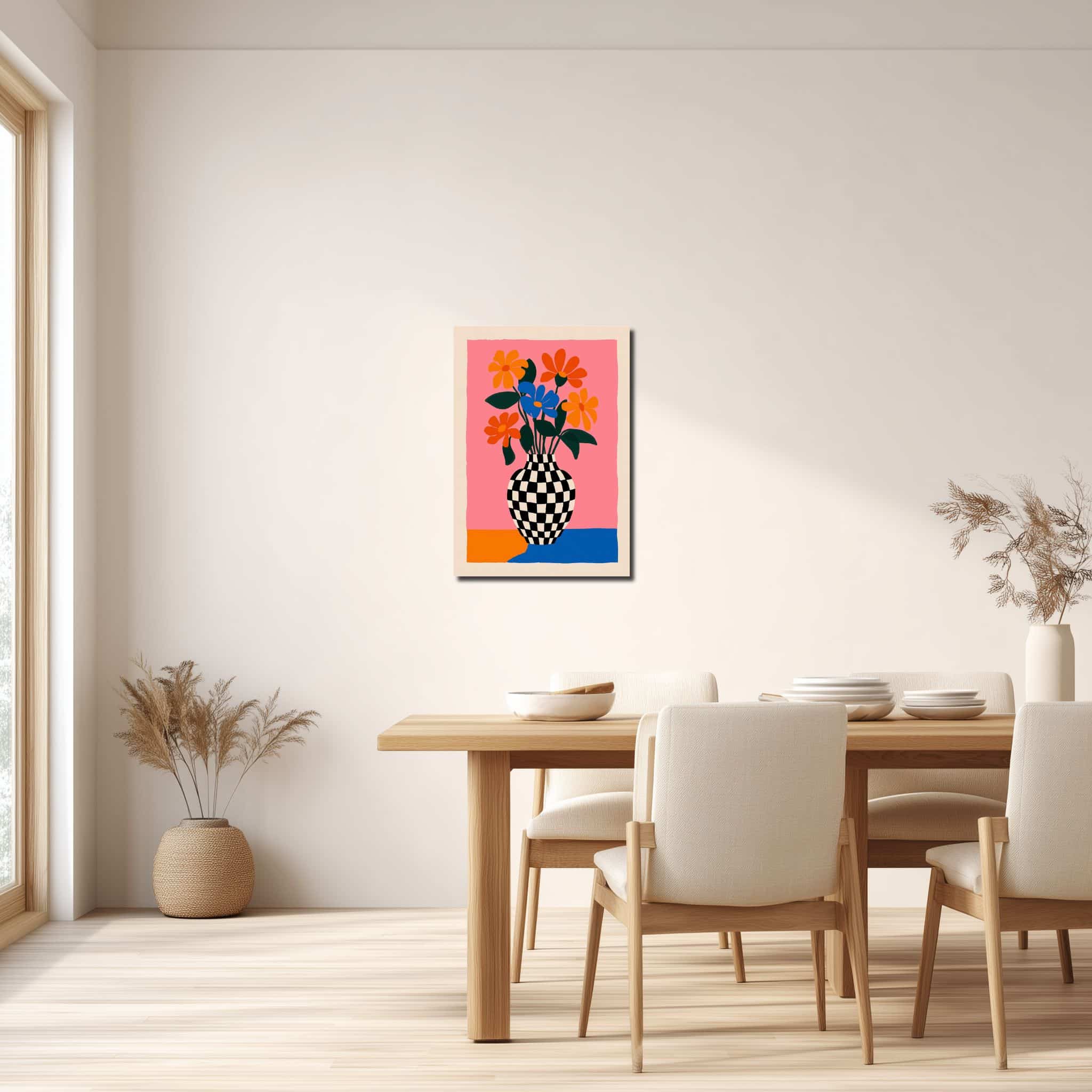 チェッカー柄の花瓶と鮮やかな花々が印象的な、北欧ミニマル フラワー キャンバスアートです。