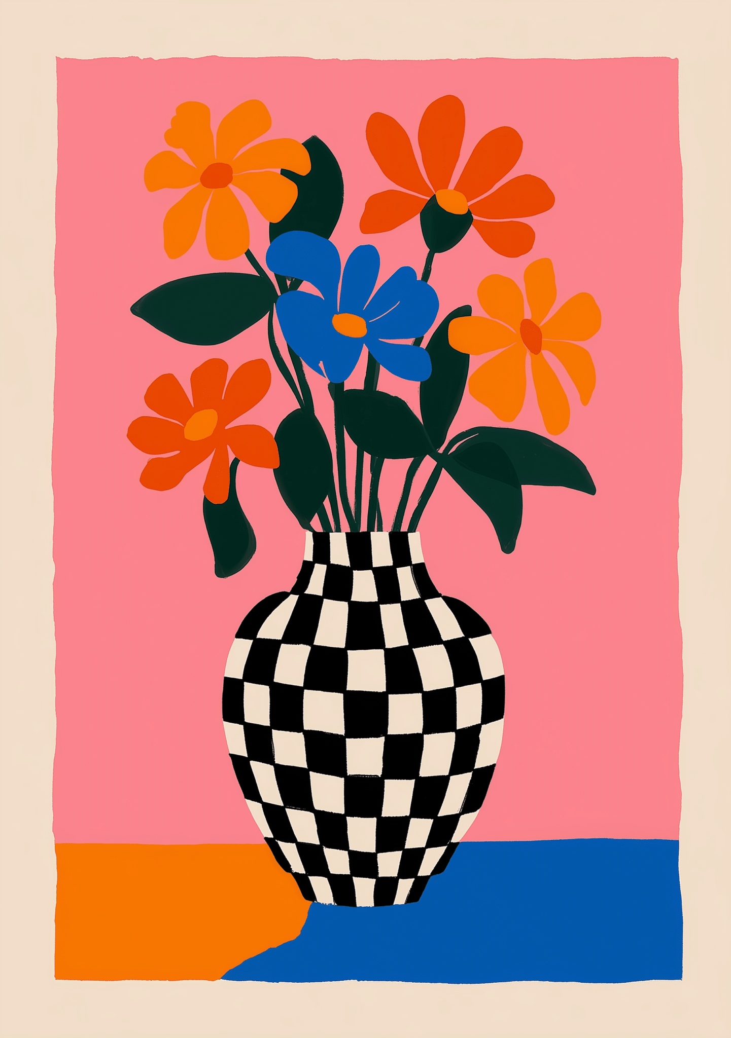 フラワー キャンバスアートは、ピンクの背景に、オレンジやブルーの花々、ブラックの葉、そして印象的なチェッカー柄の花瓶を組み合わせた、明るくモダンな一枚です。シンプルな花のフォルムと大胆な配色が美しく調和し、空間に軽やかな華やぎと楽しいリズムをもたらします。フラワー キャンバスアートならではの、可愛らしさと洗練を同時に楽しめるデザインです。