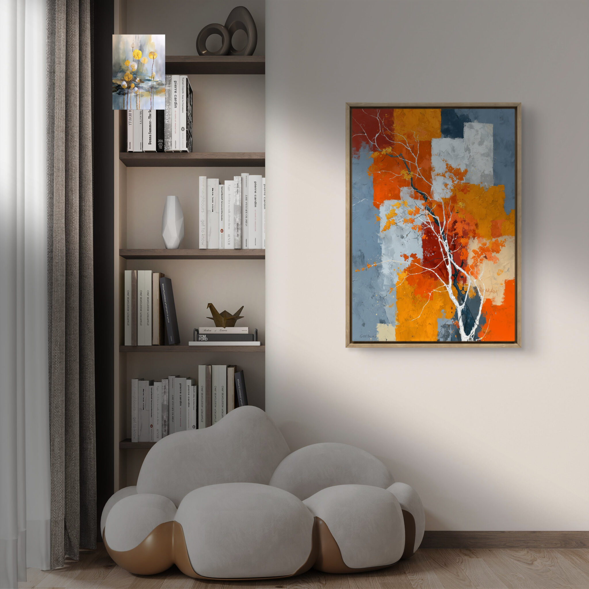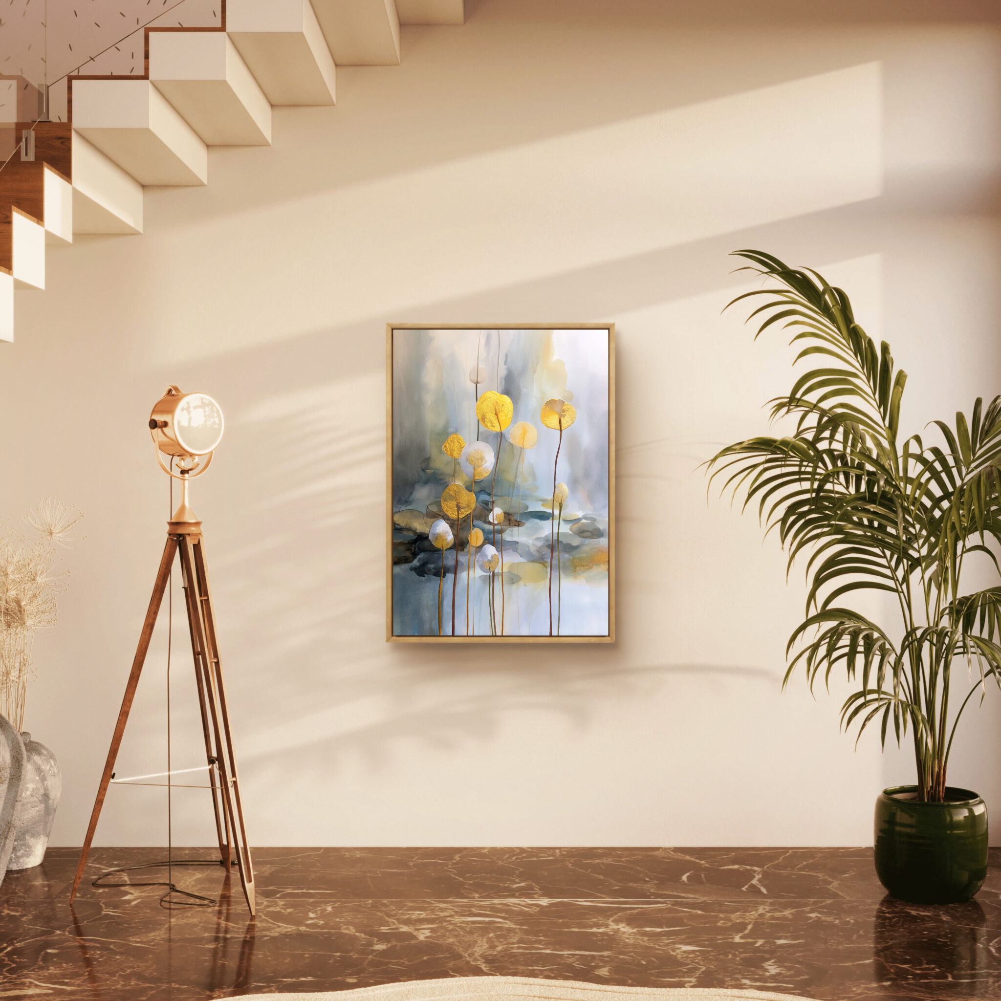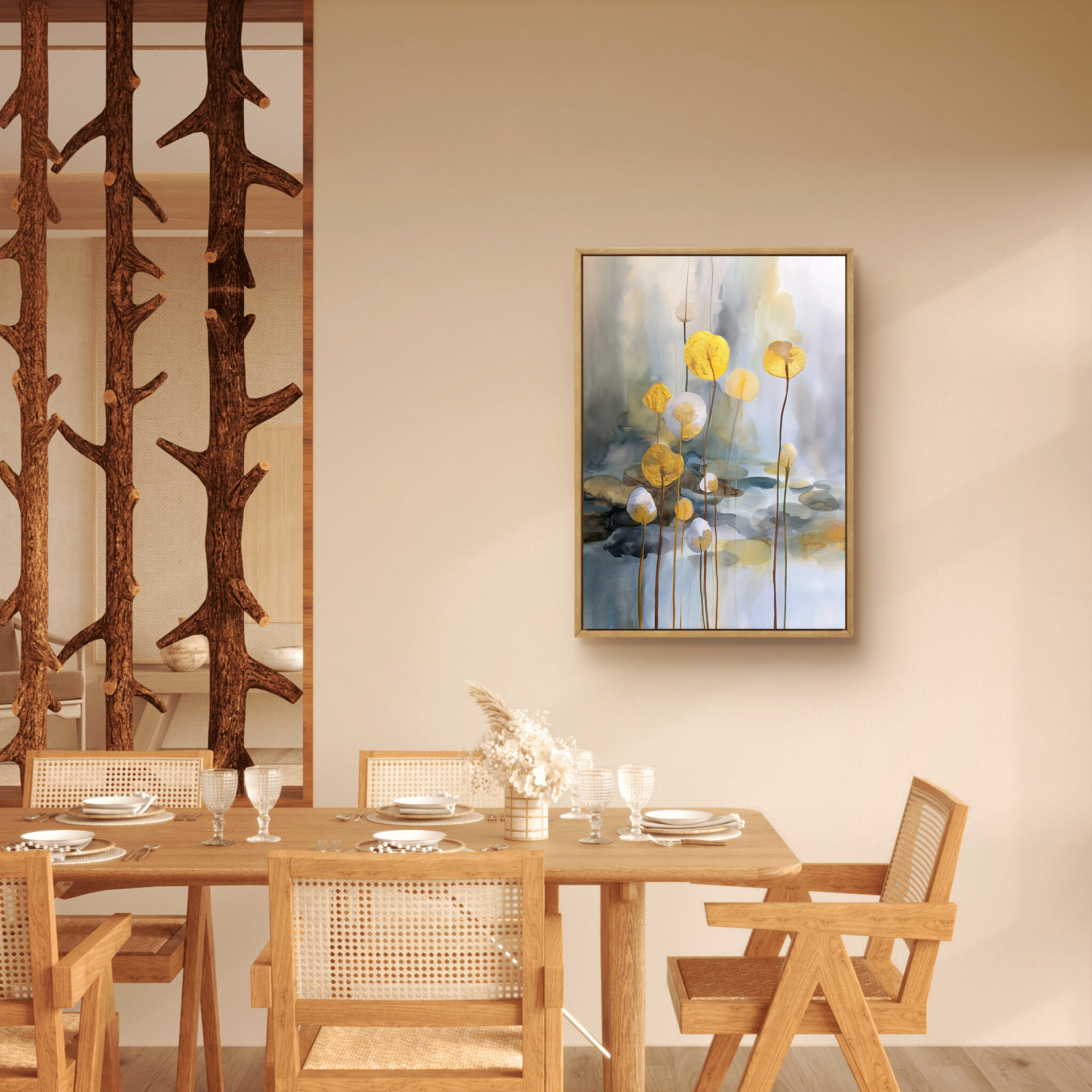 リビングでは壁面にやわらかなアクセントを加え、寝室では落ち着いた雰囲気を保ちながら金色の表情を添えます。玄関にも重たく見えにくく、第一印象を静かに整えます。余白を活かした金花の余白 フラワーアートです。