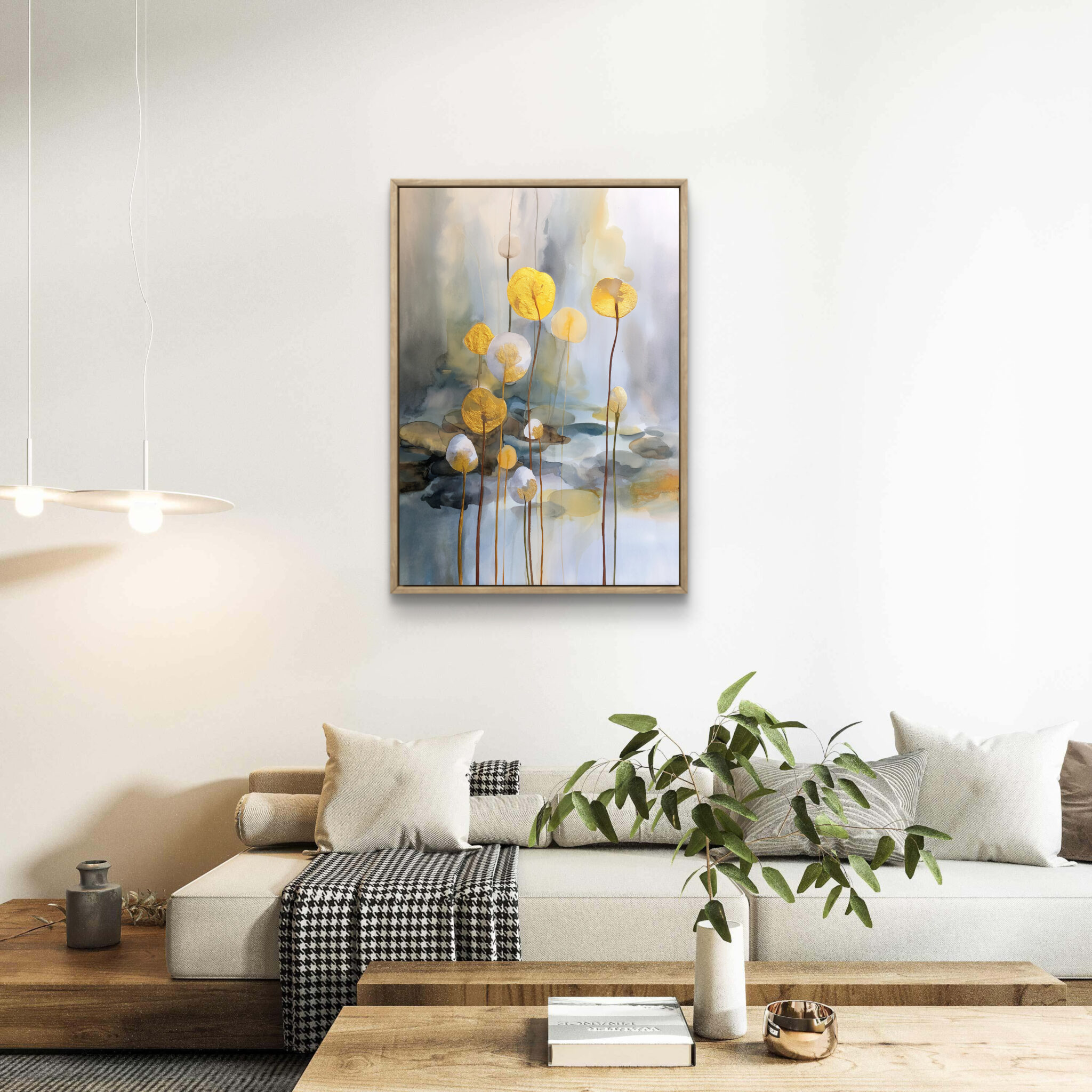 金花の余白 フラワーアートとして取り入れやすい、淡いにじみ背景に金色の丸い花形モチーフが浮かぶキャンバスアートです。やわらかな余白があり、リビングや寝室にもなじみます。