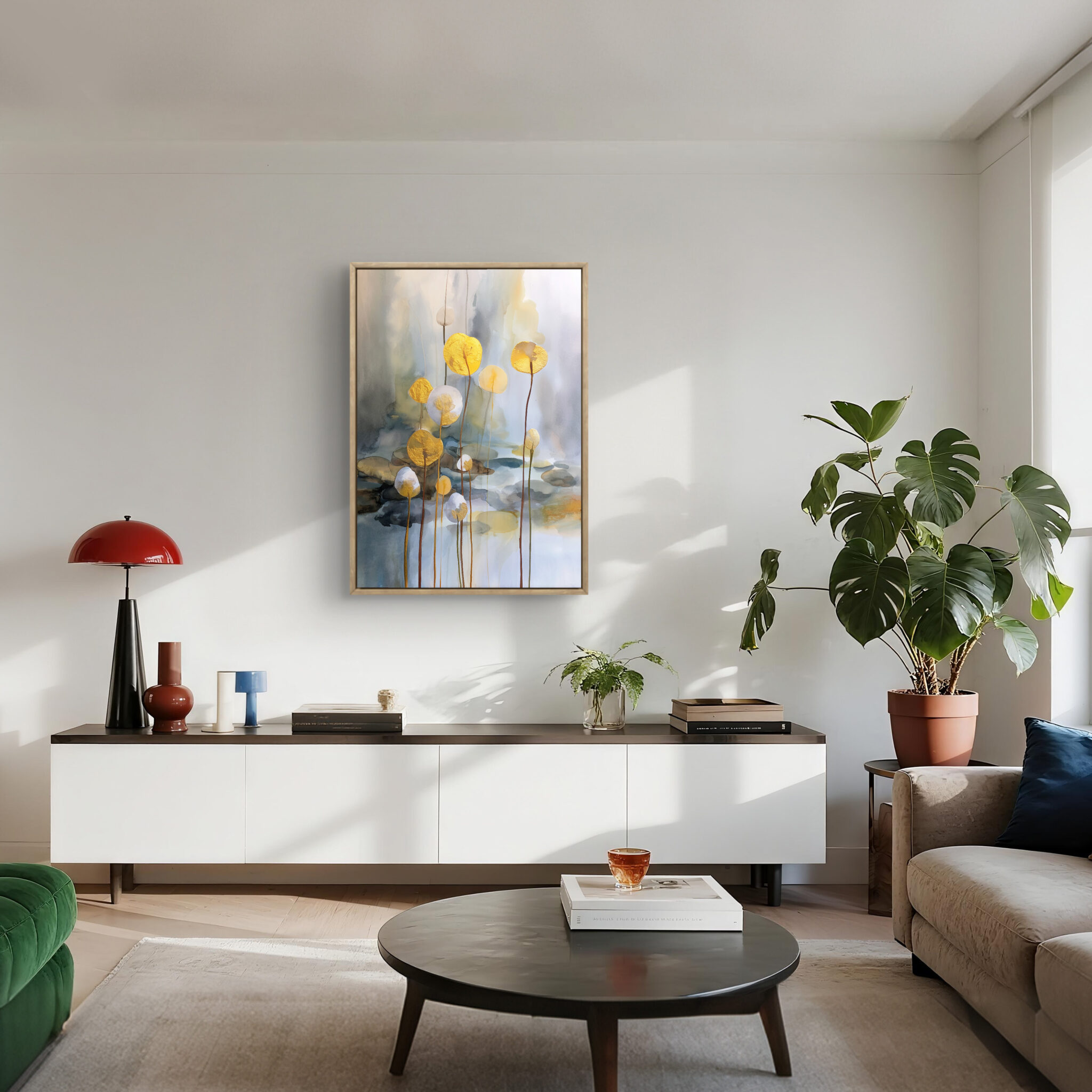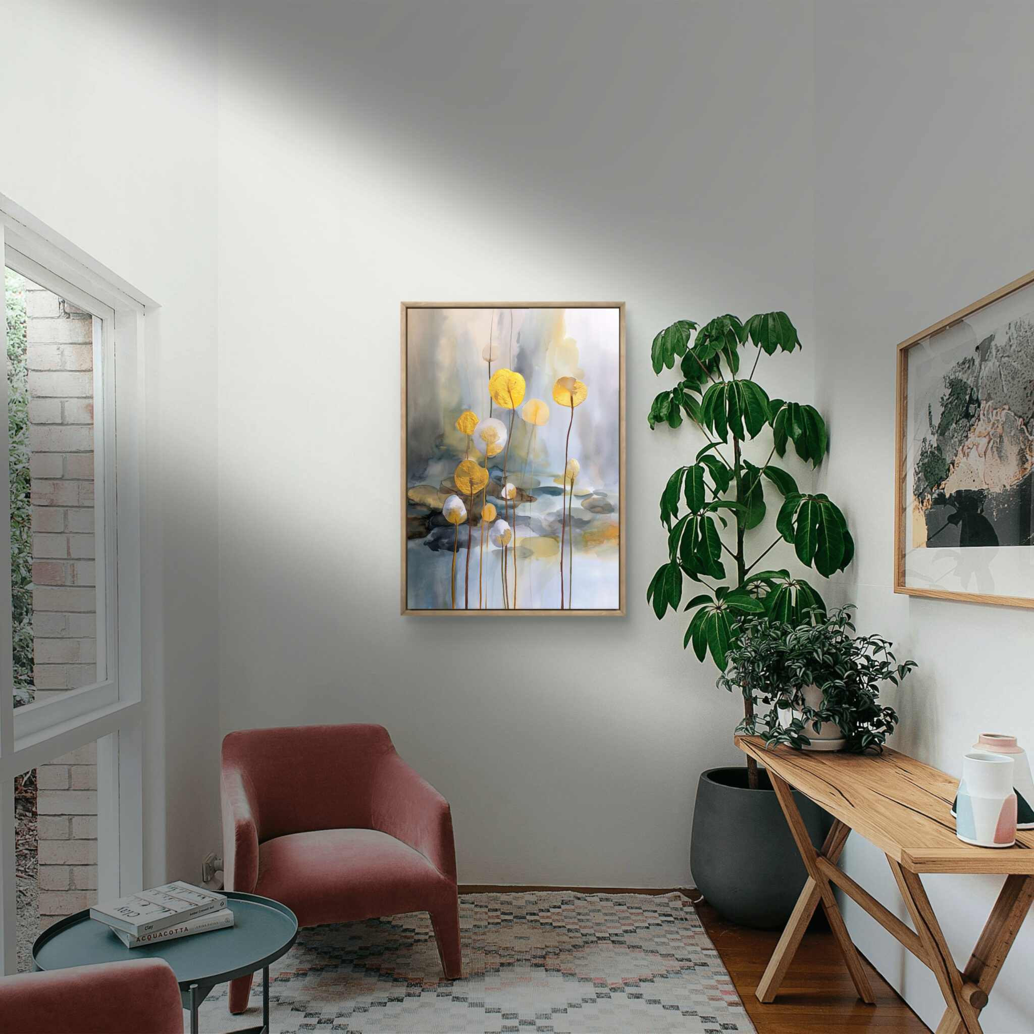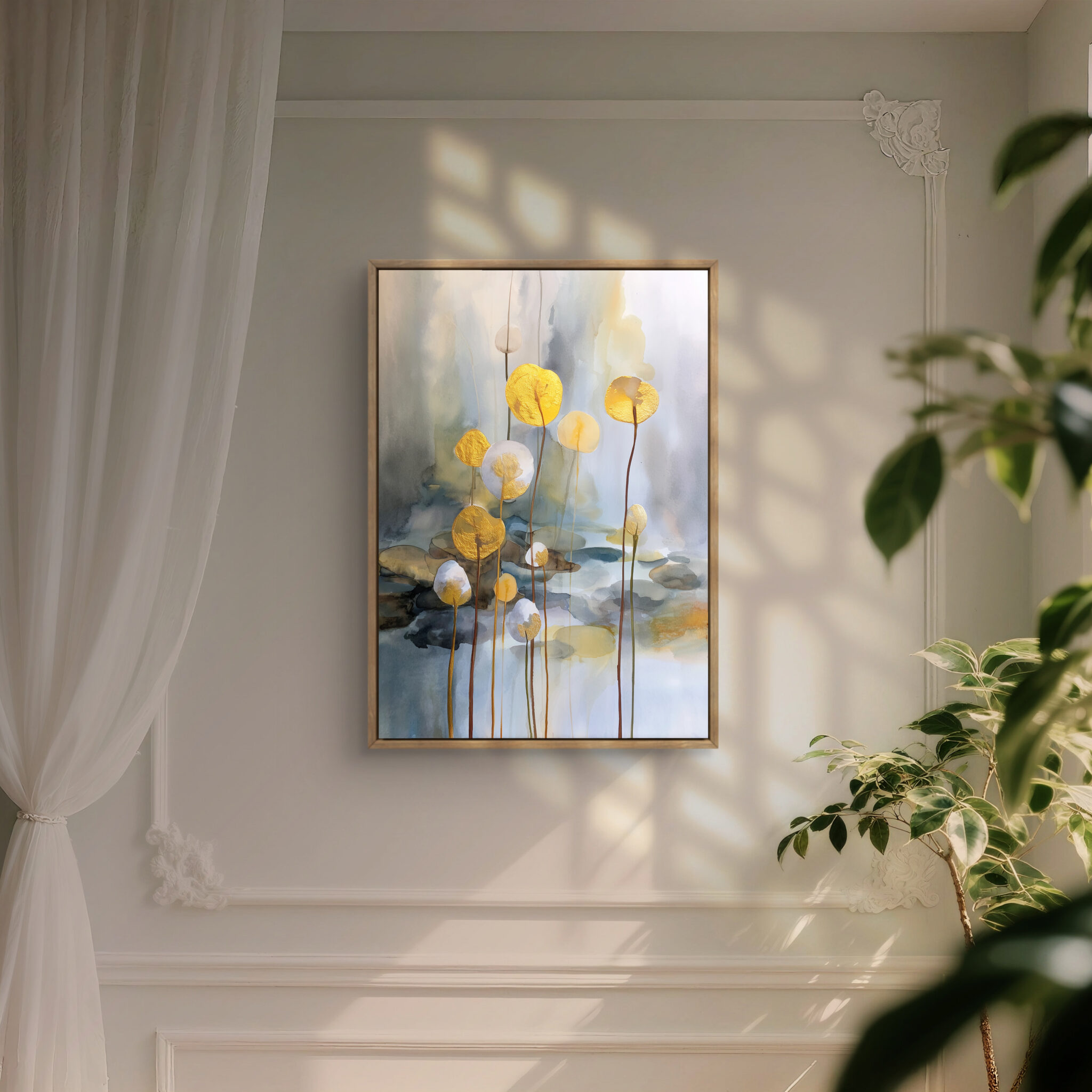 近くでは水彩調のにじみや金色の細い輪郭が見え、少し離れると淡い背景と花形が静かにまとまります。白を基調にしているため、明るい壁にも自然になじみます。空間に少し表情を加えたいときにも飾りやすい見え方です。