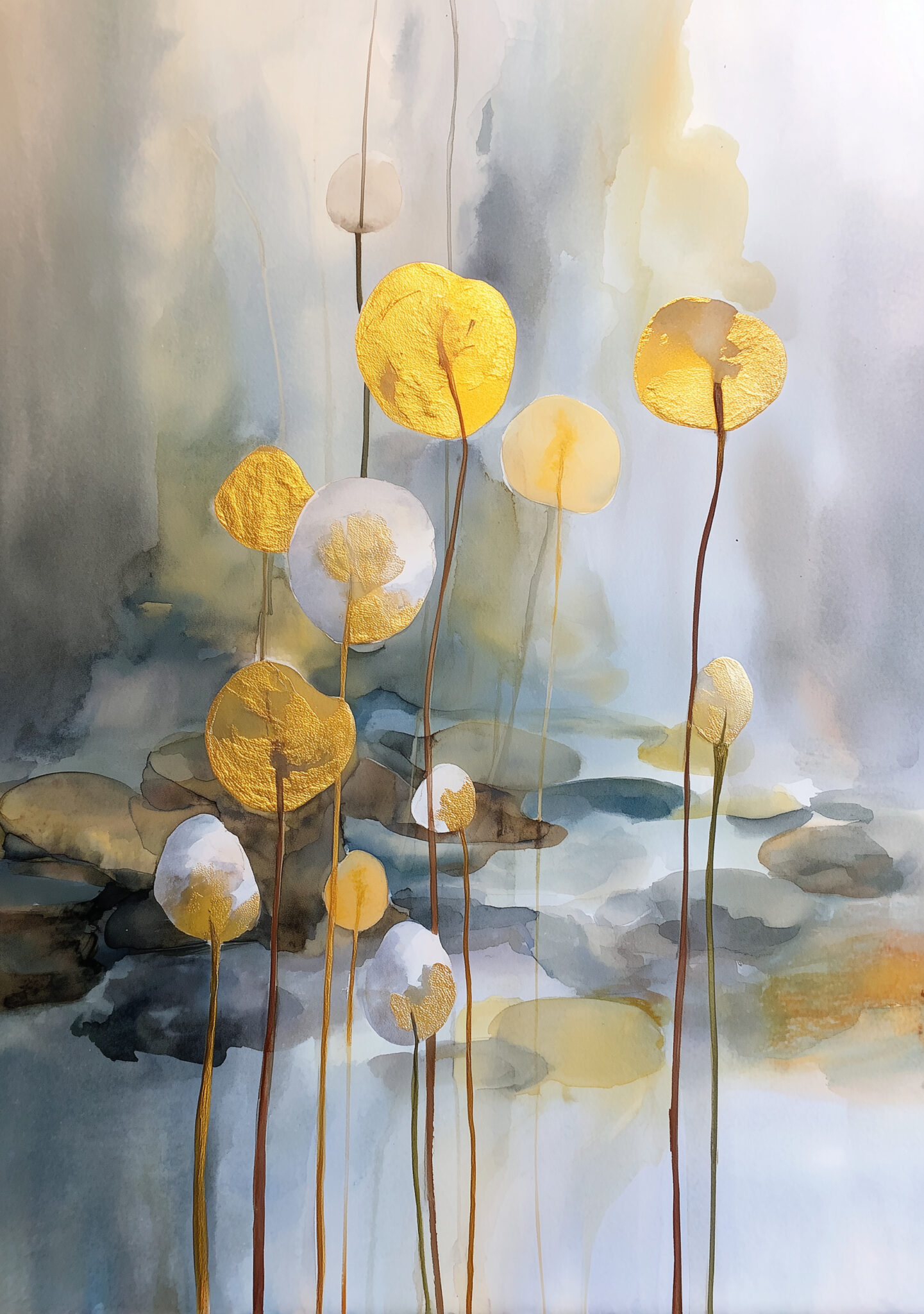 淡いブルーグレーや白のにじみ背景に、金色の丸い花形モチーフが浮かぶ一枚です。花の形は印象的ですが、余白が広いため壁面に掛けても重たく見えません。金花の余白 フラワーアートとして、控えめな華やぎを楽しめます。