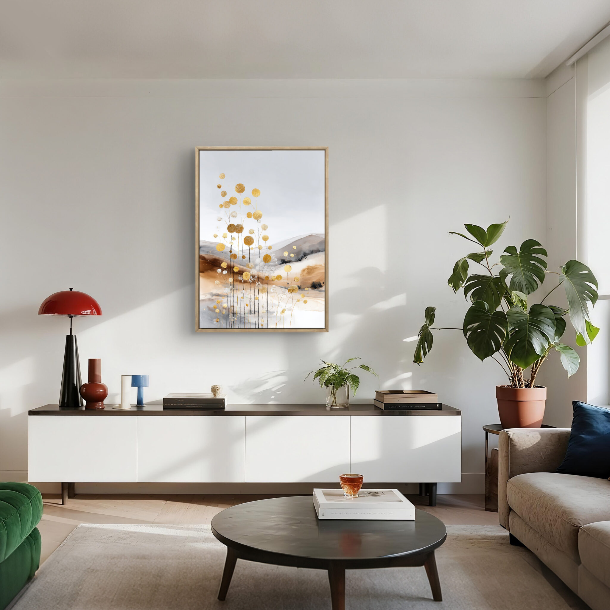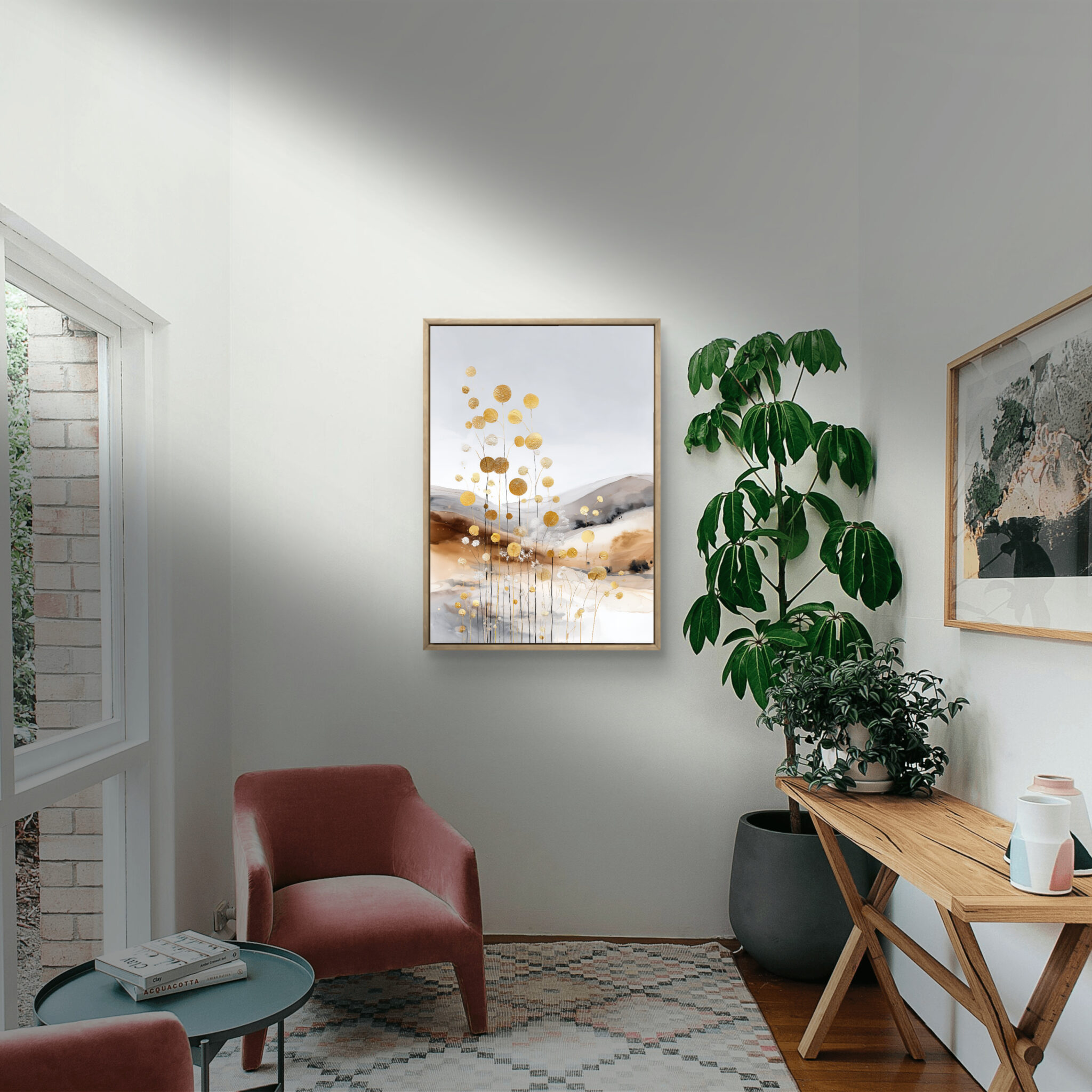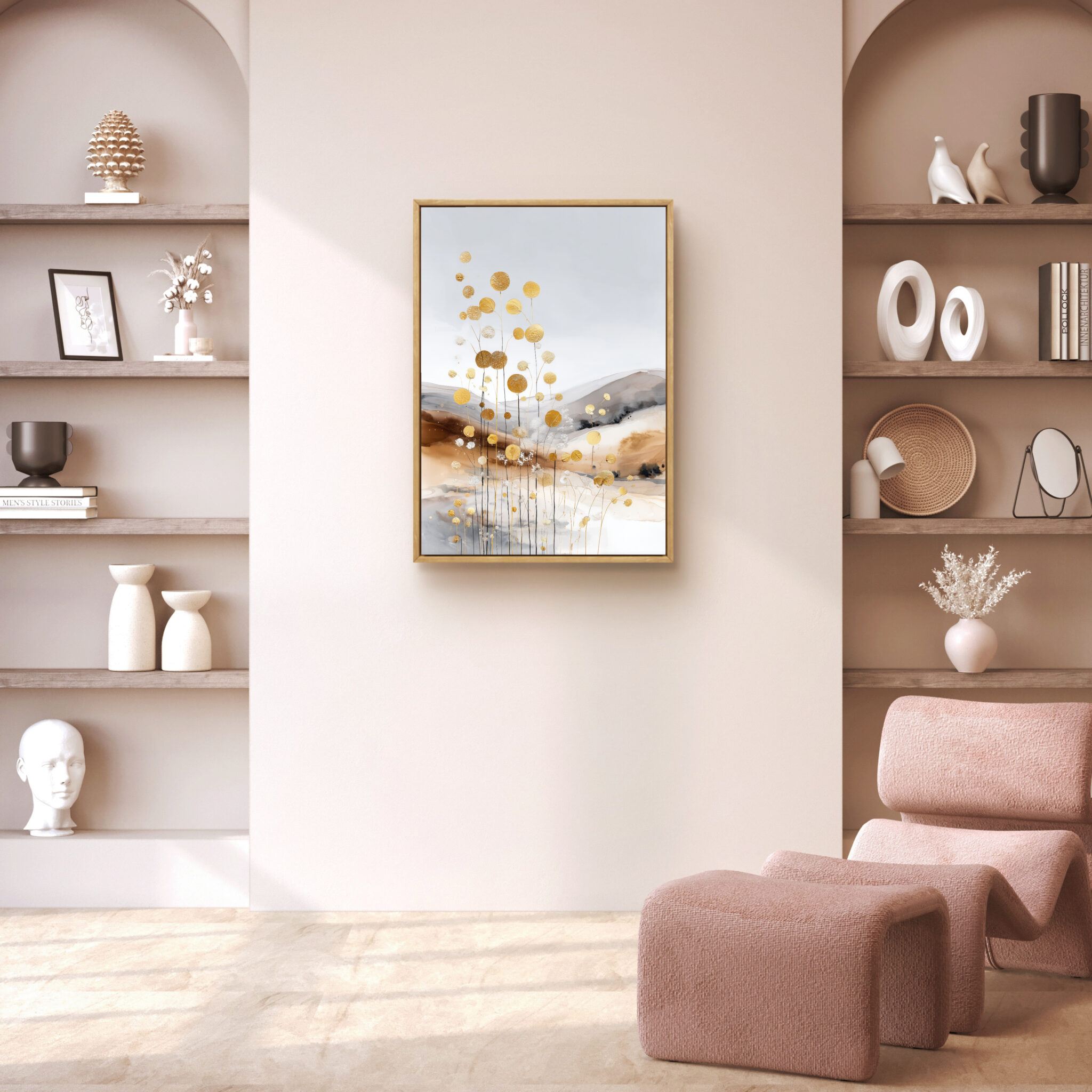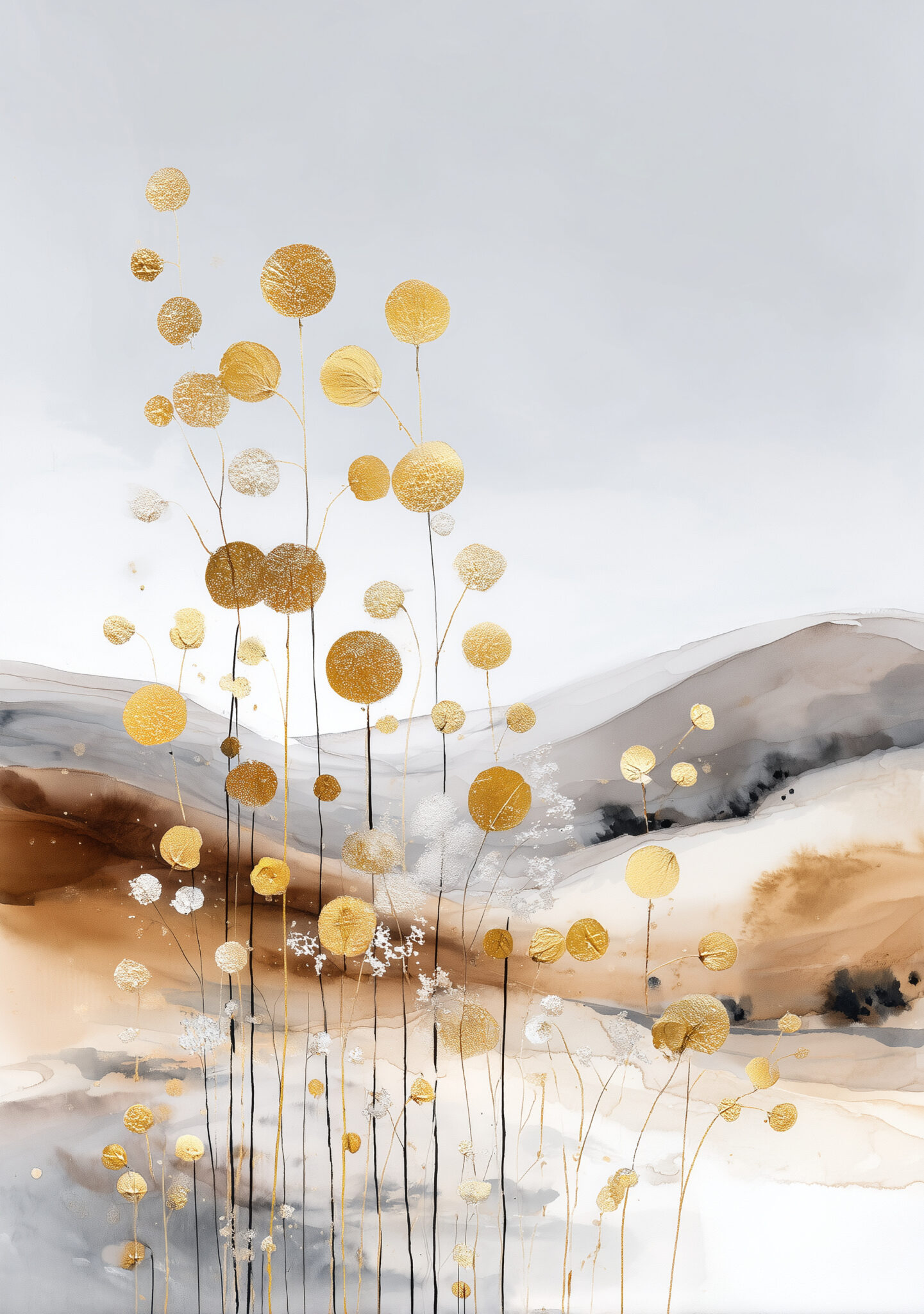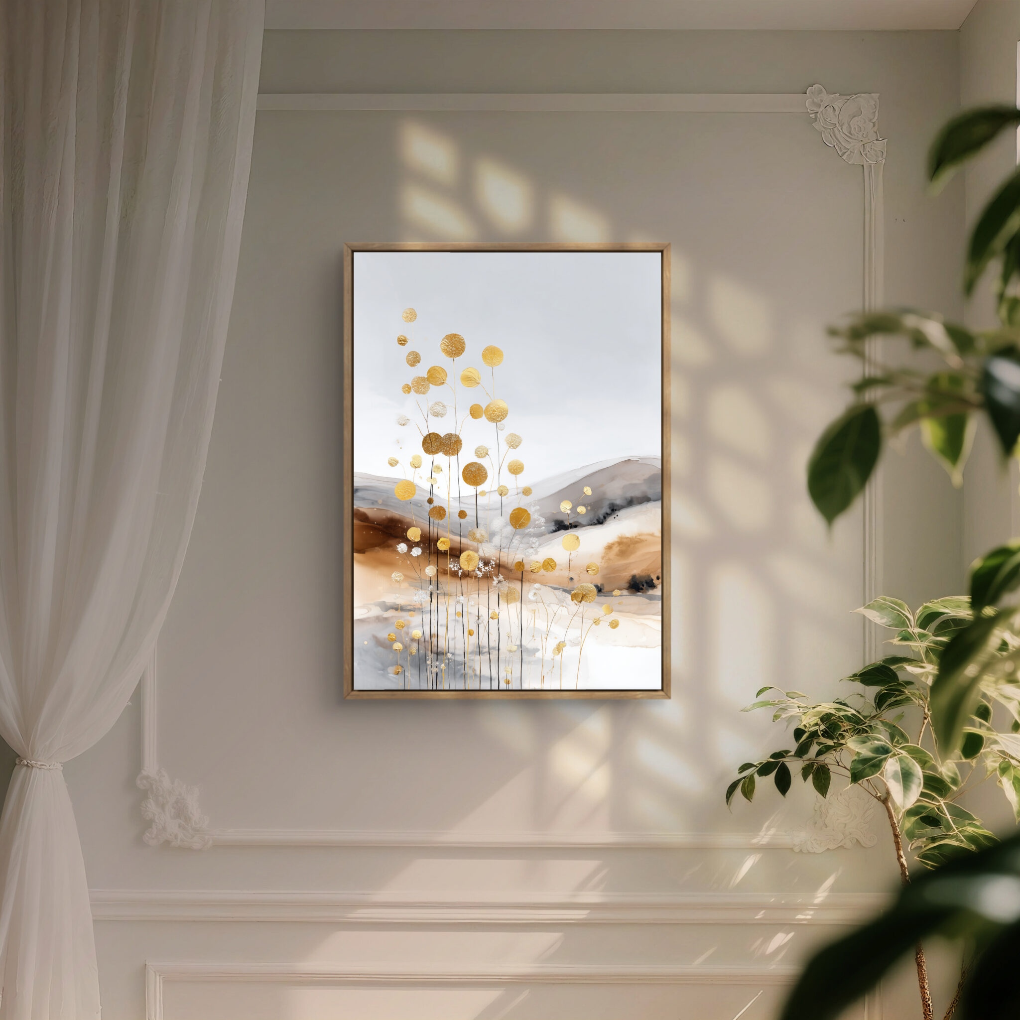 白い余白に、金色の点描と丸い花房のようなモチーフが伸びる一枚です。金色の要素は華やかですが、淡い背景が全体をやさしく整えます。金の花影 ボタニカルアートとして、軽やかな明るさを壁面に添えます。