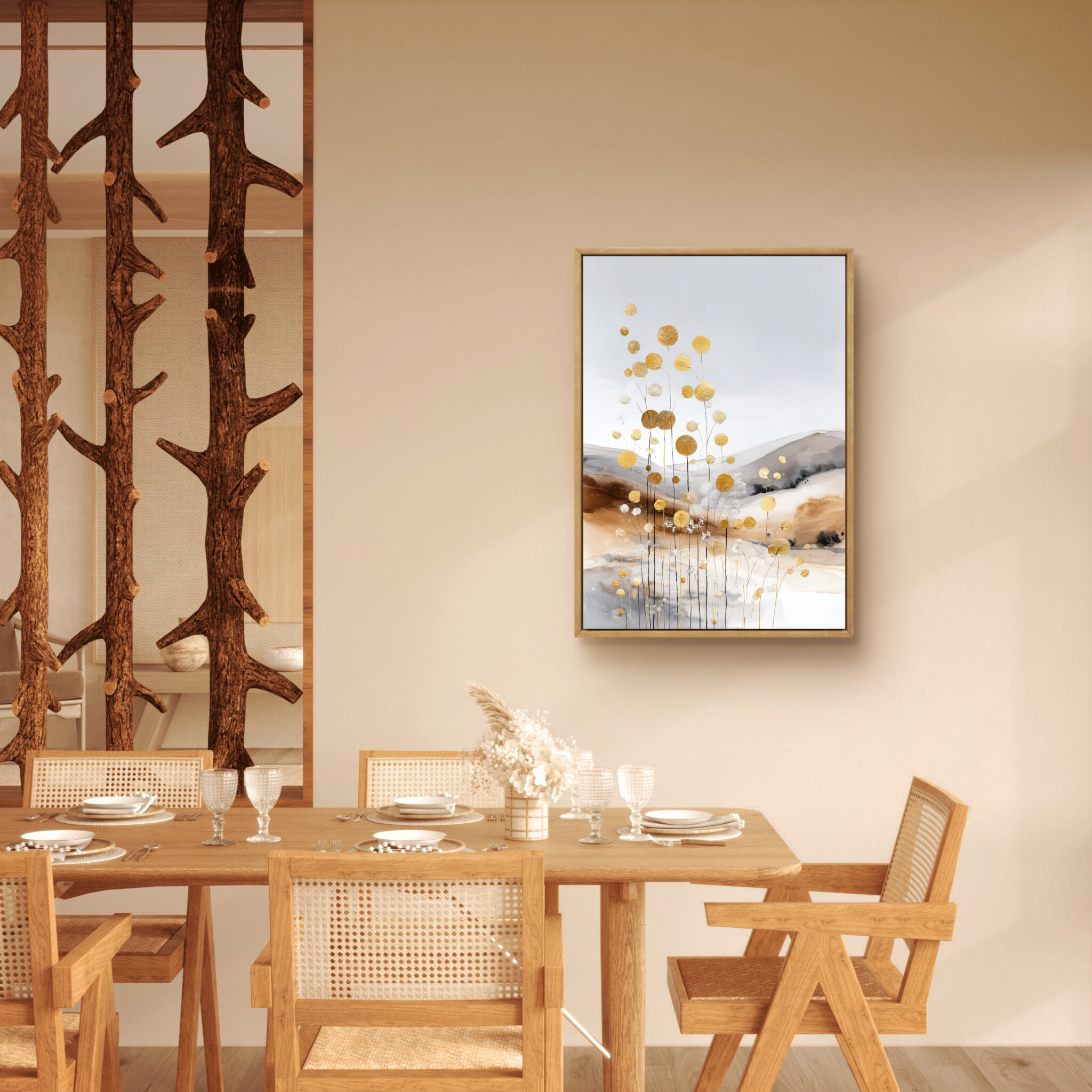白い余白に金色の点描と丸い花房が伸び、壁面にやわらかな華やぎを添えます。