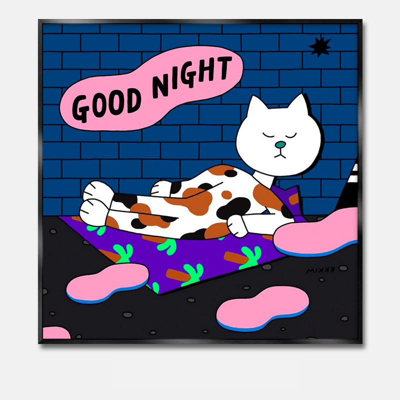 『グッドナイトキャット』は、カラフルで遊び心あふれる動物&ネイチャ アートポスターです。