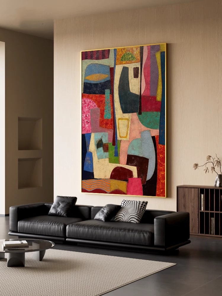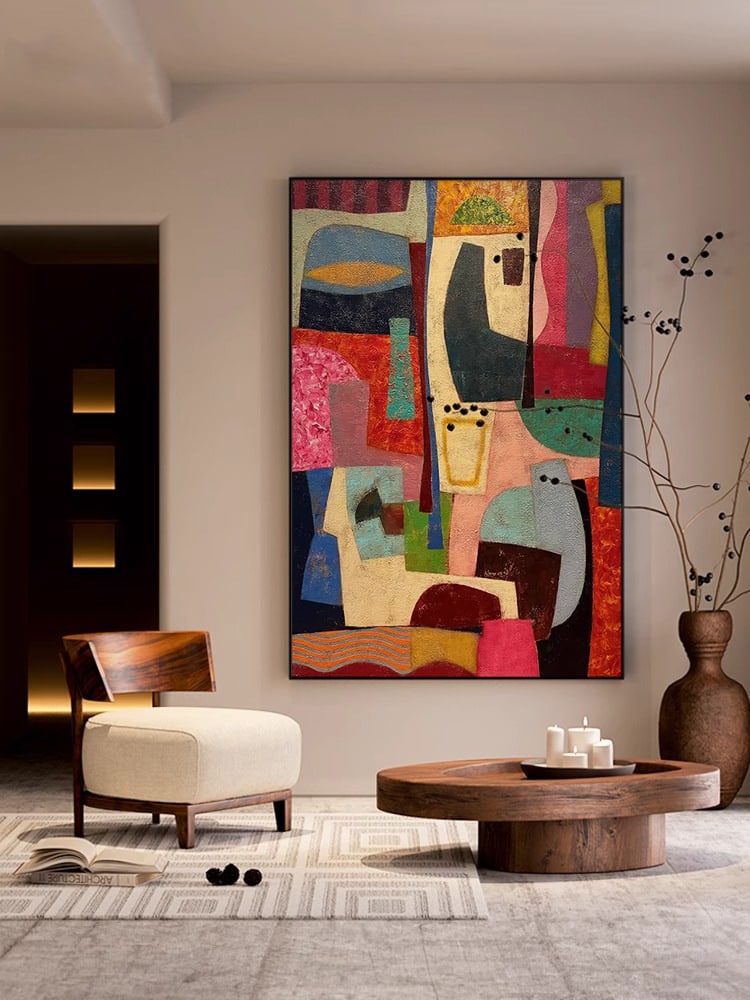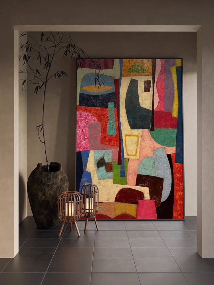 「グリーンプランツ」は、赤い背景と観葉植物のコントラストが美しい静物モダンアート。