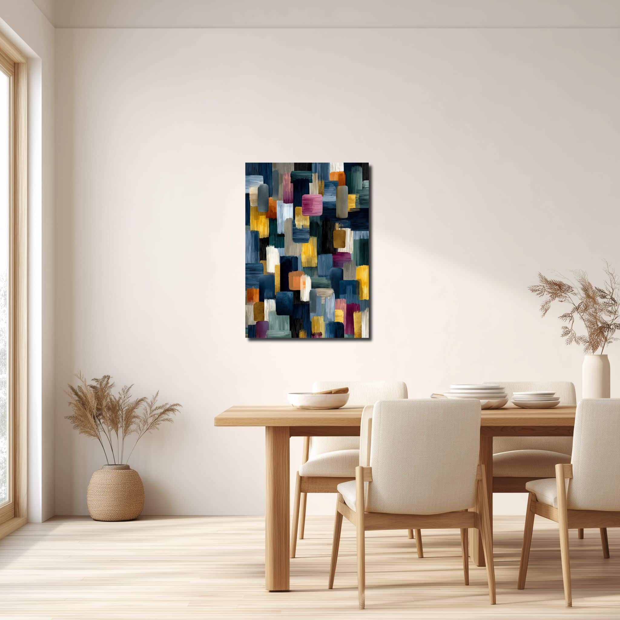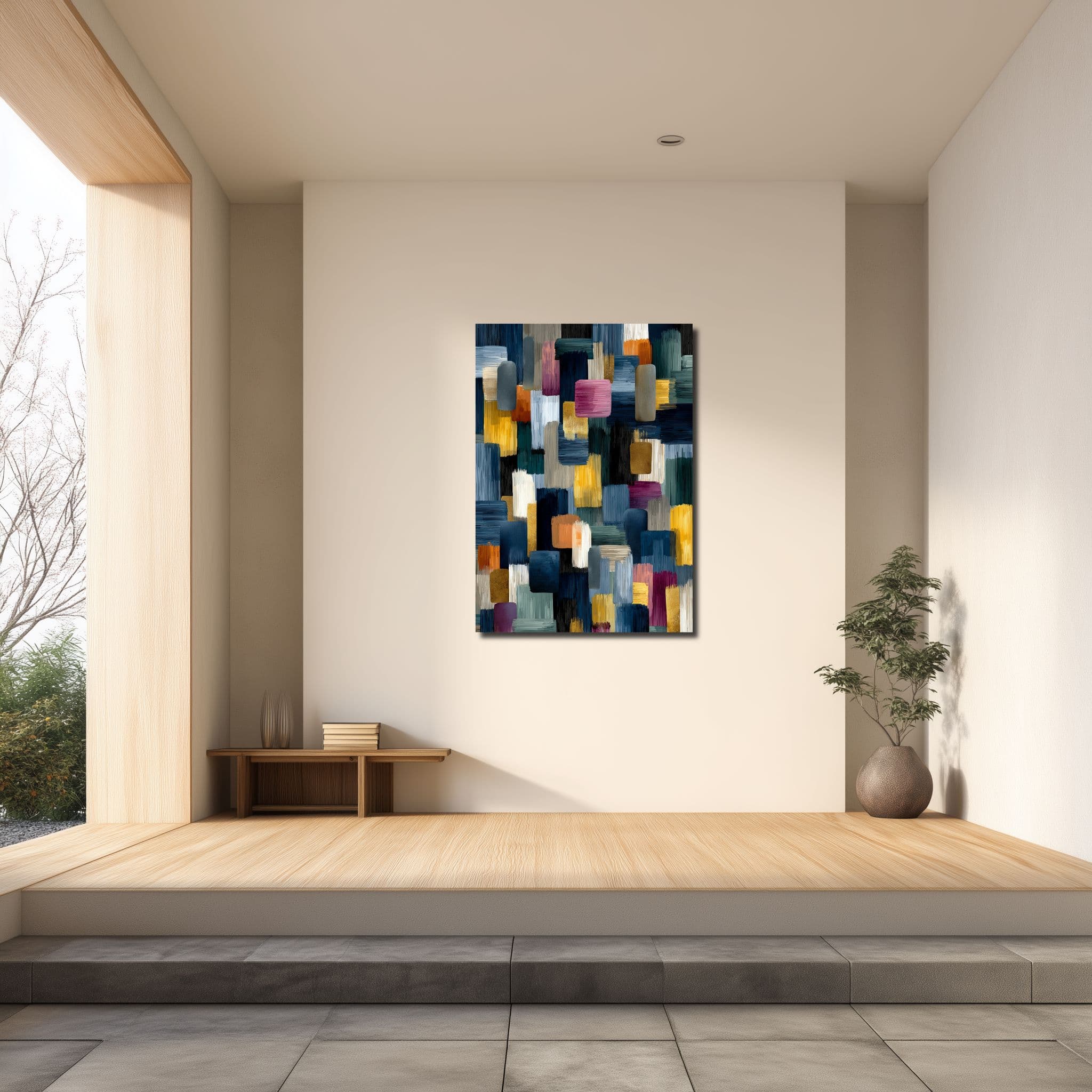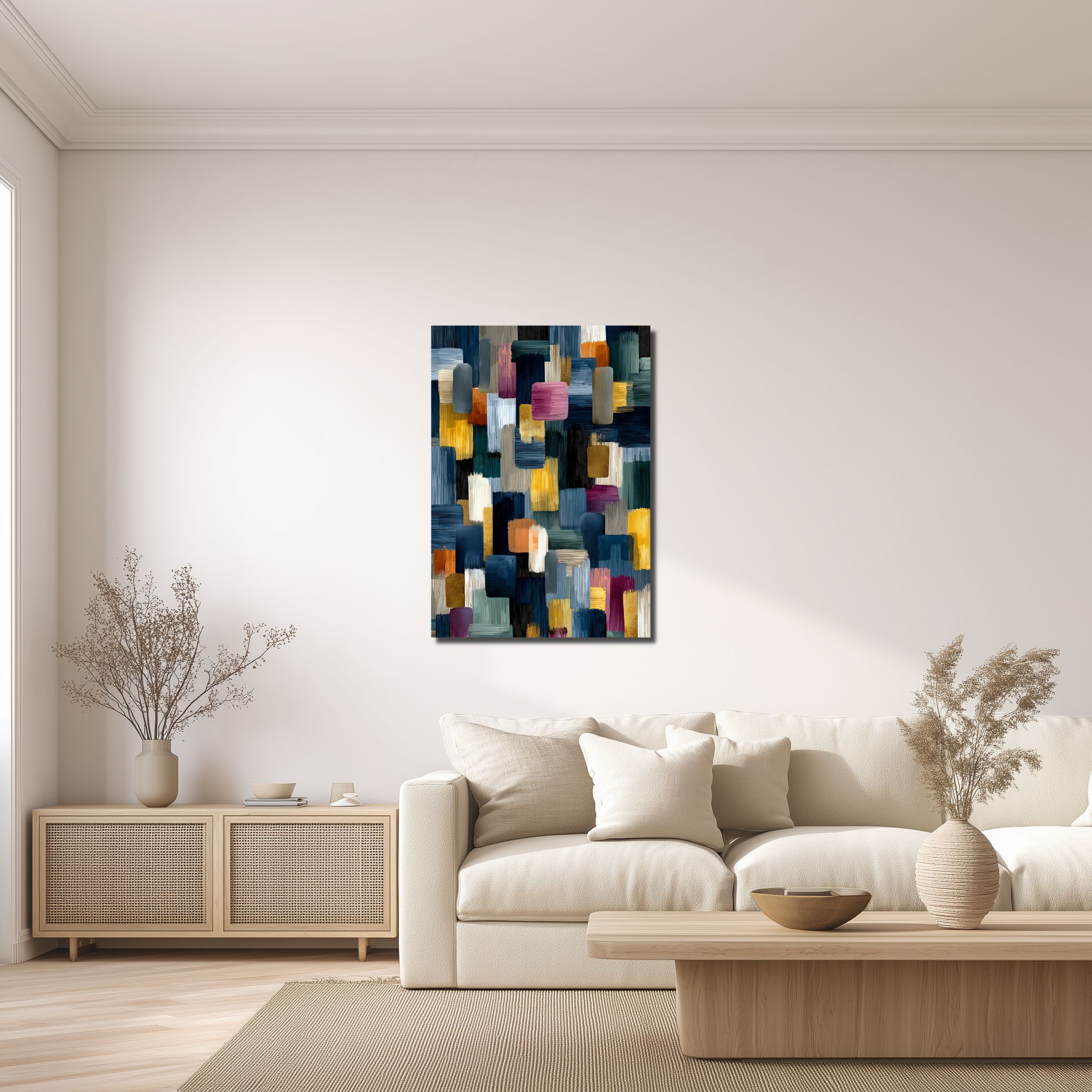 縦に連なる角丸の長方形と、ところどころに残る刷毛跡が目を引く一枚です。深い青を軸にしながら、マスタードやピンク、オレンジが小さく差し込まれ、整いすぎないリズムが生まれています。画面は密度がありますが重たくは見えず、ブルー 抽象アートらしい引き締まりの中に、少しだけ軽さも残ります。壁に掛けると、縦構図の流れがすっと立って見えます。