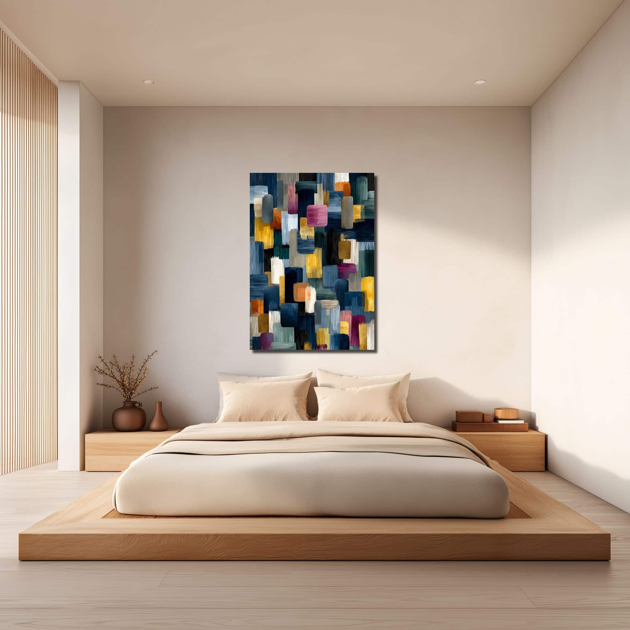 ブルー 抽象アートとして、ネイビーを軸にした縦の色面が壁をすっきり見せる一枚です。