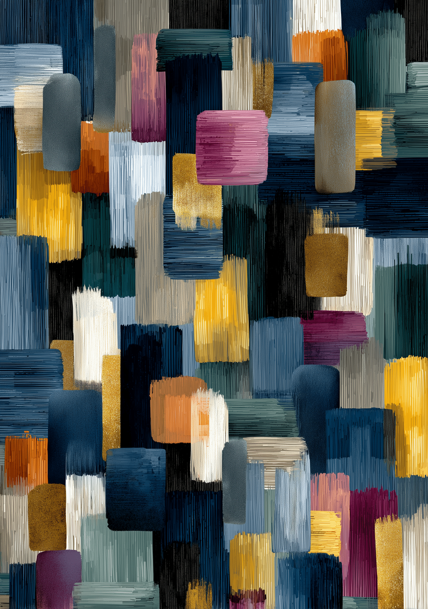 深いブルーのまとまりに、マスタードやピンクが小さく入るので、落ち着きの中に少しだけ動きが残ります。リビングでは白壁をほどよく締めたい場所に。玄関では縦の流れがきれいに見え、短い時間でも印象が残ります。木の色やブラック、グレー系の家具とも合わせやすく、主張しすぎずに壁へ収まります。